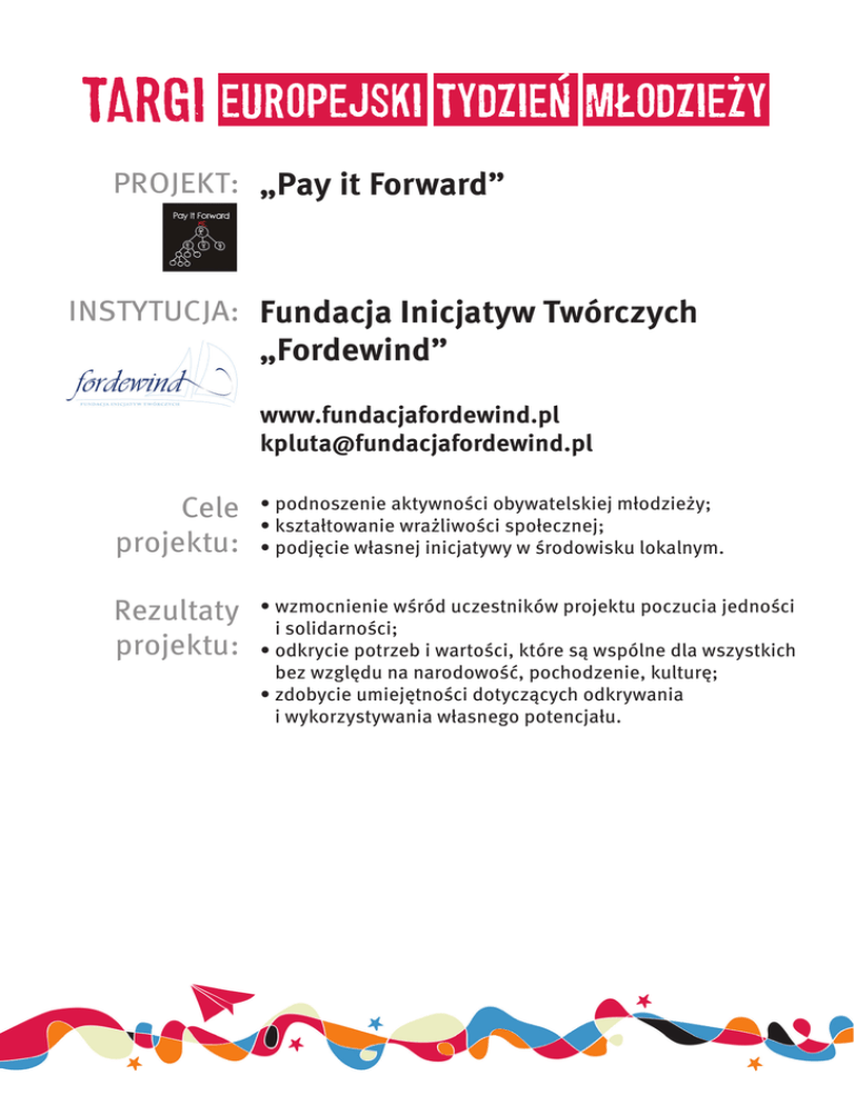 PROJEKT: „Pay it Forward” INSTYTUCJA: Fundacja Inicjatyw Twórczych „Fordewind” www.fundacjafordewind.pl [email protected] Cele projektu: • podnoszenie aktywności obywatelskiej młodzieży; • kształtowanie wrażliwości społecznej; • podjęcie własnej inicjatywy w środowisku lokalnym. Rezultaty projektu: • wzmocnienie wśród uczestników projektu poczucia jedności i solidarności; • odkrycie potrzeb i wartości, które są wspólne dla wszystkich bez względu na narodowość, pochodzenie, kulturę; • zdobycie umiejętności dotyczących odkrywania i wykorzystywania własnego potencjału.