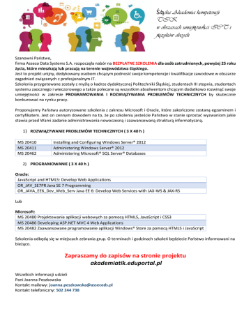 Śląska Akademia kompetencji TIK w obszarach umiejętności ICT i języków obcych Szanowni Państwo, firma Asseco Data Systems S.A. rozpoczęła nabór na BEZPŁATNE SZKOLENIA dla osób zatrudnionych, powyżej 25 roku życia, które mieszkają lub pracują na terenie województwa śląskiego. Jest to projekt unijny, dedykowany osobom chcącym podnosić swoje kompetencje i kwalifikacje zawodowe w obszarze zagadnień związanych z profesjonalnym IT. Szkolenia przygotowane zostały z myślą o kadrze dydaktycznej Politechniki Śląskiej, studentach III stopnia, studentach systemu zaocznego i wieczorowego a także polecane są wszystkim absolwentom chcącym dodatkowo rozwinąć swoje umiejętności w zakresie PROGRAMOWANIA I ROZWIĄZYWANIA PROBLEMÓW TECHNICZNYCH by skutecznie konkurować na rynku pracy. Proponujemy Państwu autoryzowane szkolenia z zakresu Microsoft i Oracle, które zakończone zostaną egzaminem i certyfikatem. Jest on cennym dowodem na to, że po szkoleniu jesteście Państwo w stanie sprostać wyzwaniom jakie stawia przed Wami zadanie administrowania nowoczesną i zaawansowaną strukturą informatyczną. 1) ROZWIĄZYWANIE PROBLEMÓW TECHNICZNYCH ( 3 X 40 h ) MS 20410 MS 20411 MS 20462 Installing and Configuring Windows Server® 2012 Administering Windows Server® 2012 Administering Microsoft® SQL Server® Databases 2) PROGRAMOWANIE ( 3 X 40 h ) Oracle: JavaScript and HTML5: Develop Web Applications OR_JAV_SE7PR Java SE 7 Programming OR_JAVA_EE6_Dev_Web_Serv Java EE 6: Develop Web Services with JAX-WS & JAX-RS Lub Microsoft: MS 20480 Projektowanie aplikacji webowych za pomocą HTML5, JavaScript i CSS3 MS 20486 Developing ASP.NET MVC 4 Web Applications MS 20482 Zaawansowane programowanie aplikacji Windows® Store za pomocą HTML5 i JavaScript Szkolenia odbędą się w miejscach zebrania grup. O terminach i godzinach szkoleń będziecie Państwo informowani na bieżąco. Zapraszamy do zapisów na stronie projektu akademiatik.eduportal.pl Wszelkich informacji udzieli Pani Joanna Peszkowska Kontakt mailowy: [email protected] Kontakt telefoniczny: 502 244 738