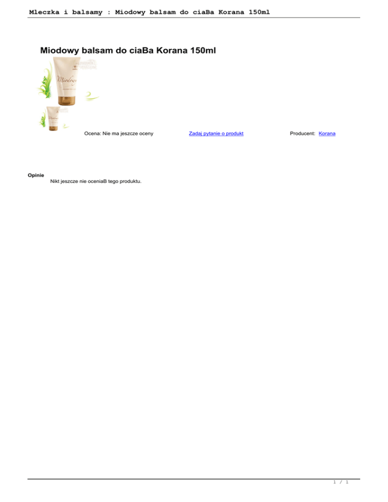Mleczka i balsamy : Miodowy balsam do ciaBa Korana 150ml Miodowy balsam do ciaBa Korana 150ml Ocena: Nie ma jeszcze oceny Zadaj pytanie o produkt Producent: Korana Opinie Nikt jeszcze nie oceniaB tego produktu. 1 / 1