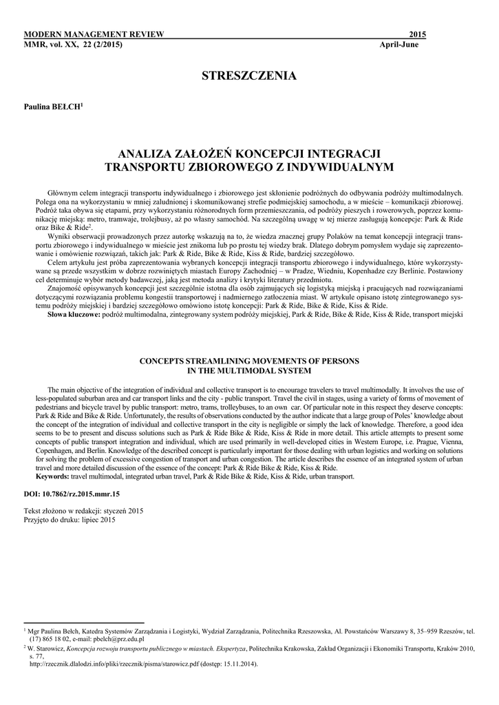 MODERN MANAGEMENT REVIEW MMR, vol. XX, 22 (2/2015) 2015 April-June STRESZCZENIA Paulina BEŁCH1 ANALIZA ZAŁOŻEŃ KONCEPCJI INTEGRACJI TRANSPORTU ZBIOROWEGO Z INDYWIDUALNYM Głównym celem integracji transportu indywidualnego i zbiorowego jest skłonienie podróżnych do odbywania podróży multimodalnych. Polega ona na wykorzystaniu w mniej zaludnionej i skomunikowanej strefie podmiejskiej samochodu, a w mieście – komunikacji zbiorowej. Podróż taka obywa się etapami, przy wykorzystaniu różnorodnych form przemieszczania, od podróży pieszych i rowerowych, poprzez komunikację miejską: metro, tramwaje, trolejbusy, aż po własny samochód. Na szczególną uwagę w tej mierze zasługują koncepcje: Park & Ride oraz Bike & Ride2. Wyniki obserwacji prowadzonych przez autorkę wskazują na to, że wiedza znacznej grupy Polaków na temat koncepcji integracji transportu zbiorowego i indywidualnego w mieście jest znikoma lub po prostu tej wiedzy brak. Dlatego dobrym pomysłem wydaje się zaprezentowanie i omówienie rozwiązań, takich jak: Park & Ride, Bike & Ride, Kiss & Ride, bardziej szczegółowo. Celem artykułu jest próba zaprezentowania wybranych koncepcji integracji transportu zbiorowego i indywidualnego, które wykorzystywane są przede wszystkim w dobrze rozwiniętych miastach Europy Zachodniej – w Pradze, Wiedniu, Kopenhadze czy Berlinie. Postawiony cel determinuje wybór metody badawczej, jaką jest metoda analizy i krytyki literatury przedmiotu. Znajomość opisywanych koncepcji jest szczególnie istotna dla osób zajmujących się logistyką miejską i pracujących nad rozwiązaniami dotyczącymi rozwiązania problemu kongestii transportowej i nadmiernego zatłoczenia miast. W artykule opisano istotę zintegrowanego systemu podróży miejskiej i bardziej szczegółowo omówiono istotę koncepcji: Park & Ride, Bike & Ride, Kiss & Ride. Słowa kluczowe: podróż multimodalna, zintegrowany system podróży miejskiej, Park & Ride, Bike & Ride, Kiss & Ride, transport miejski CONCEPTS STREAMLINING MOVEMENTS OF PERSONS IN THE MULTIMODAL SYSTEM The main objective of the integration of individual and collective transport is to encourage travelers to travel multimodally. It involves the use of less-populated suburban area and car transport links and the city - public transport. Travel the civil in stages, using a variety of forms of movement of pedestrians and bicycle travel by public transport: metro, trams, trolleybuses, to an own car. Of particular note in this respect they deserve concepts: Park & Ride and Bike & Ride. Unfortunately, the results of observations conducted by the author indicate that a large group of Poles’ knowledge about the concept of the integration of individual and collective transport in the city is negligible or simply the lack of knowledge. Therefore, a good idea seems to be to present and discuss solutions such as Park & Ride Bike & Ride, Kiss & Ride in more detail. This article attempts to present some concepts of public transport integration and individual, which are used primarily in well-developed cities in Western Europe, i.e. Prague, Vienna, Copenhagen, and Berlin. Knowledge of the described concept is particularly important for those dealing with urban logistics and working on solutions for solving the problem of excessive congestion of transport and urban congestion. The article describes the essence of an integrated system of urban travel and more detailed discussion of the essence of the concept: Park & Ride Bike & Ride, Kiss & Ride. Keywords: travel multimodal, integrated urban travel, Park & Ride Bike & Ride, Kiss & Ride, urban transport. DOI: 10.7862/rz.2015.mmr.15 Tekst złożono w redakcji: styczeń 2015 Przyjęto do druku: lipiec 2015 Mgr Paulina Bełch, Katedra Systemów Zarządzania i Logistyki, Wydział Zarządzania, Politechnika Rzeszowska, Al. Powstańców Warszawy 8, 35–959 Rzeszów, tel. (17) 865 18 02, e-mail: [email protected] 2 W. Starowicz, Koncepcja rozwoju transportu publicznego w miastach. Ekspertyza, Politechnika Krakowska, Zakład Organizacji i Ekonomiki Transportu, Kraków 2010, s. 77, http://rzecznik.dlalodzi.info/pliki/rzecznik/pisma/starowicz.pdf (dostęp: 15.11.2014). 1 Paweł DZIEKAŃSKI3 ŚRODOWISKO NATURALNE JAKO CZYNNIK KONKURENCYJNOŚCI REGIONÓW Polityka regionalna to koncepcja zakładająca realizację konkretnych działań wpływających na wielkość i tempo rozwoju regionalnego, a więc również na zmiany w strukturze przestrzennej gospodarki. Region ekonomiczny traktuje się więc jako system, w którym występują elementy (podmioty) o zróżnicowanym charakterze, pełniące różne funkcje i pozostające ze sobą w relacjach opierających się na sprzężeniach zwrotnych. Konkurencyjność regionów to ich zdolność do wzajemnego współzawodnictwa, rywalizacji na skalę krajową i międzynarodową. Jest to także zdolność adaptacji do ciągle zmieniających się warunków oraz utrzymania lub poprawy pozycji we współzawodnictwie między regionami. Jednym z istotnych czynników atrakcyjności regionu jest środowisko naturalne, czyli zespół elementów przyrodniczych, które są przedmiotem zainteresowania między innymi turysty. Celem opracowania jest przedstawienie środowiskowej konkurencyjności regionu i możliwości jej oceny za pomocą metod taksonomicznych. Obszar województwa świętokrzyskiego charakteryzuje się zróżnicowanym poziomem konkurencyjności środowiskowej. W najlepszej sytuacji znalazły się powiaty: kielecki, sandomierski, starachowicki i jędrzejowski. Najniższe wskaźniki konkurencyjności środowiskowej odnotowano w powiatach: pińczowskim, włoszczowskim oraz kazimierskim. Istotny wpływ na poziom środowiskowej konkurencyjności regionu miała ocena kondycji finansowej (gospodarki finansowej) jednostki. Konkurencyjność środowiskowa regionu przejawia się również w elementach społecznych, takich jak: walka z bezrobociem, podnoszenie poziomu edukacji e
