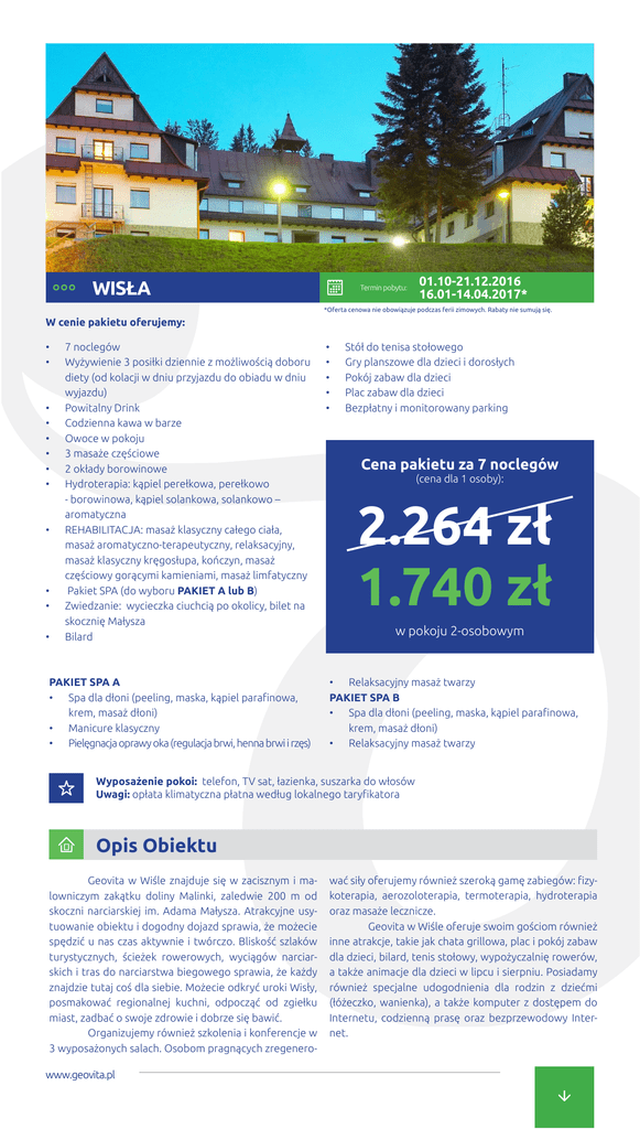 WISŁA Termin pobytu: 01.10-21.12.2016 16.01-14.04.2017* *Oferta cenowa nie obowiązuje podczas ferii zimowych. Rabaty nie sumują się. W cenie pakietu oferujemy: • • • • • • • • • • • • 7 noclegów Wyżywienie 3 posiłki dziennie z możliwością doboru diety (od kolacji w dniu przyjazdu do obiadu w dniu wyjazdu) Powitalny Drink Codzienna kawa w barze Owoce w pokoju 3 masaże częściowe 2 okłady borowinowe Hydroterapia: kąpiel perełkowa, perełkowo - borowinowa, kąpiel solankowa, solankowo – aromatyczna REHABILITACJA: masaż klasyczny całego ciała, masaż aromatyczno-terapeutyczny, relaksacyjny, masaż klasyczny kręgosłupa, kończyn, masaż częściowy gorącymi kamieniami, masaż limfatyczny Pakiet SPA (do wyboru PAKIET A lub B) Zwiedzanie: wycieczka ciuchcią po okolicy, bilet na skocznię Małysza Bilard PAKIET SPA A • Spa dla dłoni (peeling, maska, kąpiel parafinowa, krem, masaż dłoni) • Manicure klasyczny • Pielęgnacja oprawy oka (regulacja brwi, henna brwi i rzęs) • • • • • Stół do tenisa stołowego Gry planszowe dla dzieci i dorosłych Pokój zabaw dla dzieci Plac zabaw dla dzieci Bezpłatny i monitorowany parking Cena pakietu za 7 noclegów (cena dla 1 osoby): 2.264 zł 1.740 zł w pokoju 2-osobowym • Relaksacyjny masaż twarzy PAKIET SPA B • Spa dla dłoni (peeling, maska, kąpiel parafinowa, krem, masaż dłoni) • Relaksacyjny masaż twarzy Wyposażenie pokoi: telefon, TV sat, łazienka, suszarka do włosów Uwagi: opłata klimatyczna płatna według lokalnego taryfikatora Opis Obiektu Geovita w Wiśle znajduje się w zacisznym i malowniczym zakątku doliny Malinki, zaledwie 200 m od skoczni narciarskiej im. Adama Małysza. Atrakcyjne usytuowanie obiektu i dogodny dojazd sprawia, że możecie spędzić u nas czas aktywnie i twórczo. Bliskość szlaków turystycznych, ścieżek rowerowych, wyciągów narciarskich i tras do narciarstwa biegowego sprawia, że każdy znajdzie tutaj coś dla siebie. Możecie odkryć uroki Wisły, posmakować regionalnej kuchni, odpocząć od zgiełku miast, zadbać o swoje zdrowie i dobrze się bawić. Organizujemy również szkolenia i konferencje w 3 wyposażonych salach. Osobom pragnących zregenerowww.geovita.pl wać siły oferujemy również szeroką gamę zabiegów: fizykoterapia, aerozoloterapia, termoterapia, hydroterapia oraz masaże lecznicze. Geovita w Wiśle oferuje swoim gościom również inne atrakcje, takie jak chata grillowa, plac i pokój zabaw dla dzieci, bilard, tenis stołowy, wypożyczalnię rowerów, a także animacje dla dzieci w lipcu i sierpniu. Posiadamy również specjalne udogodnienia dla rodzin z dziećmi (łóżeczko, wanienka), a także komputer z dostępem do Internetu, codzienną prasę oraz bezprzewodowy Internet.
