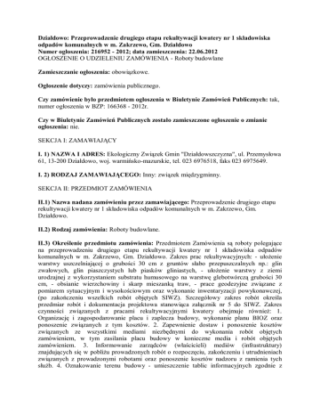 Działdowo: Przeprowadzenie drugiego etapu rekultywacji kwatery nr 1 składowiska odpadów komunalnych w m. Zakrzewo, Gm. Działdowo Numer ogłoszenia: 216952 - 2012; data zamieszczenia: 22.06.2012 OGŁOSZENIE O UDZIELENIU ZAMÓWIENIA - Roboty budowlane Zamieszczanie ogłoszenia: obowiązkowe. Ogłoszenie dotyczy: zamówienia publicznego. Czy zamówienie było przedmiotem ogłoszenia w Biuletynie Zamówień Publicznych: tak, numer ogłoszenia w BZP: 166368 - 2012r. Czy w Biuletynie Zamówień Publicznych zostało zamieszczone ogłoszenie o zmianie ogłoszenia: nie. SEKCJA I: ZAMAWIAJĄCY I. 1) NAZWA I ADRES: Ekologiczny Związek Gmin "Działdowszczyzna", ul. Przemysłowa 61, 13-200 Działdowo, woj. warmińsko-mazurskie, tel. 023 6976518, faks 023 6975649. I. 2) RODZAJ ZAMAWIAJĄCEGO: Inny: związek międzygminny. SEKCJA II: PRZEDMIOT ZAMÓWIENIA II.1) Nazwa nadana zamówieniu przez zamawiającego: Przeprowadzenie drugiego etapu rekultywacji kwatery nr 1 składowiska odpadów komunalnych w m. Zakrzewo, Gm. Działdowo. II.2) Rodzaj zamówienia: Roboty budowlane. II.3) Określenie przedmiotu zamówienia: Przedmiotem Zamówienia są roboty polegające na przeprowadzeniu drugiego etapu rekultywacji kwatery nr 1 składowiska odpadów komunalnych w m. Zakrzewo, Gm. Działdowo. Zakres prac rekultywacyjnych: - ułożenie warstwy uszczelniającej o grubości 30 cm z gruntów słabo przepuszczalnych np.: glin zwałowych, glin piaszczystych lub piasków gliniastych, - ułożenie warstwy z ziemi urodzajnej z wykorzystaniem substratu humusowego na warstwę glebotwórczą grubości 30 cm, - obsianie wierzchowiny i skarp mieszanką traw, - prace geodezyjne związane z pomiarem sytuacyjnym i wysokościowym oraz wykonanie inwentaryzacji powykonawczej, (po zakończeniu wszelkich robót objętych SIWZ). Szczegółowy zakres robót określa przedmiar robót i dokumentacja projektowa stanowiąca załącznik nr 5 do SIWZ. Zakres czynności związanych z pracami rekultywacyjnymi kwatery obejmuje również: 1. Organizację i zagospodarowanie placu i zaplecza budowy, wykonanie planu BIOZ oraz ponoszenie związanych z tym kosztów. 2. Zapewnienie dostaw i ponoszenie kosztów związanych ze wszystkimi mediami niezbędnymi do wykonania robót objętych zamówieniem, w tym zasilania placu budowy w konieczne media i robót objętych zamówieniem. 3. Informowanie zarządców (właścicieli) mediów (infrastruktury) znajdujących się w pobliżu prowadzonych robót o rozpoczęciu, zakończeniu i utrudnieniach związanych z prowadzonymi robotami oraz ponoszenie kosztów nadzoru z ramienia tych służb. 4. Oznakowanie terenu budowy - umieszczenie tablic informacyjnych zgodnie z przepisami ustawy prawo budowlane. 5. Zapewnienie bieżącej obsługi geodezyjnej wraz z pomiarem sytuacyjno - wysokościowym oraz wykonanie inwentaryzacji powykonawczej.. II.4) Wspólny Słownik Zamówień (CPV): 45.11.23.30-7. SEKCJA III: PROCEDURA III.1) TRYB UDZIELENIA ZAMÓWIENIA: Przetarg nieograniczony III.2) INFORMACJE ADMINISTRACYJNE • Zamówienie dotyczy projektu/programu finansowanego ze środków Unii Europejskiej: nie SEKCJA IV: UDZIELENIE ZAMÓWIENIA IV.1) DATA UDZIELENIA ZAMÓWIENIA: 20.06.2012. IV.2) LICZBA OTRZYMANYCH OFERT: 7. IV.3) LICZBA ODRZUCONYCH OFERT: 0. IV.4) NAZWA I ADRES WYKONAWCY, KTÓREMU UDZIELONO ZAMÓWIENIA: • Przedsiębiorstwo Budowlano-Kanalizacyjne EKOLOGIA 2, ul. Letnia 32, 87-800 Włocławek, kraj/woj. kujawsko-pomorskie. IV.5) Szacunkowa wartość zamówienia (bez VAT): 405523,03 PLN. IV.6) INFORMACJA O CENIE WYBRANEJ OFERTY ORAZ O OFERTACH Z NAJNIŻSZĄ I NAJWYŻSZĄ CENĄ • • • Cena wybranej oferty: 146400,00 Oferta z najniższą ceną: 146400,00 / Oferta z najwyższą ceną: 546603,96 Waluta: PLN.