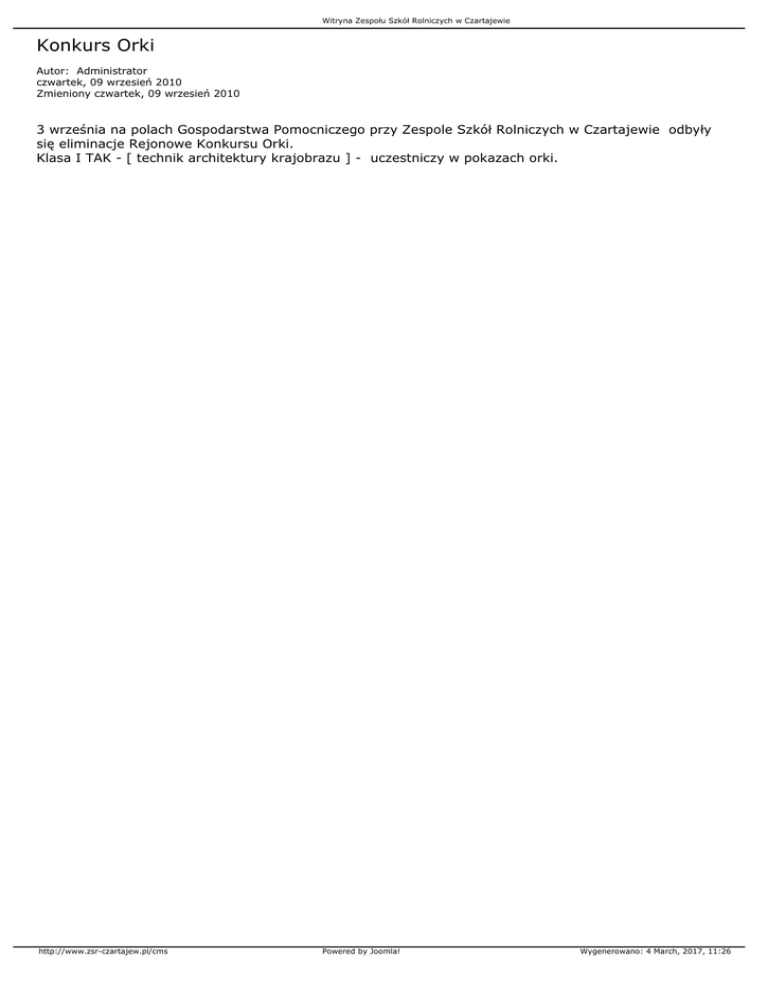Witryna Zespołu Szkół Rolniczych w Czartajewie Konkurs Orki Autor: Administrator czwartek, 09 wrzesień 2010 Zmieniony czwartek, 09 wrzesień 2010 3 września na polach Gospodarstwa Pomocniczego przy Zespole Szkół Rolniczych w Czartajewie odbyły się eliminacje Rejonowe Konkursu Orki. Klasa I TAK - [ technik architektury krajobrazu ] - uczestniczy w pokazach orki. http://www.zsr-czartajew.pl/cms Powered by Joomla! Wygenerowano: 4 March, 2017, 11:26