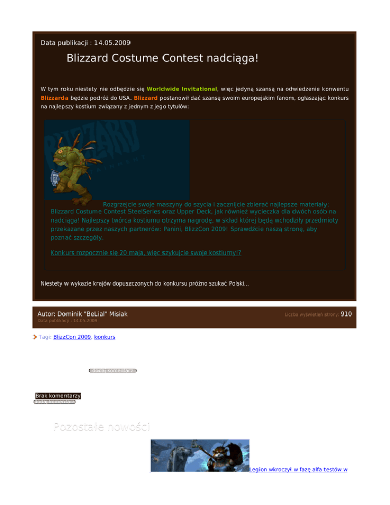 Data publikacji : 14.05.2009 Blizzard Costume Contest nadciąga! W tym roku niestety nie odbędzie się Worldwide Invitational, więc jedyną szansą na odwiedzenie konwentu Blizzarda będzie podróż do USA. Blizzard postanowił dać szansę swoim europejskim fanom, ogłaszając konkurs na najlepszy kostium związany z jednym z jego tytułów: Rozgrzejcie swoje maszyny do szycia i zacznijcie zbierać najlepsze materiały; Blizzard Costume Contest SteelSeries oraz Upper Deck, jak również wycieczka dla dwóch osób na nadciąga! Najlepszy twórca kostiumu otrzyma nagrodę, w skład której będą wchodziły przedmioty przekazane przez naszych partnerów: Panini, BlizzCon 2009! Sprawdźcie naszą stronę, aby poznać szczegóły. Konkurs rozpocznie się 20 maja, więc szykujcie swoje kostiumy!? Niestety w wykazie krajów dopuszczonych do konkursu próżno szukać Polski... Autor: Dominik "BeLial" Misiak Liczba wyświetleń strony: 910 Data publikacji : 14.05.2009 Tagi: BlizzCon 2009, konkurs Komentarz (0) dodaj komentarz Brak komentarzy dodaj komentarz Pozostałe nowości Zapowiedź zmian w klasach - Mnich Legion wkroczył w fazę alfa testów w czasie których dostępna jest póki co jedynie lokacja startowa łowców demonów, a my przyglądamy się temu, jakich zmian doczeka się klasa, która stosunkowo niedawno pojawiła się w World of Warcraft. Oto co na najnowszy dodatek Blizzard przygotował dla mnichów.Data publikacji: 24.11.20150 Zapowiedź zmian w klasach - Wojownik Po krótkiej przerwie wracamy z tłumaczeniami blogów poświęconych zmianom, jakie pojawią się w klasach w nadchodzącym dodatku do World of Warcraft. Oto czego powinni spodziewać się wojownicy z Azeroth w LegionieData publikacji: 23.11.20150 Zapowiedź zmian w klasach - Szaman Kolejna zapowiedzieć, która pojawiła się jakiś czas temu na łamach oficjalnej strony społecznościowej dotyczy szamana. Największe zmiany w przypadku tej klasy dotknęły totemy oraz system zasobów specjalizacji Elemental oraz EnhancementData publikacji: 16.11.20150 11 urodziny World of Warcraft World of Warcraft obchodzi już swoje 11 urodziny. Z tej okazji Blizzard przygotował kilka zabawek, które powinny wszystkim przypomnieć sam początek przygody w świecie Azeroth - w rolach głównych Edwin VanCleef, Hogger, murlok oraz Windfury (w wersji nadmuchiwanej).Data publikacji: 16.11.20150 Zapowiedź zmian w klasach - Rycerz śmierci Kolejna zapowiedź opublikowana na łamach oficjalnej strony społecznościowej World of Warcraft poświęcona jest klasie rycerzy śmierci. Poniżej znajdziecie informacje między innymi o ujednoliceniu wszystkich run oraz nowej umiejętności specjalizacji Blood, która została zainspirowana Lordem Marrowgarem z Icecrown Citadel.Data publikacji: 15.11.20150 Wszystkie nowości