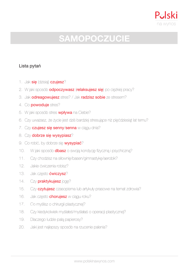 na wynos SAMOPOCZUCIE Lista pytań 1. Jak się (dzisiaj) czujesz? 2. W jaki sposób odpoczywasz (relaksujesz się) po ciężkiej pracy? 3. Jak odreagowujesz stres? / Jak radzisz sobie ze stresem? 4. Co powoduje stres? 5. W jaki sposób stres wpływa na Ciebie? 6. Czy uważasz, że życie jest dziś bardziej stresujące niż pięćdziesiąt lat temu? 7. Czy czujesz się senny/senna w ciągu dnia? 8. Czy dobrze się wysypiasz? 9. Co robić, by dobrze się wysypiać? 10. W jaki sposób dbasz o swoją kondycję fizyczną i psychiczną? 11. Czy chodzisz na siłownię/basen/gimnastykę/aerobik? 12. Jakie ćwiczenia robisz? 13. Jak często ćwiczysz? 14. Czy praktykujesz jogę? 15. Czy czytujesz czasopisma lub artykuły prasowe na temat zdrowia? 16. Jak często chorujesz w ciągu roku? 17. Co myślisz o chirurgii plastycznej? 18. Czy kiedykolwiek myślałeś/myślałaś o operacji plastycznej? 19. Dlaczego ludzie palą papierosy? 20. Jaki jest najlepszy sposób na rzucenie palenia? UWAGA! www.polskinawynos.com