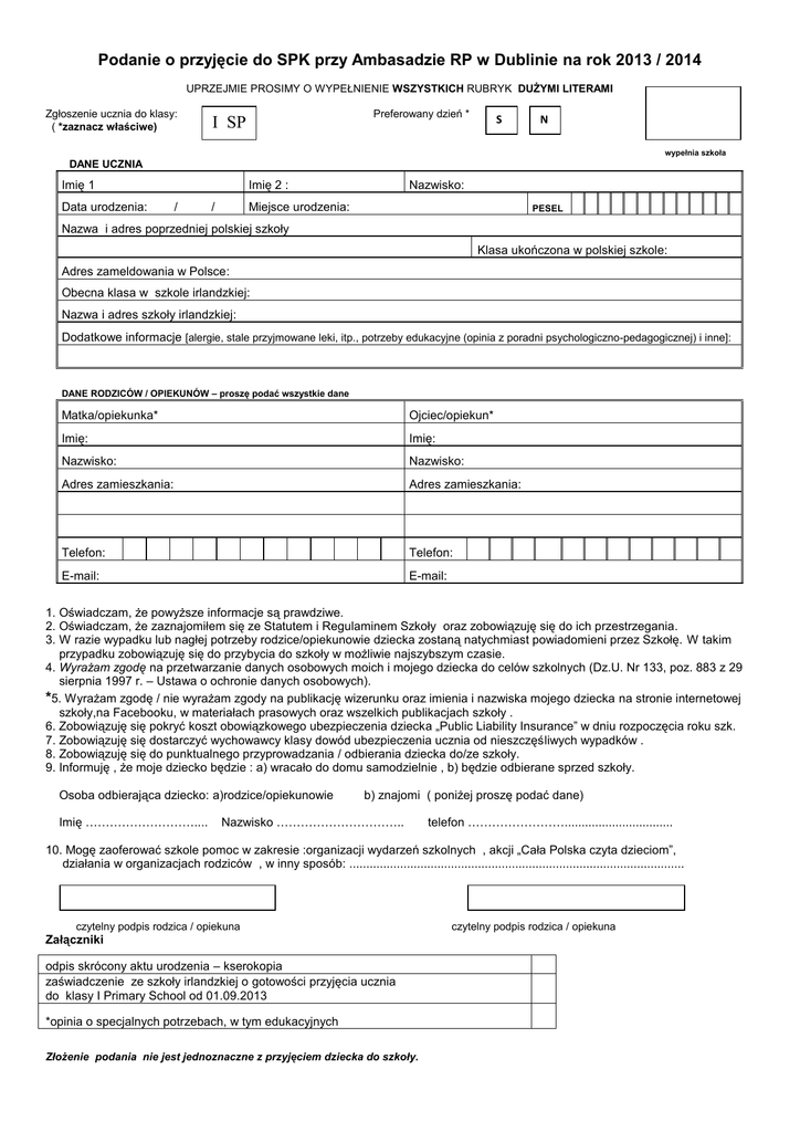 Podanie o przyjęcie do SPK przy Ambasadzie RP w Dublinie na rok 2013 / 2014 UPRZEJMIE PROSIMY O WYPEŁNIENIE WSZYSTKICH RUBRYK DUŻYMI LITERAMI Zgłoszenie ucznia do klasy: ( *zaznacz właściwe) Preferowany dzień * I SP S N wypełnia szkoła DANE UCZNIA Imię 1 Data urodzenia: Imię 2 : / / Nazwisko: Miejsce urodzenia: PESEL Nazwa i adres poprzedniej polskiej szkoły Klasa ukończona w polskiej szkole: Adres zameldowania w Polsce: Obecna klasa w szkole irlandzkiej: Nazwa i adres szkoły irlandzkiej: Dodatkowe informacje [alergie, stale przyjmowane leki, itp., potrzeby edukacyjne (opinia z poradni psychologiczno-pedagogicznej) i inne]: DANE RODZICÓW / OPIEKUNÓW – proszę podać wszystkie dane Matka/opiekunka* Ojciec/opiekun* Imię: Imię: Nazwisko: Nazwisko: Adres zamieszkania: Adres zamieszkania: Telefon: Telefon: E-mail: E-mail: 1. Oświadczam, że powyższe informacje są prawdziwe. 2. Oświadczam, że zaznajomiłem się ze Statutem i Regulaminem Szkoły oraz zobowiązuję się do ich przestrzegania. 3. W razie wypadku lub nagłej potrzeby rodzice/opiekunowie dziecka zostaną natychmiast powiadomieni przez Szkołę. W takim przypadku zobowiązuję się do przybycia do szkoły w możliwie najszybszym czasie. 4. Wyrażam zgodę na przetwarzanie danych osobowych moich i mojego dziecka do celów szkolnych (Dz.U. Nr 133, poz. 883 z 29 sierpnia 1997 r. – Ustawa o ochronie danych osobowych). *5. Wyrażam zgodę / nie wyrażam zgody na publikację wizerunku oraz imienia i nazwiska mojego dziecka na stronie internetowej szkoły,na Facebooku, w materiałach prasowych oraz wszelkich publikacjach szkoły . 6. Zobowiązuję się pokryć koszt obowiązkowego ubezpieczenia dziecka „Public Liability Insurance” w dniu rozpoczęcia roku szk. 7. Zobowiązuję się dostarczyć wychowawcy klasy dowód ubezpieczenia ucznia od nieszczęśliwych wypadków . 8. Zobowiązuję się do punktualnego przyprowadzania / odbierania dziecka do/ze szkoły. 9. Informuję , że moje dziecko będzie : a) wracało do domu samodzielnie , b) będzie odbierane sprzed szkoły. Osoba odbierająca dziecko: a)rodzice/opiekunowie Imię ……………………….... b) znajomi ( poniżej proszę podać dane) Nazwisko ………………………….. telefon ……………………................................ 10. Mogę zaoferować szkole pomoc w zakresie :organizacji wydarzeń szkolnych , akcji „Cała Polska czyta dzieciom”, działania w organizacjach rodziców , w inny sposób: ................................................................................................... czytelny podpis rodzica / opiekuna Załączniki odpis skrócony aktu urodzenia – kserokopia zaświadczenie ze szkoły irlandzkiej o gotowości przyjęcia ucznia do klasy I Primary School od 01.09.2013 *opinia o specjalnych potrzebach, w tym edukacyjnych Złożenie podania nie jest jednoznaczne z przyjęciem dziecka do szkoły. czytelny podpis rodzica / opiekuna