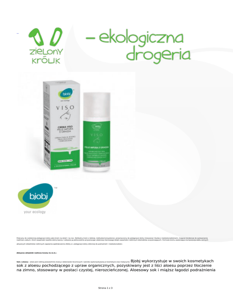 Polecany do codziennej pielęgnacji skóry jako krem na dzień i na noc. Delikatny krem o lekkiej, nietłustej konsystencji, przeznaczony do pielęgnacji skóry mieszanej i tłustej z niedoskonałościami, mającej tendencje do wytwarzania nadmiaru sebum. Krem wspaniale nawilża skórę twarzy i odżywia ją jednocześnie przywracając właściwą równowagę dzięki zawartości roślinnych ekstraktów oczyszczających. Formuła kremu zawierająca kompozycję wielu cennych aktywnych składników roślinnych zapewnia spektakularne efekty w pielęgnacji skóry skłonnej do podrażnień i niedoskonałości. Aktywne składniki roślinne kremu to m.in.: Bjobj wykorzystuje w swoich kosmetykach sok z aloesu pochodzącego z upraw organicznych, pozyskiwany jest z liści aloesu poprzez tłoczenie na zimno, stosowany w postaci czystej, nierozcieńczonej. Aloesowy sok i miąższ łagodzi podrażnienia Sok z aloesu - aloes jest rośliną powszechnie znaną z właściwości leczniczych i szeroko wykorzystywaną w kosmetyce oraz medycynie. Strona 1 z 3 skóry, nawilża ją ma także działanie przeciwzapalne i przeciwbakteryjne. To również wspaniałe źródło aminokwasów, witamin C, E i z grupy B, biotyny i kwasu foliowego, ponadto zawiera szeroka gamę niezbędnych dla zdrowia skóry minerałów jak: sód, potas, magnez, cynk, miedź i żelazo. Ekstrakt z łopianu - Łopian jest popularnym naturalnym środkiem leczniczym w wielu dolegliwościach skórnych. Łagodzi świąd, wspomaga leczenie trądziku. Ekstrakt z pokrzywy - Preparaty z ziela pokrzywy zastosowane zewnętrznie działają przeciwłojotokowo, przeciwtrądzikowo, odżywczo dla skóry. Aktywują procesy regeneracji skóry, przyśpieszają gojenie ran. Leczą wypryski, trądzik, łojotokowe zapalenie skóry. Poprawiają ukrwienie i koloryt skóry. Skrobia kukurydziana - ma silne właściwości adsorpcyjne, doskonale wchłania sebum i wilgoć ze skóry. Polecana do cery tłustej lub mieszanej z nadmierną produkcją sebum. Skóra po aplikacji produktów ze skrobią staje się matowa, gładka i miękka. Kukurydza w kosmetologii używana jest jako lek na wszelkiego rodzaju zapalenia, podrażnienia, wysypki czy wągry. Jest bogatym źródłem selenu, witamin (A,E, B1, B2, PP i innych z grupy B), błonnika i potasu. Ponadto zawiera magnez, wapń, żelazo, miedź, mangan, fosfor i cynk. Olej arganowy - przeciwdziała procesowi starzenia się skóry a także łagodzi objawy trądziku młodzieńczego, alergii i łuszczycy. Ponadto przynosi rewelacyjne efekty w gojeniu się skóry. Zawiera ponad 80% nienasyconych kwasów tłuszczowych, około 35% kwasu linolowego i tokoferole, które są głównym antyoksydantem chroniącym komórki przed utleniaczami. Wysoka zawartość witaminy F jest odpowiedzialna za przyspieszenie procesu gojenia się ran. Zapobiega zatykaniu się porów i ujść łojowych, dzięki czemu skóra może swobodniej oddychać. Witamina E (Tocopherol) - substancja o działaniu antyoksydacyjnym (przeciwutleniającym), hamuje procesy starzenia się skóry wywoływane np. promieniowaniem UV lub dymem papierosowym. Jest doskonałym czynnikiem hamującym rodnikowe utlenianie lipidów w naskórku i skórze właściwej. Witamina E wykazuje zdolność wbudowywania się w struktury lipidowe błon komórkowych i cementu międzykomórkowego warstwy rogowej, dzięki czemu wzmacnia barierę naskórkową. Wzmocnienie bariery naskórkowej nie tylko utrudnia wnikanie substancji obcych i zapobiega podrażnieniom, ale także hamuje TEWL (transepidermalną utratę wody) dzięki czemu wpływa na poprawę nawilżenia skóry. Zapobiega powstawaniu stanów zapalnych, wzmacnia ściany naczyń krwionośnych i poprawia ukrwienie skóry. Gamma Oryzanol - pozyskuje się go z oleju z otrębów ryżowych, jest naturalnym antyoksydantem, aż 10 razy silniejszym niż witamina E. Dzięki temu ma niezwykłe działanie przeciwstarzeniowe - ochrania komórki przed uszkodzeniem ich DNA. Poprawia napięcie skóry, niweluje plamy, zmarszczki, cienie i obrzęki. Zmniejsza plamy związane z wiekiem. Dodatkowo składnik ten reguluje działanie gruczołów łojowych, ma działanie przeciwzapalne i chroni przed promieniowaniem UV. *Sok z aloesu, *Ekstrakt z łopianu i *Ekstrakt z pokrzywy, Skrobia kukurydziana, *Olej arganowy, Witamina E, Gamma Oryzanol Kluczowe składniki roślinne: Sposób użycia: Niewielką ilość kremu nanieść na skórę twarzy, szyi i dekoltu, masować aż do wchłonięcia. PRODUKT WEGAŃŚKI POJEMNOŚĆ: 50 ml - w 100% naturalny zapach - bez parabenów, - bez glikolu, alkoholu - bez sztucznych barwników - bez silikonu, aluminium - bez Phenoxyethanolu - bez PEG i SLS - bez składników GMO - fizjologiczne pH - hypoalergiczny Składniki: aqua (water), glycerin, *aloe barbadensis gel, cetearyl alcohol, *argania spinosa kernel oil, caprylic/capric triglyceride, cetearyl olivate, sorbitan olivate, zea mays starch, *urtica dioica leaf extract, *arctium lappa root extract, cetyl palmitate, sorbitan palmitate, tocopherol, oryzanol, benzyl alcohol, sodium benzoate, potassium sorbate, **parfum, lactic acid, citral, geraniol, limonene, linalool. Strona 2 z 3 ** składniki pochodzenia naturalnego * Wszystkie składniki oznaczone gwiazdką pochodzą z certyfikowanych ekologicznych upraw Warunki przechowywania: Krem zawiera aktywne składniki roślinne, zalecane jest przechowywanie produktu w temperaturze między 10 a 28 ºC Krem należy zużyć w okresie 6 miesięcy od otwarcia. Strona 3 z 3