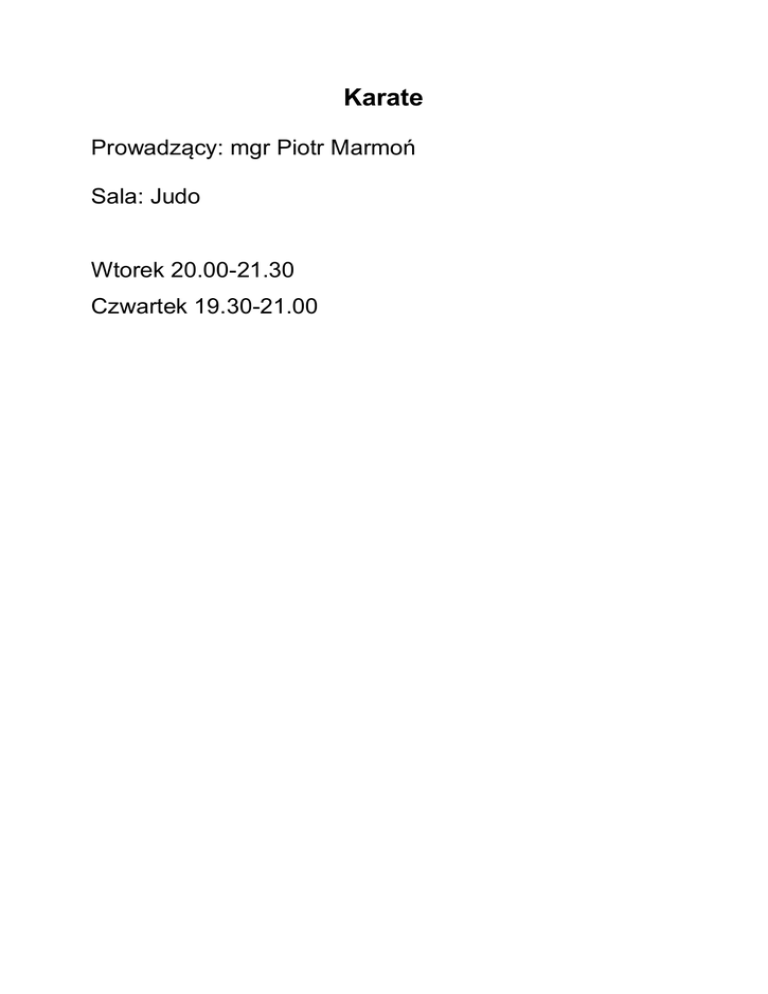 Karate Prowadzący: mgr Piotr Marmoń Sala: Judo Wtorek 20.00-21.30 Czwartek 19.30-21.00