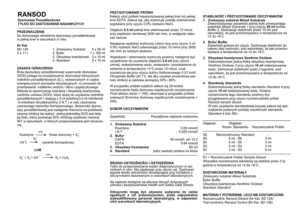 PRZYGOTOWANIE PRÓBKI Należy użyć próbek heparynizowanej pełnej krwi lub pełnej krwi EDTA. Zaleca się, aby erytrocyty zostały czterokrotnie wypłukane przy użyciu 0.9% roztworu NaCl. RANSOD Dysmutaza Ponadtlenkowa TYLKO DO ZASTOSOWAŃ BADAWCZYCH PRZEZNACZENIE Do ilościowego określenia dysmutazy ponadtlenkowej w pełnej krwi w warunkach in vitro. Nr Kat. SD 125 5 x 11 t 1. Zmieszany Substrat 2. Bufor 3. Oksydaza ksantynowa 4. Standard 5 x 20 ml 1 x 105 ml 3 x 10 ml 5 x 10 ml ZASADA OZNACZENIA Rola dysmutazy ponadtlenkowej superoxide dismutase (SOD) polega na przyśpieszaniu dysmutacji toksycznych rodników ponadtlenkowych (02•), wytwarzanych w czasie energetycznych procesów oksydacyjnych, co prowadzi do powstawania nadtlenku wodoru i tlenu cząsteczkowego. Metoda ta wykorzystuje ksantynę i oksydazę ksantynową xanthine oxidase (XOD), które służą do uzyskania rodników ponadtlenkowych i reagują z 2-(4-jodofenyl)-3-(4-nitrofenol) -5-chlorkiem fenyltetrazoliny (I.N.T.) w celu utworzenia czerwonego barwnika formazanowego. Aktywność dysmutazy ponadtlenkowej jest następnie mierzona na podstawie stopnia inhibicji tej reakcji. Jedną jednostką SOD jest taka jej ilość, która powoduje 50% inhibicję szybkości redukcji INT w warunkach, w których przeprowadzane jest oznaczenie. XOD Ksantyna I.N.T. 02 • Kwas moczowy + 02• barwnik formazanowy LUB 02• + 02•+ 2H+ SOD Objętość 0.5 ml pełnej krwi odwirowywać przez 10 minut przy prędkości obrotowej 3000 obr./min, a następnie odessać osocze. STABILNOŚĆ I PRZYGOTOWANIE ODCZYNNIKÓW 1. Zmieszany substrat Mixed Substrate Zrekonstytuować zawartość jednej fiolki zmieszanego substratu Mixed Substrate 1 przy użyciu 20 ml bufora Buffer 2. Zachowuje stabilność przez 10 dni pod warunkiem, że jest przechowywany w temperaturze od +2 do +8°C. Następnie wypłukać erytrocyty cztery razy przy użyciu 3 ml 0.9% roztworu NaCl odwirowując przez 10 minut przy 3000 obr./min po każdym płukaniu. 2. Bufor Buffer Zawartość gotowa do użycia. Zachowuje stabilność do upływu daty ważności, pod warunkiem, że jest przechowywana w temperaturze od +2 do +8°C. Wypłukane i odwirowane erytrocyty powinny następnie być uzupełnione do uzyskania objętości 2.0 ml przy użyciu zimnej, redestylowanej wody, zmieszane i pozostawione do odstania w temperaturze +4°C przez 15 minut. Lizat rozcieńcza się przy użyciu buforu fosforanowego 0.01 mol/l Phosphate Buffer pH 7.0, tak aby uzyskać procentową wartość inhibicji w zakresie pomiędzy 30% i 60%. 3. Oksydaza ksantynowa Xanthine Oxidase Zrekonstytuować jedną fiolkę oksydazy ksantynowej Xanthine Oxidase 3 przy użyciu 10 ml redestylowanej wody. Zachowuje stabilność przez 2 tygodnie, pod warunkiem, że jest przechowywana w temperaturze od +2 do +8°C. W przypadku próbek ludzkich zaleca się 25-krotne rozcieńczenie lizatu (końcowy współczynnik rozcieńczenia Final dilution factor = 100), natomiast w przypadku próbek wołowych 50-krotne (końcowy współczynnik rozcieńczenia = 200). DOBÓR ODCZYNNIKÓW Zawartość 1. Zmieszany Substrat Ksantyna I.N.T. 2. Bufor CAPS EDTA 3. Oksydaza Ksantyowa 4. Standard Początkowe stężenie roztworów 4. Standardy Standards Zrekonstytuować jedną fiolkę standardu Standard 4 przy użyciu 10 ml redestylowanej wody. Kolejne rozcieńczenia tego standardu powinny być przygotowane przy użyciu rozcieńczalnika próbki Ransod sample diluent. W celu uzyskania standardowej krzywej zaleca się sporządzenie podanych poniżej rozcieńczeń standardu Standard 4 (lub S6):Objętość 0.05 mmol/l 0.025 mmol/l 40 mmol/l, pH 10.2 0.94 mmol/l 80 U/l patrz wartość podana na fiolce 02 + H202 ŚRODKI OSTROŻNOŚCI I OSTRZEŻENIA Tylko do przeprowadzania badań diagnostycznych w warunkach in vitro. Nie pipetować przy użyciu ust. Zachować typowe środki ostrożności obowiązujące przy kontakcie z odczynnikami stosowanymi w warunkach laboratoryjnych. Na żądanie dostępne są arkusze danych dotyczących zdrowia i bezpieczeństwa Health and Safety Data Sheets. Odczynniki mogą być używane wyłącznie do celów zgodnych z ich przeznaczeniem, przez odpowiednio wykwalifikowany personel laboratoryjny, w odpowiednich warunkach laboratoryjnych. S6 S5 S4 S3 S2 Objętość Roztw. Standardu Rozcieńczalnik Próbki Nierozcieńczony Standard 5 ml - S6 5 ml - S5 5 ml - S4 3 ml - S3 5 ml 5 ml 5 ml 6 ml S1 = Rozcieńczalnik Próbki Sample Diluent Wszystkie rozcieńczone standardy są stabilne przez 2 tygodnie w temperaturze od +2 do +8°C. DOSTARCZONE MATERIAŁY Zmieszany substrat Mixed Substrate Bufor Buffer Oksydaza ksantynowa Xanthine Oxidase Standard Standard MATERIAŁY POTRZEBNE, LECZ NIE DOSTARCZONE Rozcieńczalnik Ransod Diluent (Nr Kat. SD 124) Test kontrolny Ransod Control (Nr Kat. SD 126) INSTRUKCJA - RANSOD - SD 125 STRONA 2 / 2 Należy wykreślić procentową wartość inhibicji dla każdego standardu względem Log10 (standardowe stężenie w jednostkach SOD/ml). PROCEDURA Długość fali światła: Kuweta: Temperatura: Pomiar: 505 nm droga światła 1 cm 37°C względem powietrza jednostki SOD/ml pełnej krwi = Pipetować do kuwety: Rozcieńczalnik Standardy Rozcieńcz. Próbki S2 - S6 Próbka Rozcieńczona próbka --Standard --Rozcieńcz. próbki Ransod 0.05 ml Zmieszany substrat 1.7 ml --0.05 ml --1.7 ml 0.05 ml ----1.7 ml 0.25 ml 0.25 ml 0.25 ml Zmieszać, zmierzyć początkową absorbancję A1 po 30 sekundach i jednocześnie uruchomić czasomierz. Zmierzyć końcową absorbancję A2 po 3 minutach. OBLICZENIA A2 - A1 = -A/min dla próbki lub standardu Współczynnik rozcieńczenia próbki (współcz. S1) = współczynnik dla reakcji bez inhibicji = 100 % Wszystkie standardowe współczynniki i współczynniki rozcieńczenia próbki muszą być poddane konwersji, tzn. zamienione na wartość procentową współczynnika rozcieńczenia próbki i odjęte od 100 % w celu określenia procentowej inhibicji. (-Astd/min x 100) = % inhibicji (-AS1/