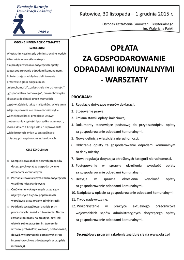 Rozwiązania informatyczne Katowice, 30 listopada – 1 grudnia 2015 r. Ośrodek Kształcenia Samorządu Terytorialnego im. Waleriana Pańki OGÓLNE INFORMACJE O TEMATYCE SZKOLENIA: W ostatnim czasie sądy administracyjne wydały kilkanaście niezwykle ważnych dla praktyki wyroków dotyczących opłaty za gospodarowanie odpadami komunalnymi. Potwierdzają one błędne definiowanie przez wiele gmin pojęcia m. in. OPŁATA ZA GOSPODAROWANIE ODPADAMI KOMUNALNYMI - WARSZTATY „nieruchomości”, „właściciela nieruchomości”, „gospodarstwa domowego”, braku obowiązku składania deklaracji przez wszystkich PROGRAM: współwłaścicieli, także małżonków. Wiele gmin 1. Regulacje dotyczące wzorów deklaracji. zdaje się również nie zauważać niezwykle 2. Stosowanie prawa. ważnej nowelizacji przepisów ustawy 3. Zmiana stawki opłaty śmieciowej. o utrzymaniu czystości i porządku w gminach, która z dniem 1 lutego 2015 r. wprowadziła wiele istotnych zmian w szczególności dotyczących wspólnot mieszkaniowych. 4. Dokumenty stanowiące podstawę do przypisu/odpisu opłaty za gospodarowanie odpadami komunalnymi. 5. Nowa definicja właściciela nieruchomości. 6. Obliczanie opłaty za gospodarowanie odpadami komunalnym CELE SZKOLENIA: • Kompleksowa analiza nowych przepisów dotyczących opłat za gospodarowanie odpadami komunalnymi; • Poznanie rewolucyjnych zmian dotyczących wspólnot mieszkaniowych; • Omówienie wskazywanych przez sądy najczęstszych błędów popełnianych w praktyce przez organy administracji; • Poddanie szczegółowej analizie pism procesowych i zasad ich tworzenia. Nacisk zostanie położony na praktykę, czyli jak za dany miesiąc. 7. Nowa regulacja dotycząca określonych kategorii nieruchomości. 8. Postępowanie w sprawie określenia wysokość opłaty za gospodarowanie odpadami komunalnym. 9. Decyzja w sprawie określenia wysokość opłaty za gospodarowanie odpadami komunalnymi. 10. Nadpłata w opłacie za gospodarowanie odpadami komunalnymi 11. Tryby nadzwyczajne. 12. Wykorzystanie w praktyce aktualnego orzecznictwa wojewódzkich sądów administracyjnych dotyczącego opłaty za gospodarowanie odpadami komunalnymi. ułatwić sobie pracę (m. in. tworzenie wzorów protokołów, wezwań, postanowień, decyzji, wykorzystanie pomocnych stron internetowych oraz dostępnych w urzędzie informacji). Szczegółowy program szkolenia znajduje się na www.okst.pl SZKOLENIE SKIEROWANE DO: pracowników urzędów gmin/miast zajmujących się sprawami dotyczącymi opłat za gospodarowanie odpadami komunalnymi, w szczególności prowadzących postępowania w sprawie określenia wysokości opłaty. D A N E D O K O N T A K T U : Ośrodek Kształcenia Samorządu Terytorialnego im. Waleriana Pańki 40-014 Katowice ul. Mariacka 1 NIP: 522-000-18-95 Miejsce szkolenia: Katowice, siedziba Ośrodka, ul. Mariacka 1 (II piętro). Termin i godzina: 30 listopada – 1 grudnia 2015 r. godz. 10.00 – 15.00. Cena: 499 zł netto/os., Udział w szkoleniu zwolniony z VAT w przypadku finansowania szkolenia ze środków publicznych. Cena zawiera materiały szkoleniowe, zaświadczenie o ukończeniu szkolenia, poczęstunek i serwis kawowy. el/fax. 32 259 86 73, 32 253 84 09 e-mail: [email protected] www.okst.pl OSOBA DO KONTAKTU: Barbara Tekień, tel. 32 206 98 43 w. 35, [email protected] Zgłoszenia: Wypełnioną kartę zgłoszenia należy przesłać mailem lub faksem do 25 listopada 2015 r. Uwaga: Ilość miejsc ograniczona. Brak pisemnej rezygnacji do 25.11.2015 r. będzie równoznaczny z obciążeniem Państwa pełnym kosztem szkolenia. Karta zgłoszenia – kod szkolenia: 1193/15/T Nazwa Nabywcy (dane do FVAT):.................................................................................………………………………………… Ulica, nr domu: ........................................... Miejscowość…………………..………………kod pocztowy………….….……….. NIP: ............................................................. Tel......................................…………e-mail………………………..……………… 1. ............................................................................................................................................................................. imię i nazwisko, (wypełnić drukowanymi) wydział/ stanowisko 2............................................................................................................................................................................... imię i nazwisko, (wypełnić drukowanymi) wydział/ stanowisko Oświadczam, że szkolenie dla ww. pracowników jest kształceniem zawodowym finansowanym w całości lub co najmniej 70% ze środków publicznych (właściwe zaznaczyć) TAK / NIE ......…………………………………. Podpis UWAGA! Ilość miejsc ograniczona. O udziale w szkoleniu decyduje kolejność zgłoszeń. Zgłoszenie na szkolenie musi zostać potwierdzone przesłaniem do Ośrodka karty zgłoszenia. Brak pisemnej rezygnacji ze szkolenia najpóźniej na trzy dni przed terminem będzie równoznaczny z obciążeniem Państwa należnością za to szkolenie. Należność należy płacić przelewem najpóźniej 3 dni przed szkoleniem (nie dotyczy Jednostek Samorządu Terytorialnego). Na przelewie prosimy podać nazwę szkolenia lub jego numer). NR RACHUNKU: BPH: 68-10600076-0000321000197618