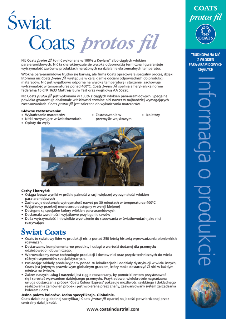 protos fil protos fil Nić Coats protos fil to nić wykonana w 100% z Kevlaru® albo ciągłych włókien para-aramidowych. Nić ta charakteryzuje się wysoką odpornością termiczną i gwarantuje wytrzymałość szwów w produktach narażonych na działanie ekstremalnych temperatur. Nić Coats protos fil jest wykonana w 100% z ciągłych włókien para-aramidowych. Specjalna powłoka gwarantuje doskonałe właściwości szwalne nici nawet w najbardziej wymagających zastosowaniach. Coats protos fil jest zalecana do wykańczania materaców. Główne zastosowania: • Wykańczanie materaców • Nitki rozrywające w światłowodach • Oploty do węży • Zastosowanie w przemyśle wojskowym • Izolatory Cechy i korzyści: • Osiąga lepsze wyniki w próbie palności z racji większej wytrzymałości włókien para-aramidowych • Zachowuje doskonałą wytrzymałość nawet po 30 minutach w temperaturze 400ºC • Wyjątkowy przekrój monocordu dostępny w wersji klejonej • Dostępne są specjalne kolory włókien para-aramidowych • Doskonała szwalność i wyjątkowe przyleganie szwów • Duża wytrzymałość i niewielkie wydłużenie do stosowania w światłowodach jako nici rozrywające • Coats to światowy lider w produkcji nici z ponad 250 letnią historią wprowadzania pionierskich rozwiązań. • Dostarczamy komplementarne produkty i usługi o wartości dodanej dla przemysłu odzieżowego i obuwniczego. • Wprowadzamy nowe technologie produkcji i dostaw nici oraz przędz technicznych do wielu różnych segmentów specjalistycznych. • Posiadając zakłady produkcyjne w ponad 70 lokalizacjach i oddziały dystrybucji w wielu innych, Coats jest jedynym prawdziwym globalnym graczem, który może dostarczyć Ci nici w każdym miejscu na świecie. • Zakres naszych usług i narzędzi jest ciągle rozszerzany, by pomóc klientom przystosować się i sprostać wyzwaniom dzisiejszego przemysłu. Przykładowo, wielokrotnie nagradzana usługa dostarczania próbek ‘Coats Colour Express’ pokazuje możliwości szybkiego i dokładnego realizowania zamówień próbek i jest wspierana przez znany, zaawansowany system zarządzania kolorem Coats. Jedna paleta kolorów. Jedna specyfikacja. Globalnie. Coats działa na globalnej specyfikacji Coats protos fil opartej na jakości potwierdzonej przez centralny dział jakości. www.coatsindustrial.com Informacja o produkcie Włókna para-aramidowe trudno się barwią, ale firma Coats opracowała specjalny proces, dzięki któremu nić Coats protos fil występuje w całej gamie odcieni odpowiednich do produkcji materaców. Nić jest wyjątkowo odporna na wysoką temperaturę i starzenie, zachowuje wytrzymałość w temperaturze ponad 400ºC. Coats protos fil spełnia amerykańską normę federalną 16 CFR 1633 Mattress Burn Test oraz wojskową AA 55220. TRUDNOPALNA NIĆ Z WŁÓKIEN PARA-ARAMIDOWYCH CIĄGŁYCH protos fil Dane techniczne: Nr Tex 70 50 35 30 25 24 20 18 13 9 1 3 2 2 1 1 3 1 1 3 Przeciętna Wydłużenie % Zalecany Rozmiar Igły* Wytrzymałość cN Gramów Singer Metryczny 6,664 10,192 13,328 18,468 19,992 22,540 27,445 31,164 42,140 60,074 6,795 10,393 13,591 18,832 20,386 22,984 27,986 31,778 42,970 61,257 6 6 6 3-5 6 6 3-5 6 6 6 12 - 14 14 - 18 16 - 19 19 - 22 18 - 22 19 - 23 21 - 23 22 - 24 24 - 27 26 - 29 80 - 90 90 - 100 110 - 130 120 - 140 120 - 140 130 - 160 130 - 160 130 - 180 180 - 250 230 - 300 * Podane rekomendacje igieł należy traktować wyłącznie jako wskazówkę. Ich ostateczny wybór zależy od rodzaju zastosowania. Biorąc pod uwagę, że warunki i zastosowanie nici mogą być bardzo zróżnicowane, użytkownik nici powinien wcześniejszymi pozytywnymi testami próbnymi potwierdzić użycie danej nici do konkretnego przeznaczenia. Poniższe dane techniczne oparte są na pomiarach uśrednionych i powinny być traktowane jako orientacyjne. Fizyczne i chemiczne właściwości trudnopalnych nici z włókien para-aramidowych ciągłych: Właściwości termiczne: • Rozkłada się w temperaturze 450ºC (840ºF) Właściwości chemiczne: • Doskonała odporność na oleje i substancje petrochemiczne • Doskonała odporność na substancje chemiczne Coats protos fil - odporności: • Odporność na pranie w 95ºC (ISO 105 C04 (DIN 54011)) (ISO 105 X12 (DIN 54021)) • Odporność na tarcie Poziom 3 Poziom 3 Przedstawione poziomy odporności to wyniki minimalne; w praktyce w przypadku większości kolorów osiągane poziomy odporności są wyższe. Ze względu na szeroką różnorodność zastosowań nici zaleca się przeprowadzenie prób produkcyjnych w celu weryfikacji czy wybrany produkt jest odpowiedni do konkretnego zastosowania. © Prawa autorskie zastrzeżone 2013 www.coatsindustrial.com TRUDNOPALNA NIĆ Z WŁÓKIEN PARA-ARAMIDOWYCH CIĄGŁYCH Informacja o produkcie 40 60 80 90 105 120 135 150 210 350 Numer Składowe Metryczny