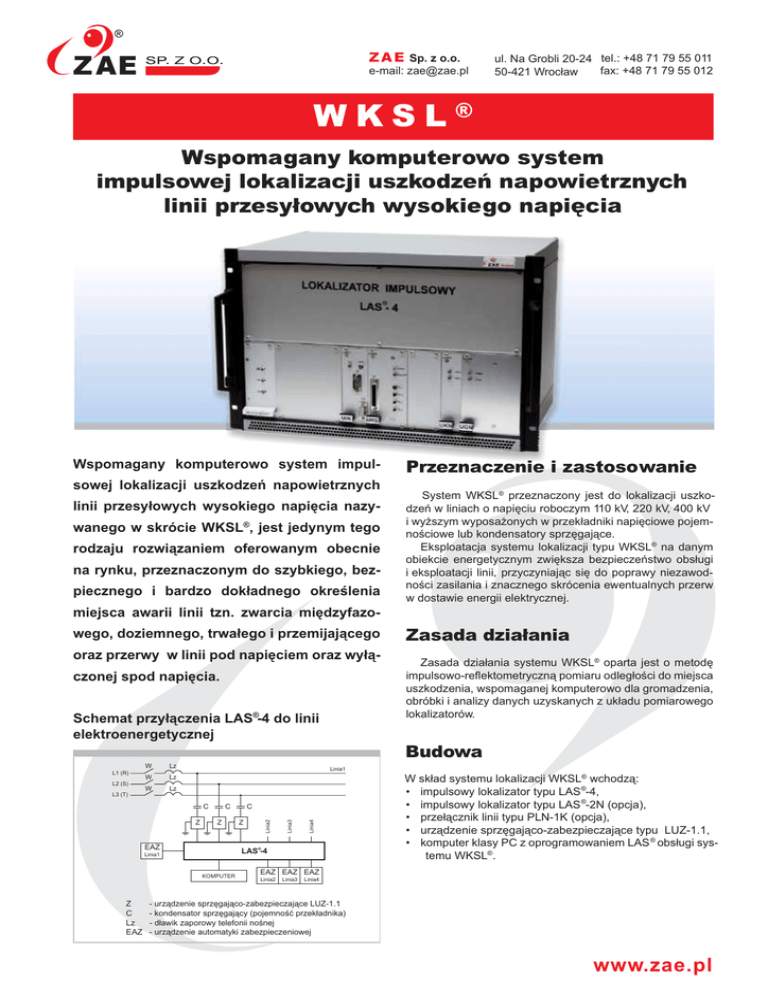 Z A E Sp. z o.o. e-mail: [email protected] ul. Na Grobli 20-24 tel.: +48 71 79 55 011 fax: +48 71 79 55 012 50-421 Wrocław WKSL® Wspomagany komputerowo system impulsowej lokalizacji uszkodzeń napowietrznych linii przesyłowych wysokiego napięcia Wspomagany komputerowo system impulsowej lokalizacji uszkodzeń napowietrznych linii przesyłowych wysokiego napięcia nazywanego w skrócie WKSL®, jest jedynym tego rodzaju rozwiązaniem oferowanym obecnie na rynku, przeznaczonym do szybkiego, bezpiecznego i bardzo dokładnego określenia Przeznaczenie i zastosowanie System WKSL® przeznaczony jest do lokalizacji uszkodzeń w liniach o napięciu roboczym 110 kV, 220 kV, 400 kV i wyższym wyposażonych w przekładniki napięciowe pojemnościowe lub kondensatory sprzęgające. Eksploatacja systemu lokalizacji typu WKSL® na danym obiekcie energetycznym zwiększa bezpieczeństwo obsługi i eksploatacji linii, przyczyniając się do poprawy niezawodności zasilania i znacznego skrócenia ewentualnych przerw w dostawie energii elektrycznej. miejsca awarii linii tzn. zwarcia międzyfazowego, doziemnego, trwałego i przemijającego oraz przerwy w linii pod napięciem oraz wyłączonej spod napięcia. Schemat przyłączenia LAS®-4 do linii elektroenergetycznej Zasada działania Zasada działania systemu WKSL® oparta jest o metodę impulsowo-reflektometryczną pomiaru odległości do miejsca uszkodzenia, wspomaganej komputerowo dla gromadzenia, obróbki i analizy danych uzyskanych z układu pomiarowego lokalizatorów. Budowa L1 (R) L2 (S) W Lz W Lz W Lz Linia1 L3 (T) EAZ Linia4 ® LAS -4 Linia1 KOMPUTER Z C Lz EAZ C Z Linia3 C Z Linia2 C Z W skład systemu lokalizacji WKSL® wchodzą: • impulsowy lokalizator typu LAS ®-4, • impulsowy lokalizator typu LAS ®-2N (opcja), • przełącznik linii typu PLN-1K (opcja), • urządzenie sprzęgająco-zabezpieczające typu LUZ-1.1, • komputer klasy PC z oprogramowaniem LAS ® obsługi systemu WKSL®. EAZ EAZ EAZ Linia2 Linia3 Linia4 - urządzenie sprzęgająco-zabezpieczające LUZ-1.1 - kondensator sprzęgający (pojemność przekładnika) - dławik zaporowy telefonii nośnej - urządzenie automatyki zabezpieczeniowej www.zae.pl WKSL® Podstawowe dane techniczne Lokalizator LAS®-4 Urządzenie sprzęgająco-zabezpieczające LUZ-1.1 Napięcie zasilania 220 V ± 10 % DC Liczba urządzeń na jedną linię 3 szt. Maksymalny zasięg 175 km Impedancja wejściowa od linii 300 Ω Dokładność pomiaru 1% długości linii ± 50 m (1 próbka) Impedancja od strony lokalizatora 75 Ω Ilość nadzorowanych linii od 1 do 4 Tłumienność wtrąceniowa dla sygnałów ETN ≤ 1,2 dB (40 ÷ 450) kHz Czas trwania pomiaru jednej linii (15 ÷ 21,5) ms Czas trwania pomiaru dwóch linii (*) (2 ÷ 34,5) ms Komputer Czas trwania pomiaru trzech linii (**) (42 ÷ 47) ms Klasa PC minimum: Czas trwania pomiaru czterech linii (***) (55 ÷ 61) ms Karta SVGA kolor 32 MB Sposób odczytu wyniku pomiaru na ekranie monitora Pamięć RAM 256 MB (*),(**),(***) - czas trwania pomiaru przy jednoczesnym pobudzeniu z członów rozruchowych zabezpieczeń kolejno dwóch, trzech i czterech linii Procesor INTEL PENTIUM III 1 GHz Dysk HDD 10 GB Stacja FDD 3,5” 1,44 MB Lokalizator LAS®-2N CD-ROM Napięcie zasilania 220V ± 10% DC Maksymalny zasięg 150 km Dokładność pomiaru 1,5% długości linii ± 150 m (1 próbka) Ilość nadzorowanych linii 1 Czas trwania jednego pomiaru 25 ÷ 45 ms (w zależności od wersji) Sposób odczytu wyniku pomiaru na ekranie monitora Karta sieciowa 10/100 MBps Modem wewnętrzny 56k (opcja) Monitor 17”, rozdzielczość minimum 1024 x 768 Drukarka Oprogramowanie: Program obsługi LAS pod Windows XP Prof. PL (Windows 2000 ) Wyrób jest zgodny z wymaganiami dyrektyw: LVD (2006/95/EC) i EMC (2004/108/EC) . www.zae.pl