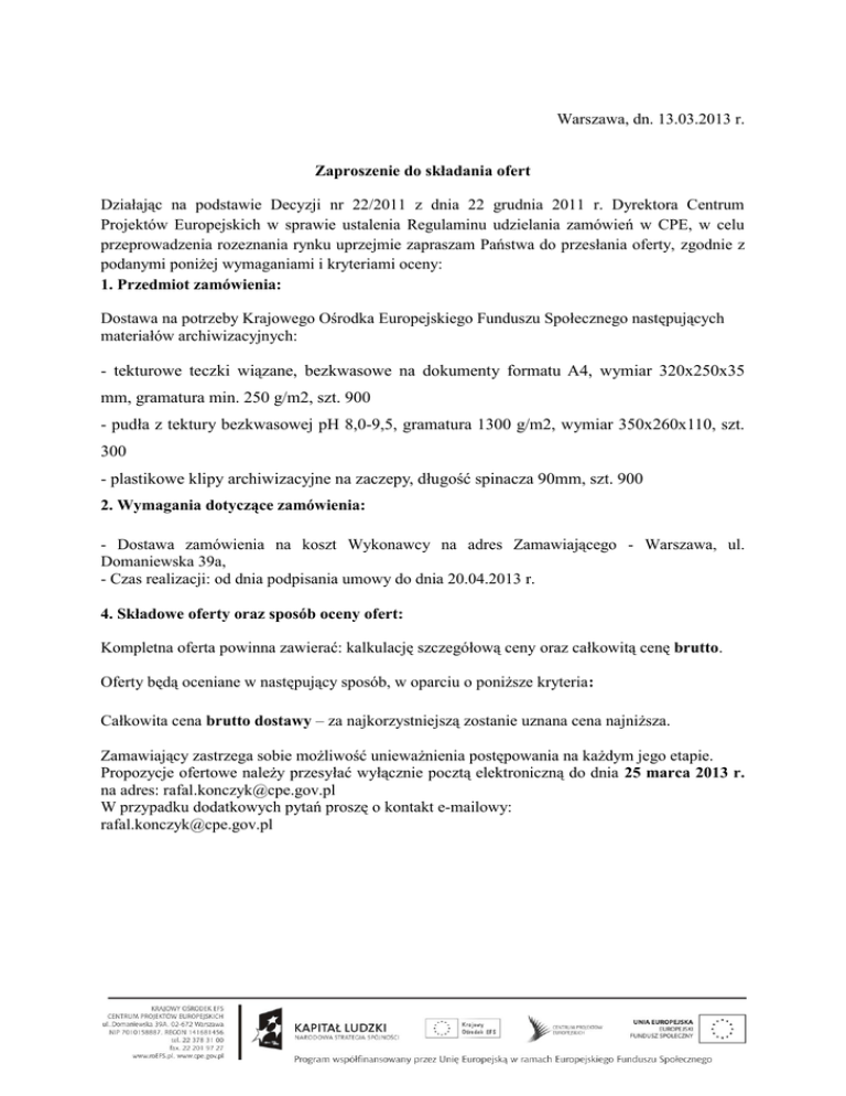 Warszawa, dn. 13.03.2013 r. Zaproszenie do składania ofert Działając na podstawie Decyzji nr 22/2011 z dnia 22 grudnia 2011 r. Dyrektora Centrum Projektów Europejskich w sprawie ustalenia Regulaminu udzielania zamówień w CPE, w celu przeprowadzenia rozeznania rynku uprzejmie zapraszam Państwa do przesłania oferty, zgodnie z podanymi poniżej wymaganiami i kryteriami oceny: 1. Przedmiot zamówienia: Dostawa na potrzeby Krajowego Ośrodka Europejskiego Funduszu Społecznego następujących materiałów archiwizacyjnych: - tekturowe teczki wiązane, bezkwasowe na dokumenty formatu A4, wymiar 320x250x35 mm, gramatura min. 250 g/m2, szt. 900 - pudła z tektury bezkwasowej pH 8,0-9,5, gramatura 1300 g/m2, wymiar 350x260x110, szt. 300 - plastikowe klipy archiwizacyjne na zaczepy, długość spinacza 90mm, szt. 900 2. Wymagania dotyczące zamówienia: - Dostawa zamówienia na koszt Wykonawcy na adres Zamawiającego - Warszawa, ul. Domaniewska 39a, - Czas realizacji: od dnia podpisania umowy do dnia 20.04.2013 r. 4. Składowe oferty oraz sposób oceny ofert: Kompletna oferta powinna zawierać: kalkulację szczegółową ceny oraz całkowitą cenę brutto. Oferty będą oceniane w następujący sposób, w oparciu o poniższe kryteria: Całkowita cena brutto dostawy – za najkorzystniejszą zostanie uznana cena najniższa. Zamawiający zastrzega sobie możliwość unieważnienia postępowania na każdym jego etapie. Propozycje ofertowe należy przesyłać wyłącznie pocztą elektroniczną do dnia 25 marca 2013 r. na adres: [email protected] W przypadku dodatkowych pytań proszę o kontakt e-mailowy: [email protected]