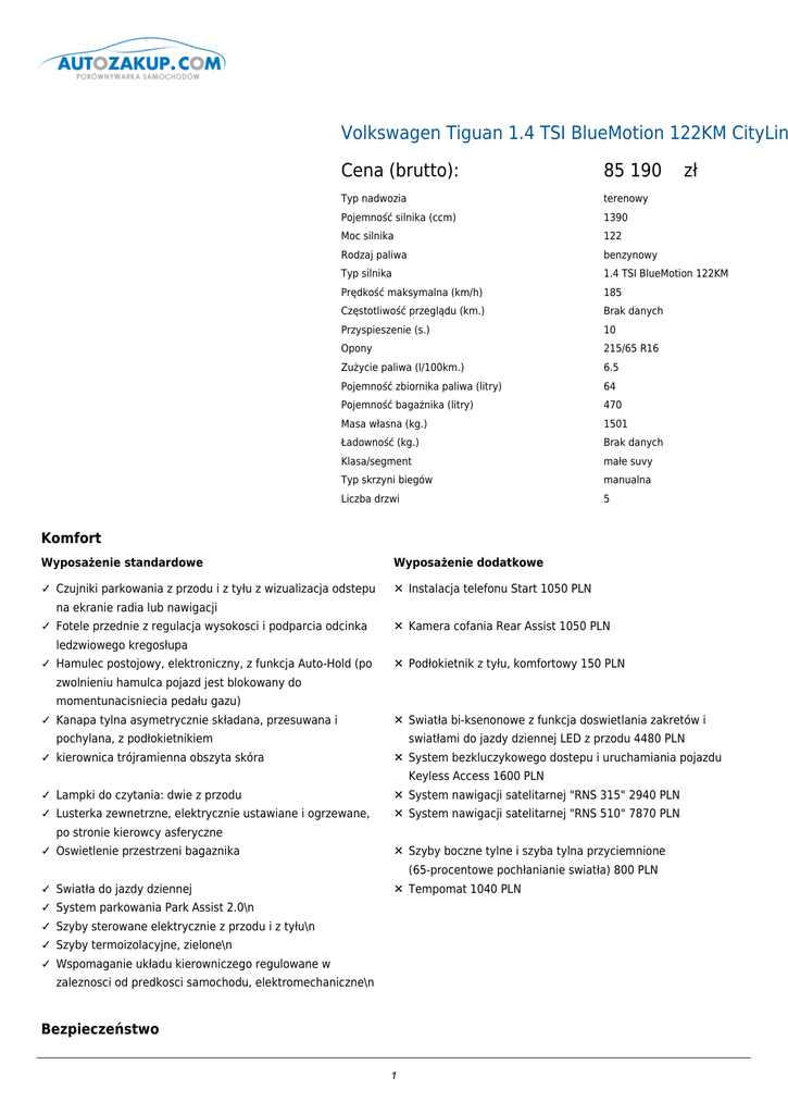 Volkswagen Tiguan 1.4 TSI BlueMotion 122KM CityLin Cena (brutto): 85 190 zł Typ nadwozia terenowy Pojemność silnika (ccm) 1390 Moc silnika 122 Rodzaj paliwa benzynowy Typ silnika 1.4 TSI BlueMotion 122KM Prędkość maksymalna (km/h) 185 Częstotliwość przeglądu (km.) Brak danych Przyspieszenie (s.) 10 Opony 215/65 R16 Zużycie paliwa (l/100km.) 6.5 Pojemność zbiornika paliwa (litry) 64 Pojemność bagażnika (litry) 470 Masa własna (kg.) 1501 Ładowność (kg.) Brak danych Klasa/segment małe suvy Typ skrzyni biegów manualna Liczba drzwi 5 Komfort Wyposażenie standardowe Wyposażenie dodatkowe ✓ Czujniki parkowania z przodu i z tyłu z wizualizacja odstepu ✕ Instalacja telefonu Start 1050 PLN na ekranie radia lub nawigacji ✓ Fotele przednie z regulacja wysokosci i podparcia odcinka ✕ Kamera cofania Rear Assist 1050 PLN ledzwiowego kregosłupa ✓ Hamulec postojowy, elektroniczny, z funkcja Auto-Hold (po ✕ Podłokietnik z tyłu, komfortowy 150 PLN zwolnieniu hamulca pojazd jest blokowany do momentunacisniecia pedału gazu) ✓ Kanapa tylna asymetrycznie składana, przesuwana i ✕ Swiatła bi-ksenonowe z funkcja doswietlania zakretów i pochylana, z podłokietnikiem ✓ kierownica trójramienna obszyta skóra swiatłami do jazdy dziennej LED z przodu 4480 PLN ✕ System bezkluczykowego dostepu i uruchamiania pojazdu Keyless Access 1600 PLN ✓ Lampki do czytania: dwie z przodu ✕ System nawigacji satelitarnej "RNS 315" 2940 PLN ✓ Lusterka zewnetrzne, elektrycznie ustawiane i ogrzewane, ✕ System nawigacji satelitarnej "RNS 510" 7870 PLN po stronie kierowcy asferyczne ✓ Oswietlenie przestrzeni bagaznika ✕ Szyby boczne tylne i szyba tylna przyciemnione ✓ Swiatła do jazdy dziennej ✕ Tempomat 1040 PLN (65-procentowe pochłanianie swiatła) 800 PLN ✓ System parkowania Park Assist 2.0\n ✓ Szyby sterowane elektrycznie z przodu i z tyłu\n ✓ Szyby termoizolacyjne, zielone\n ✓ Wspomaganie układu kierowniczego regulowane w zaleznosci od predkosci samochodu, elektromechaniczne\n Bezpieczeństwo 1 Wyposażenie standardowe Wyposażenie dodatkowe ✓ ESP ze stabilizacja przyczepy i kontrola przechyłu, ABS z asystentem hamowania, ASR, EDS, MSR\n ✓ Isofix - mocowania dla siedzen zewnetrznych z tyłu\n ✓ Kurtyny powietrzne dla pasazerów z przodu i z tyłu\n ✓ Pasy bezpieczenstwa dla foteli przednich, bezwładnosciowe, 3-punktowe, z regulacja wysokosci i napinaczami\n ✓ Pasy bezpieczenstwa dla siedzen tylnych, bezwładnosciowe, 3-punktowe\n ✓ Poduszki powietrzne boczne dla kierowcy i pasazera z przodu\n ✓ Poduszki powietrzne kierowcy i pasazera, z funkcja deaktywacji poduszki pasazera\n ✓ Swiatła awaryjne właczane automatyczne przy gwałtownym hamowaniu\n ✓ Sygnalizator niezapietych pasów bezpieczenstwa dla kierowcy i pasazera z przodu, akustyczny i wizualny\n ✓ Zderzak przedni z 18-stopniowym katem natarcia\n Dodatki Wyposażenie standardowe Wyposażenie dodatkowe ✓ Antena dachowa, aktywna ✕ Autoalarm z niezaleznym zasilaniem (Back-up-Horn), funkcja dozoru wnetrza i czujnikiem przechyłu 1200 PLN ✓ Aplikacje dekoracyjne "Dark Rhodium" na desce rozdzielczej ✕ Dach szklany, panoramiczny, sterowany elektrycznie 3800 i konsoli środkowej ✓ Deska rozdzielcza o białym podswietleniu z regulacja PLN ✕ dodatkowe 12 miesiecy, maksymalny przebieg: 30 000 km intensywnosci, czerwone podswietlenie przełaczników 900 PLN ✓ Gałka dzwigni zmiany biegów obszyta skóra ✕ dodatkowe 12 miesiecy, maksymalny przebieg: 60 000 km ✓ Gniazdo 12V w bagazniku ✕ dodatkowe 12 miesiecy, maksymalny przebieg: 90 000 km ✓ Hamulce tarczowe z przodu i z tyłu, z przodu wentylowane ✕ dodatkowe 24 miesiace, maksymalny przebieg: 120 000 km ✓ Kierunkowskazy boczne, zintegrowane w obudowie lusterek, ✕ dodatkowe 24 miesiace, maksymalny przebieg: 40 000 km 1200 PLN 1700 PLN 3500 PLN białe ✓ Klimatyzacja dwustrefowa, z automatyczna regulacja 1800 PLN ✕ dodatkowe 24 miesiace, maksymalny przebieg: 80 000 km "Climatronic" ✓ Kolumna kierownicy z mozliwoscia regulacji w dwóch 2550 PLN ✕ dodatkowe 36 miesiecy, maksymalny przebieg: 100 000 km płaszczyznach ✓ Komputer pokładowy MFA Plus ze wskazaniem zalecanego 4200 PLN ✕ dodatkowe 36 miesiecy, maksymalny przebieg: 150 000 km biegu ✓ Listwa na dolnej krawedzi drzwi bocznych z przodu i z tyłu, 5500 PLN ✕ dodatkowe 36 miesiecy, maksymalny przebieg: 50 000 km czarna ✓ Lusterka "Make up" w osłonach przeciwsłonecznych po 2900 PLN ✕ Dynamic Light Assist - asystent swiateł 1800 PLN stronie kierowcy i pasazera, podswietlane ✓ Obramowanie i listwy osłony wlotu powietrza do chłodnicy, ✕ Dywaniki materiałowe dla wszystkich rzedów siedzen 420 chromowane PLN 2 ✓ Obrecze kół ze stopu metali lekkich "Portland" ✕ Hak holowniczy, składany i chowany 3730 PLN 6.5J X 16 (sruby kół z zabezpieczeniem antykradziezowym "Thatcham", opony 215/65 R16, koło zapasowe, dojazdowe) ✓ Obudowy lusterek i klamki w kolorze nadwozia ✕ Kierownica multifunkcyjna (kierownica multifunkcyjna, trójramienna, obszyta skóra, dzwignia zmiany biegów obszyta skóra) 1150 PLN ✓ Podłokietnik z przodu ze schowkiem oraz dwoma nawiewami ✕ Klimatyzacja - mozliwosc rezygnacji ze standardowego powietrza, dwoma uchwytami na kubki i gniazdem 12V z tyłu ✓ Schowek po stronie pasazera, podswietlany, chłodzony i wyposazenia 0 PLN ✕ Lakier metaliczny 2200 PLN zamykany ✓ Sygnalizator niewyłaczonych swiateł, akustyczny ✕ Lakier perłowy 2200 PLN ✓ System radiowy "RCD 310" z funkcja odczytu ✕ Obrecze aluminiowe "Boston", (obrecze ze stopu plików MP3, odtwarzaczem CD, zewnetrznym gniazdem metali lekkich 7J x 17, opony 235/55 R 17, sruby kół z AUX-IN i 8głosnikami zabezpieczeniem antykradziezowym) 2560 PLN ✓ System Start-Stop z odzyskiwaniem energii przy hamowaniu ✕ Obrecze aluminiowe "New Orleans" (obrecze ze stopu metali lekkich 7J x 17, opony 235/55 R 17, sygnalizacja spadku cisnienia w oponach