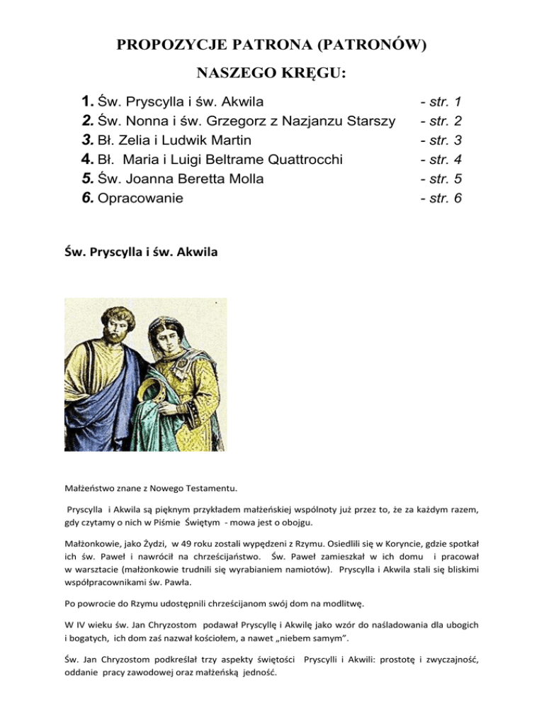 PROPOZYCJE PATRONA (PATRONÓW) NASZEGO KRĘGU: 1. Św. Pryscylla i św. Akwila 2. Św. Nonna i św. Grzegorz z Nazjanzu Starszy 3. Bł. Zelia i Ludwik Martin 4. Bł. Maria i Luigi Beltrame Quattrocchi 5. Św. Joanna Beretta Molla 6. Opracowanie - str. 1 - str. 2 - str. 3 - str. 4 - str. 5 - str. 6 Św. Pryscylla i św. Akwila Małżeostwo znane z Nowego Testamentu. Pryscylla i Akwila są pięknym przykładem małżeoskiej wspólnoty już przez to, że za każdym razem, gdy czytamy o nich w Piśmie Świętym - mowa jest o obojgu. Małżonkowie, jako Żydzi, w 49 roku zostali wypędzeni z Rzymu. Osiedlili się w Koryncie, gdzie spotkał ich św. Paweł i nawrócił na chrześcijaostwo. Św. Paweł zamieszkał w ich domu i pracował w warsztacie (małżonkowie trudnili się wyrabianiem namiotów). Pryscylla i Akwila stali się bliskimi współpracownikami św. Pawła. Po powrocie do Rzymu udostępnili chrześcijanom swój dom na modlitwę. W IV wieku św. Jan Chryzostom podawał Pryscyllę i Akwilę jako wzór do naśladowania dla ubogich i bogatych, ich dom zaś nazwał kościołem, a nawet „niebem samym”. Św. Jan Chryzostom podkreślał trzy aspekty świętości Pryscylli i Akwili: prostotę i zwyczajnośd, oddanie pracy zawodowej oraz małżeoską jednośd. Św. Nonna i św. Grzegorz z Nazjanzu Starszy Małżonkowie Nonna i Grzegorz żyli w IV wieku. Mieli troje dzieci – Georgonię, Grzegorza i Cezarego. Wszystkie z nich są czczone jako święte. Georgonia wyszła za mąż i wiodła przykładne życie małżeoskie; Grzegorz był biskupem, uznawany jest za wybitnego pisarza teologicznego; Cezary z kolei był lekarzem, a po trzęsieniu ziemi w Bitynii został pustelnikiem. Zbigniew Nosowski w swojej książce „Parami do nieba” zwrócił uwagę, że „Rodzinę Nonny i Grzegorza można (…) uznad za arcyskuteczną w dążeniu do świętości – efekt stuprocentowy” Nonna została wychowana w rodzinie chrześcijaoskiej. Grzegorz – właściciel ziemski i urzędnik cesarski – przyjął chrzest pod jej wpływem. Po czterech latach po swoim chrzcie został wybrany na biskupa Nazjanzu i pełnił tę funkcję przez 45 lat (w tych czasach celibat jeszcze nie obowiązywał duchownych). Wiele o życiu Nonny i Grzegorza dowiadujemy się z mów pogrzebowych ich syna – św. Grzegorza Teologa - jakie wygłaszał po śmierci swego rodzeostwa i rodziców. Twierdził, że związek jego rodziców był „najlepszym i najbardziej harmonijnym małżeostwem, jakie można sobie wyobrazid”. Ojciec, według Grzegorza,” nie był naturalnie skłonny do pobożności, a jego religijnośd to rezultat połączonego wpływu łaski Bożej i jego dobrej woli”. Nonna zaś była nie tylko pomocnicą męża . W sferze duchowej to właśnie ona słowem i czynem prowadziła go do doskonałości. Sama uznawała tylko jeden rodzaj piękna – piękno duszy. Była – podkreślał syn – „znakomita i w prowadzeniu domu, i w pobożności”. Była też dobroczyocą wdów i sierot. Nonna zmarła w swoim ulubionym kościele, podczas Eucharystii. Bł. Zelia i Ludwik Martin Zelia i Ludwik Martinowie byli rodzicami św. Teresy od Dzieciątka Jezus. W młodości oboje pragnęli wstąpid do klasztoru, jednak nie zostali przyjęci. Poświęcili się więc pracy zawodowej. Zelia kierowała warsztatem, w którym wyszywano luksusowe koronki; Ludwik kupił i prowadził zakład zegarmistrzowski. Ślub ich odbył się – zgodnie z ówczesnym zwyczajem – o północy z 12 na 13 lipca 1858 roku. Małżonkowie łączyli pracę zawodową z modlitwą. Codziennie rano (o 5.30) uczestniczyli w Eucharystii, w domu często czytali żywoty świętych, surowo przestrzegali postów. Chętnie też przekazywali ofiary na Kościół. O ich pobożności świadczyd może również fakt, iż pomimo że Ludwik miał nawet zgodę swojego spowiednika, by jego sklep jubilerski był czynny w niedzielę, postanowił nie korzystad z tego przywileju. Mimo to (a może dlatego) mógł prowadzid dostatnie życie. Paostwo Martinowie powołanie chrześcijaoskie rozumieli przede wszystkim jako troskę o drugiego człowieka – szczególnie słabego i biednego. Św. Teresa stwierdziła, że jej rodzice byli bardziej godni nieba niż ziemi. Zelia i Ludwik potrafili równocześnie cieszyd się codziennością – Zelia lubiła, jak jej córki były ładnie ubrane; Ludwik chętnie łowił ryby, dobrze grał w bilard.” Mieli dziewięcioro dzieci, z których czworo wcześnie zmarło. Dzieci były ich wielkim skarbem. Zelia pisała: „Kocham dzieci do szaleostwa. Urodziłam się po to, by je mied”. Małżonkowie darzyli siebie szczerą miłością. Pisali do siebie w listach: Zelia – „Jestem tak szczęśliwa, że wkrótce Cię zobaczę (…) Twoja żona, która kocha Cię bardziej niż swoje życie”; Ludwik – „Nie mogę się doczekad, kiedy znajdę się blisko Ciebie”. Zelia ciężko chorowała przez 11 lat. Zmarła w 1877 roku w wieku 46 lat na raka piersi. 10 lat później zachorował także Ludwik - był sparaliżowany i cierpiał na chorobę psychiczną. Zmarł w 1894 roku Bł. Maria i Luigi Beltrame Quattrocchi „Przeżyli swoje zwyczajne życie w sposób nadzwyczajny” (Jan Paweł II, Homilia w czasie mszy beatyfikacyjnej małżonków Beltrame Quattrocchich) Maria i Luigi (w tłumaczeniu na j. polski – Alojzy) Beltrame Quattrocchi są pierwszą w historii Kościoła wspólnie beatyfikowaną parą małżeoską. Luigi Beltrame urodził się 12 I 1880 roku w Katanii na Sycylii, Maria – cztery lata później – 24 VI 1884 roku we Florencji. Luigi po ukooczeniu studiów prawniczych pracował w bankach, a następnie pełnił coraz bardziej prestiżowe i odpowiedzialne funkcje w instytucjach paostwowych. Jego żona zaś zdobyła wszechstronne wykształcenie humanistyczne. Ślub Marii i Luigiego odbył się 25 listopada 1905 roku w Rzymie. Małżonkowie mieli czworo dzieci – Filipa, Stefanię, Cezarego i Enrichettę. Wokół ż