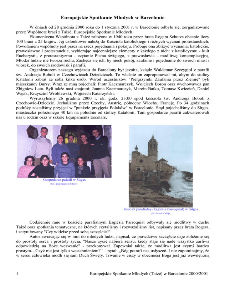 Europejskie Spotkanie Młodych w Barcelonie W dniach od 28 grudnia 2000 roku do 1 stycznia 2001 r. w Barcelonie odbyło się, zorganizowane przez Wspólnotę braci z Taizé, Europejskie Spotkanie Młodych. Ekumeniczna Wspólnota z Taizé założona w 1940 roku przez brata Rogera Schutza obecnie liczy 100 braci z 25 krajów. Jej członkowie należą do Kościoła katolickiego i różnych wyznań protestanckich. Powołaniem wspólnoty jest praca na rzecz pojednania i pokoju. Próbuje ona zbliżyć wyznania: katolickie, prawosławne i protestanckie, wybierając najcenniejsze elementy z każdego z nich: z katolicyzmu - kult Eucharystii, z protestantyzmu - czytanie Pisma świętego, z prawosławia - modlitwę kontemplacyjną. Młodzi ludzie nie tworzą ruchu. Zachęca się ich, by nieśli pokój, zaufanie i pojednanie do swoich miast i wiosek, do swoich środowisk i parafii. Organizatorem naszego wyjazdu do Barcelony był jezuita, ksiądz Waldemar Szczygioł z parafii św. Andrzeja Boboli w Czechowicach-Dziedzicach. To właśnie on zaproponował mi, abym do stolicy Katalonii zabrał ze sobą kilka osób. Wśród uczestników "Pielgrzymki Zaufania przez Ziemię" byli mieszkańcy Bursy. Wraz ze mną pojechali: Piotr Kaczmarczyk, Wojciech Boroń oraz wychowawca pan Zbigniew Łata. Byli także nasi znajomi: Joanna Kaczmarczyk, Marcin Batko, Tomasz Kwiecień, Daniel Wąsik, Krzysztof Wróblewski, Wojciech Katarzyński. Wyruszyliśmy 26 grudnia 2000 r. ok. godz. 23:00 spod kościoła św. Andrzeja Boboli z Czechowic-Dziedzic. Jechaliśmy przez Czechy, Austrię, północne Włochy, Francję. Po 34 godzinach podróży zostaliśmy przyjęci w "punkcie przyjęcia Polaków" w Barcelonie. Stąd pojechaliśmy do Sitges, miasteczka położonego 40 km na południe od stolicy Katalonii. Tam gospodarze parafii zakwaterowali nas u rodzin oraz w szkole Equipaments Escolars. Gospodarze pafafii w Sitges (fot. gospodarze z Sitges) Kościół parafialny (Església Parroquial) w Sitges (fot. Marek Odój) Codziennie rano w kościele parafialnym Església Parroquial odbywały się modlitwy w duchu Taizé oraz spotkania tematyczne, na których czytaliśmy i rozważaliśmy list, napisany przez brata Rogera, i zatytułowany "Czy widzisz przed sobą szczęście?". Autor zwracając się w nim do młodych ludzi, napisał, że prawdziwe szczęście daje zbliżanie się do prostoty serca i prostoty życia. "Nasze życie nabiera sensu, kiedy staje się nade wszystko żarliwą odpowiedzią na Boże wezwanie" - przekonywał. Zapewniał także, że modlitwa jest czymś bardzo prostym. „Czyż nie jest tylko westchnieniem?” – pytał. „Bóg potrafi nas usłyszeć. I nie zapominajmy, że w sercu człowieka modli się sam Duch Święty. Trwanie w ciszy w obecności Boga jest już wewnętrzną 1 Europejskie Spotkanie Młodych (Taizé) w Barcelonie 2000/2001 gotowością otwartą na kontemplację". Na koniec brat Roger podkreślił, że "szczęście jest w pokornym dawaniu siebie". I myśl tę przyjęliśmy jako przesłanie listu. Modlitwa w hali (fot. Michał Górka) Brat Roger (fot. Michał Górka) W halach Fira de Barcelona odbywały się spotkania modlitewne. Po ich zakończeniu większość wolnego czasu poświęcaliśmy na zwiedzanie Barcelony. W Sitges urządzaliśmy także różne imprezy m. in. wyjście do pałacu Palau Maricel, muzeum Museu Maricel de Mar oraz mecz piłki nożnej na boisku szkolnym. W rywalizacji sportowej odnieśliśmy sukces. Reprezentacja Bursy (w składzie: ja, Piotrek i pan Zbyszek) pokonała swych przeciwników (w składzie: dwóch mężczyzn i sympatyczna studentka). Wygraliśmy 7:6. Widok z Pałacu Maricel w Sitges Widok na plażę w Sitges (fot. Michał Górka) (fot. Michał Górka) W Pałacu Maricel w Sitges (fot. Michał Górka) Katedra La Sagrada Família w Barcelonie (fot. W. Boroń, M. Batko, T. Kwiecień, D. Wąsik) 2 Europejskie Spotkanie Młodych (Taizé) w Barcelonie 2000/2001 Sylwestrowy wieczór spędziliśmy w Sitges. Najpierw poszliśmy do kościoła Ermita de Sant Sebastià na czuwanie modlitewne, by modlić się o pokój na świecie. Nowy Rok witaliśmy na plaży, a około godz. 0:30 poszliśmy na zabawę do lokalu wynajętego przez gospodarzy parafii. Europejskie Spotkanie Młodych zakończyło się w Nowy Rok uroczystą Mszą św. w Església Parroquial i obiadem u przyjmujących pielgrzymów. O godz. 18:00 spod stadionu F.C. Barcelona wyruszyliśmy w powrotną podróż. Spotkanie animatorów w Sitges (fot. Michał Górka) Obiad u rodziny Forns-Fusté w Sitges (fot. Michał Górka) Europejskie Spotkanie Młodych pokazało, że modlitwa jednoczy wielu ludzi. Wielkie wrażenie robiły spotkania podczas, których rozważano słowa brata Rogera. To wspaniałe uczucie, niezapomniane wrażenie, gdy kilka lub kilkanaście tysięcy osób śpiewa i modli się w atmosferze kanonów z Taizé. Michał Górka (Artykuł znajduje się również na stronie internetowej http://www.mgorka.prv.pl) marzec 2001 – 17.04.2004 3 Europejskie Spotkanie Młodych (Taizé) w Barcelonie 2000/2001
