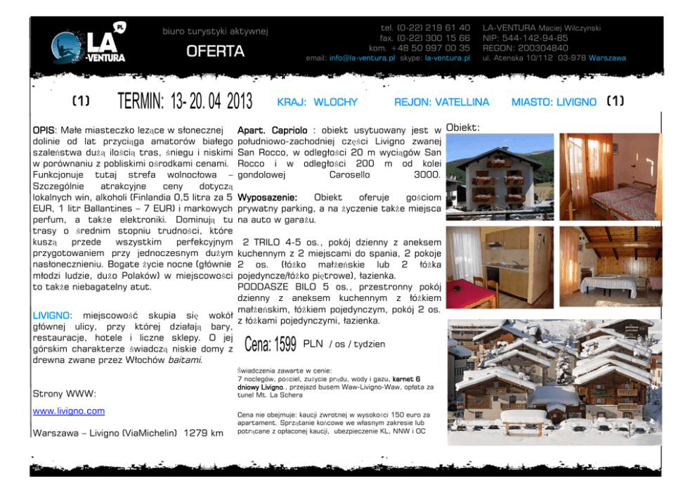 tel. (0-22) 219 61 40 fax. (0-22) 300 15 66 kom. +48 50 997 00 35 biuro turystyki aktywnej OFERTA (1) email: [email protected] skype: la-ventura.pl TERMIN: 13- 20. 04 2013 OPIS: Małe miasteczko lezące w słonecznej dolinie od lat przyciąga amatorów białego szaleństwa dużą ilością tras, śniegu i niskimi w porównaniu z pobliskimi ośrodkami cenami. Funkcjonuje tutaj strefa wolnocłowa – Szczególnie atrakcyjne ceny dotyczą lokalnych win, alkoholi (Finlandia 0,5 litra za 5 EUR, 1 litr Ballantines – 7 EUR) i markowych perfum, a także elektroniki. Dominują tu trasy o średnim stopniu trudności, które kuszą przede wszystkim perfekcyjnym przygotowaniem przy jednoczesnym dużym nasłonecznieniu. Bogate życie nocne (głównie młodzi ludzie, dużo Polaków) w miejscowości to także niebagatelny atut. KRAJ: WLOCHY Apart. Capriolo : obiekt usytuowany jest w Obiekt: południowo-zachodniej części Livigno zwanej San Rocco, w odległości 20 m wyciągów San Rocco i w odległości 200 m od kolei gondolowej Carosello 3000. Wyposazenie: Obiekt oferuje gościom prywatny parking, a na życzenie także miejsca na auto w garażu. Cena: 1599 www.livigno.com Warszawa – Livigno (ViaMichelin) 1279 km ul. Atenska 10/112 03-978 Warszawa REJON: VATELLINA 2 TRILO 4-5 os., pokój dzienny z aneksem kuchennym z 2 miejscami do spania, 2 pokoje 2 os. (łóżko małżeńskie lub 2 łóżka pojedyncze/łóżko piętrowe), łazienka. PODDASZE BILO 5 os., przestronny pokój dzienny z aneksem kuchennym z łóżkiem małżeńskim, łóżkiem pojedynczym, pokój 2 os. LIVIGNO: miejscowość skupia się wokół z łóżkami pojedynczymi, łazienka. głównej ulicy, przy której działają bary, restauracje, hotele i liczne sklepy. O jej Cena: 1599 PLN / os / tydzien górskim charakterze świadczą niskie domy z drewna zwane przez Włochów baitami. Strony WWW: LA-VENTURA Maciej Wilczynski NIP: 544-142-94-85 REGON: 200304840 Świadczenia zawarte w cenie: 7 noclegów, pościel, zużycie prądu, wody i gazu, karnet 6 dniowy Livigno., przejazd busem Waw-Livigno-Waw, opłata za tunel Mt. La Schera Cena nie obejmuje: kaucji zwrotnej w wysokości 150 euro za apartament. Sprzątanie końcowe we własnym zakresie lub potrącane z opłaconej kaucji, ubezpieczenie KL, NNW i OC MIASTO: LIVIGNO (1) czarne: 20 km czerwone: 55 km niebieskie: 40 km Razem: 115 km