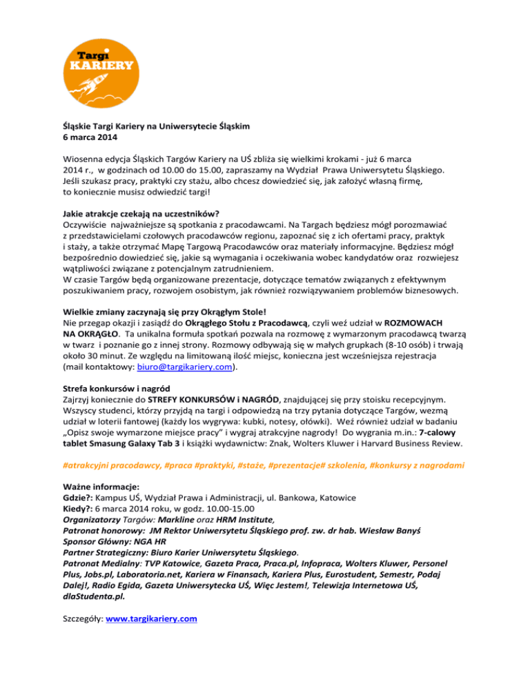 Śląskie Targi Kariery na Uniwersytecie Śląskim 6 marca 2014 Wiosenna edycja Śląskich Targów Kariery na UŚ zbliża się wielkimi krokami - już 6 marca 2014 r., w godzinach od 10.00 do 15.00, zapraszamy na Wydział Prawa Uniwersytetu Śląskiego. Jeśli szukasz pracy, praktyki czy stażu, albo chcesz dowiedzieć się, jak założyć własną firmę, to koniecznie musisz odwiedzić targi! Jakie atrakcje czekają na uczestników? Oczywiście najważniejsze są spotkania z pracodawcami. Na Targach będziesz mógł porozmawiać z przedstawicielami czołowych pracodawców regionu, zapoznać się z ich ofertami pracy, praktyk i staży, a także otrzymać Mapę Targową Pracodawców oraz materiały informacyjne. Będziesz mógł bezpośrednio dowiedzieć się, jakie są wymagania i oczekiwania wobec kandydatów oraz rozwiejesz wątpliwości związane z potencjalnym zatrudnieniem. W czasie Targów będą organizowane prezentacje, dotyczące tematów związanych z efektywnym poszukiwaniem pracy, rozwojem osobistym, jak również rozwiązywaniem problemów biznesowych. Wielkie zmiany zaczynają się przy Okrągłym Stole! Nie przegap okazji i zasiądź do Okrągłego Stołu z Pracodawcą, czyli weź udział w ROZMOWACH NA OKRĄGŁO. Ta unikalna formuła spotkań pozwala na rozmowę z wymarzonym pracodawcą twarzą w twarz i poznanie go z innej strony. Rozmowy odbywają się w małych grupkach (8-10 osób) i trwają około 30 minut. Ze względu na limitowaną ilość miejsc, konieczna jest wcześniejsza rejestracja (mail kontaktowy: [email protected]). Strefa konkursów i nagród Zajrzyj koniecznie do STREFY KONKURSÓW i NAGRÓD, znajdującej się przy stoisku recepcyjnym. Wszyscy studenci, którzy przyjdą na targi i odpowiedzą na trzy pytania dotyczące Targów, wezmą udział w loterii fantowej (każdy los wygrywa: kubki, notesy, ołówki). Weź również udział w badaniu „Opisz swoje wymarzone miejsce pracy” i wygraj atrakcyjne nagrody! Do wygrania m.in.: 7-calowy tablet Smasung Galaxy Tab 3 i książki wydawnictw: Znak, Wolters Kluwer i Harvard Business Review. #atrakcyjni pracodawcy, #praca #praktyki, #staże, #prezentacje# szkolenia, #konkursy z nagrodami Ważne informacje: Gdzie?: Kampus UŚ, Wydział Prawa i Administracji, ul. Bankowa, Katowice Kiedy?: 6 marca 2014 roku, w godz. 10.00-15.00 Organizatorzy Targów: Markline oraz HRM Institute, Patronat honorowy: JM Rektor Uniwersytetu Śląskiego prof. zw. dr hab. Wiesław Banyś Sponsor Główny: NGA HR Partner Strategiczny: Biuro Karier Uniwersytetu Śląskiego. Patronat Medialny: TVP Katowice, Gazeta Praca, Praca.pl, Infopraca, Wolters Kluwer, Personel Plus, Jobs.pl, Laboratoria.net, Kariera w Finansach, Kariera Plus, Eurostudent, Semestr, Podaj Dalej!, Radio Egida, Gazeta Uniwersytecka UŚ, Więc Jestem!, Telewizja Internetowa UŚ, dlaStudenta.pl. Szczegóły: www.targikariery.com