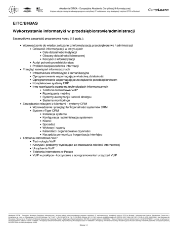 Akademia EITCA - Europejska Akademia Certyfikacji Informatycznej Krajowa edycja międzynarodowego programu certyfikacji IT realizowana przy akredytacji Instytutu EITCI w Brukseli EITC/BI/BAS Wykorzystanie informatyki w przedsiębiorstwie/administracji Szczegółowa zawartość programowa kursu (15 godz.): Wprowadzenie do wiedzy związanej z informatyzacją przedsiębiorstwa / administracji Celowość informatyzacji w instytucjach Cele działalności instytucji Obszary działalności biznesowej Korzyści z informatyzacji Audyt potrzeb przedsiębiorstwa Problem bezpieczeństwa informacji Przegląd rozwiązań informatycznych Infrastruktura informacyjna i komunikacyjna Oprogramowanie wspomagające właściwą działalność Oprogramowanie wspomagające zarządzanie przedsiębiorstwem Kompleksowe systemy ERP Inne rozwiązania oparte na technologiach informatycznych Telefonia Internetowa VoIP Rozwiązania mobilne Systemy autoryzacji i kontroli dostępu Systemy monitoringu Zarządzanie relacjami z klientami – systemy CRM Wprowadzenie i przegląd funkcjonalności systemów CRM System vTiger CRM Instalacja systemu Konfiguracja i administracja systemem Klienci Sprzedaż Wykresy i raporty Kalendarz i organizowanie czynności Narzędzia pomocnicze i organizacja interfejsu Telefonia internetowa VoIP Technologia VoIP Korzyści i problemy wynikające ze stosowania telefonii internetowej Urządzenia VoIP Telefonia internetowa w Polsce VoIP w praktyce - korzystanie z oprogramowania i urządzeń VoIP Akademia EITCA - Europejska Akademia Certyfikacji Informatycznej | Krajowa edycja międzynarodowego programu certyfikacji IT realizowana przy akredytacji Instytutu EITCI w Brukseli | Informatyczne Centrum Szkoleniowe CompLearn | CompSecur sp. z o.o., ul. Piłsudskiego 74, 50-020 Wrocław | Tel: 79 457 14 69, 53 542 13 74, Fax: 71 722 8049, Infolinia: 801 011 647 | eitca.pl, [email protected] | REGON: 020713664, NIP: 897-173-92-49, KRS: 0000303601 Sąd Rejonowy dla Wrocławia-Fabrycznej we Wrocławiu VI Wydział Gospodarczy Krajowego Rejestru Sądowego | Kapitał zakładowy: 500 000 zł, kapitał wpłacony: 500 000 zł | Wpis do Rejestru Instytucji Szkoleniowych nr 2.02/00147/2009 | Licencja certyfikacyjna i akredytacja EITCI nr EITCI-LID-PL-11080001 | Akredytacja Szkoleniowa Polskiej Agencji Rozwoju Przedsiębiorczości nr 1588/2007 | Akredytacja Ministerstwa Edukacji Narodowej przez Kuratora Oświaty nr 8/2014 | Certyfikat zarządzania jakością ISO 9001:2008 nr 8242 (akredytacja UKAS) Strona 1/1 Powered by TCPDF (www.tcpdf.org)