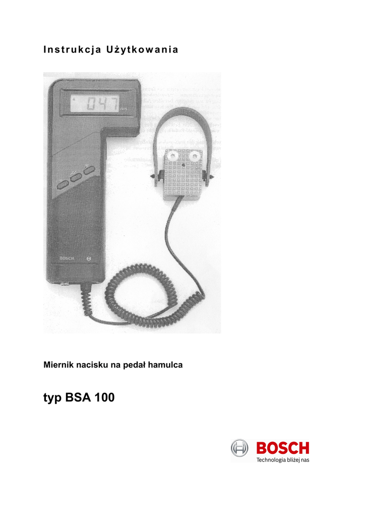 Instrukcja UŜytkow ania Miernik nacisku na pedał hamulca typ BSA 100 -2- Spis treści Strona 1. 2. 3. Wskazówki dla uŜytkownika Przeznaczenie i zakres stosowania przyrządu Opis budowy i działania przyrządu 3.1 Czujnik pomiarowy nacisku 3.2 Sterownik z wyświetlaczem LCD 4. Pomiary 4.1 Przygotowanie do pomiaru 4.2 Przebieg pomiaru 4.3 Pomiar siły na dźwigni hamulca postojowego 4.4 Współpraca przyrządu BSA 100 z urządzeniami rolkowymi BSA 332N i BSA 305 5. Dane techniczne 6. Zakres dostawy 6.1 WyposaŜenie podstawowe 6.2 WyposaŜenie dodatkowe 7. Konserwacja 8. Sprawdzanie dokładności pomiaru przyrządu 9. Zasady bhp 10. Gwarancja i serwis -3- 5 5 5 5 6 6 6 6 6 6 6 7 7 7 7 7 7 7 -4- 1. Wskazówki dla uŜytkownika Niniejsza instrukcja obsługi jest przeznaczona dla personelu obsługującego urządzenie rolkowe do pomiaru sił hamujących oraz dla personelu kierowniczego obsługujących. Personel obsługujący urządzenie stanowią osoby wprowadzone w zagadnienia techniki pojazdowej. Muszą być oni przeszkoleni w obsłudze urządzenia do pomiaru sił hamujących, np. przez przeszkolenie w firmie przedstawiciela producenta w Polsce. Personel kierowniczy odpowiada za warunki pracy urządzenia do badania hamulców (np. zapobieganie wypadkom, sprawdzanie urządzenia itd.). 2. Przeznaczenie i zakres stosowania przyrządu Miernik typ BSA 100 słuŜy do pomiaru siły nacisku na pedał hamulca w pojazdach samochodowych podczas urzędowej kontroli hamulców w stacjach kontroli pojazdów. Przyrząd ten moŜe współpracować z urządzeniami rolkowymi do pomiaru sił hamujących typ BSA 332N i BSA 305 Bosch. 3. Opis budowy i działania przyrządu Na rysunku zestawieniowym nr 1 przedstawione są części składowe miernika siły nacisku na pedał hamulca BSA 100. Przyrząd ten składa się z czujnika tensometrycznego pomiaru siły nacisku (poz. A) oraz sterownika z wyświetlaczem ciekłokrystalicznym (poz. B), połączonych spiralnym kablem. Wszystkie elementy konstrukcyjne oznaczone są numerami, których objaśnienie jest podane w legendzie pod rysunkiem. W dalszym tekście instrukcji dany element jest oznaczony tym samym, umieszczonym w nawiasach okrągłych ( ) numerem. A. Czujnik tensometryczny pomiaru siły nacisku B. Sterownik z wyświetlaczem LCD 1. zapamiętywanie maksymalnej siły na pedale hamulca – symbol przycisku 2. zerowanie przyrządu – symbol przycisku 3. włączanie zasilania przyrządu – symbol przycisku 4. gniazdo przyłączeniowe przewodu połączeniowego z zespołem sterująco-pomiarowym urządzenia rolkowego do pomiaru sił hamujących Rys.1 Miernik nacisku na pedał hamulca 3.1 Czujnik pomiarowy nacisku Czujnik pomiarowy siły nacisku (poz. A) posiada spiralny kabel słuŜący do połączenia ze sterownikiem. Kabel ten przekazuje impulsy z czujnika pomiarowego do sterownika z wyświetlaczem. Do pomiaru siły nacisku wykorzystana została metoda tensometryczna DMS. Dostarczana wraz z czujnikiem specjalna taśma gumowa zapewnia szybkie i pewne zamocowanie czujnika na pedale hamulca. -5- 3.2 Sterownik z wyświetlaczem LCD Sterownik (poz. B) zaopatrzony jest w wyświetlacz LCD o wysokości znaków 18 mm, który zapewnia łatwy i pewny odczyt mierzonych wartości. Siła wskazywana jest w jednostkach dekaniuton [daN]. Pełna obsługa sterownika następuje przy uŜyciu jedynie trzech przycisków, których symboliczne oznaczenie oraz funkcje podano na rys 1. Sterownik zasilany jest bateriami niklowo-kadmowymi (dostępne jako wyposaŜenie dodatkowe nr kat. 1 687 335 002) lub bezpośrednio z urządzenia rolkowego BSA 332N lub BSA 305 firmy Bosch, poprzez kabel połączeniowy o nr kat. 1 684 465 298. Konstrukcja sterownika jak i jego ergonomiczny kształt zapewniają prawidłowe wykonanie pomiarów z miejsca kierowcy badanego pojazdu przez jednego operatora. Sterownik posiada osłonę gumową zabezpieczającą przed uszkodzeniami mechanicznymi, smarami, olejami i zapyleniem. 4. Pomiary 4.1 Przygotowanie do pomiaru Czujnik pomiarowy nacisku połoŜyć na pedale hamulca (czarną gumową nakładką skierowaną do góry) i przymocować za pomocą gumowej taśmy dostarczanej wraz z miernikiem. Przyrząd włącza się przez naciśnięcie przycisku (3). (2) do chwili, gdy na wyświetlaczu Zerowanie przyrządu przeprowadza się, wciskając przycisk pojawi się komunikat "000". Wyświetlenie maksymalnej siły na pedale hamulca jest moŜliwe po uaktywnieniu automatycznej funkcji pamięci poprzez wciśnięcie przycisku (1) – na wyświetlaczu pojawia się wtedy symbol ∆). Uwaga: Po uaktywnieniu automatycznej funkcji pamięci nie naleŜy przeprowadzać zerowania przyrządu (moŜliwość wystąpienia błędów w pomiarach). 4.2 Przebieg pomiaru Po przyłoŜeniu siły do pedału hamulca z nałoŜonym czujnikiem pomiarowym na wyświetlaczu LCD sterownika zostaje wyświetlona aktualna wartość siły. Przy uaktywnieniu automatycznej pamięci zostaje zapamiętana i wyświetlona maksymalna wartość siły na pedale hamulca. 4.3 Pomiar siły na dźwigni hamulca postojowego Siła na dźwigni, uruchamiająca hamulec postojowy, moŜe być pomierzona przy zastosowaniu dodatkowej dźwigni (nr kat. 1 688 040 240). W tym przypadku czujnik pomiarowy przymocowany jest do dolnej i górnej części tej dźwigni za pomocą dwóch śrub. 4.4 Współpraca przyrządu BSA 100 z urządzeniami rolkowymi BSA 332N i BSA 305 Zasilanie przyrządu BSA 100 następuje poprzez kabel połączeniowy (nr kat. 1 684 465 298), który jest podłączony do lewego gniazda przyrządu sterującego (poz.4 na rys1.). Maksymalna wartość siły na pedale hamulca jest zapamiętywana przez zespół sterująco-pomiarowy urządzenia rolkowego i jest wydrukowana na protokole badań. Przebieg pomiaru zgodnie z opisem w punktach: 3.1, 3.2 i 3.3. 5. Dane techniczne Rodzaj wyświetlacza Zakres pomiarowy nacisku Rozdzielczość wskazań Dokładność pomiaru Zakres temperatury pracy Ciśnienie powietrza Wilgotność względna daN da