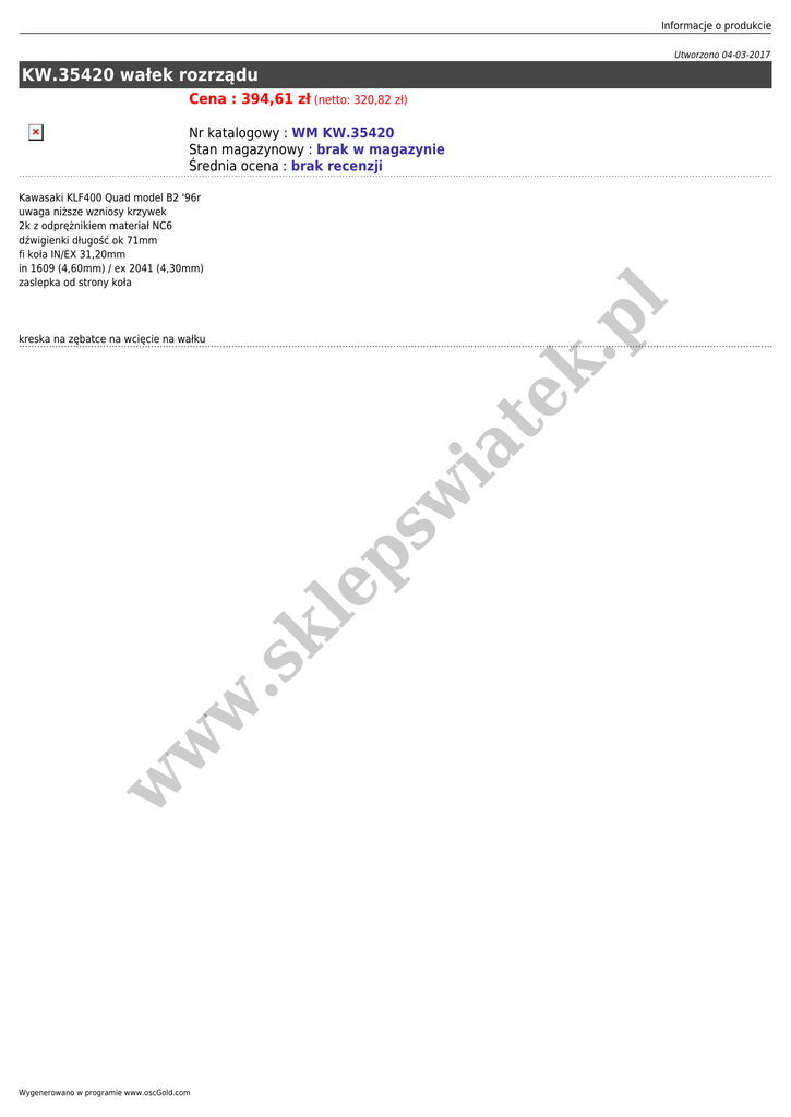 Informacje o produkcie Utworzono 04-03-2017 KW.35420 wałek rozrządu Cena : 394,61 zł (netto: 320,82 zł) Nr katalogowy : WM KW.35420 Stan magazynowy : brak w magazynie Średnia ocena : brak recenzji w w w .s kl ep sw ia kreska na zębatce na wcięcie na wałku te k. pl Kawasaki KLF400 Quad model B2 '96r uwaga niższe wzniosy krzywek 2k z odprężnikiem materiał NC6 dźwigienki długość ok 71mm fi koła IN/EX 31,20mm in 1609 (4,60mm) / ex 2041 (4,30mm) zaslepka od strony koła Wygenerowano w programie www.oscGold.com