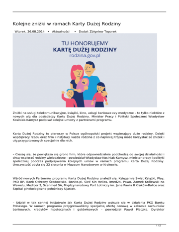 Kolejne zniżki w ramach Karty Dużej Rodziny Wtorek, 26.08.2014 • Aktualności • Dodał: Zbigniew Toporek Zniżki na usługi telekomunikacyjne, książki, kino, usługi bankowe czy medyczne – to tylko niektóre z nowych ulg dla posiadaczy Karty Dużej Rodziny. Minister Pracy i Polityki Społecznej Władysław Kosiniak-Kamysz podpisał kolejne umowy z partnerami programu. Karta Dużej Rodziny to pierwszy w Polsce ogólnopolski projekt wspierający duże rodziny. Dzięki współpracy rządu oraz firm i instytucji każda rodzina z co najmniej trójką może korzystać ze zniżek i ulg przygotowanych specjalnie dla nich. – Cieszę się, że powiększa się grono firm, które odpowiedzialnie podchodzą do swojej działalności i chcą wspierać rodziny wielodzietne – powiedział Władysław Kosiniak-Kamysz, minister pracy i polityki społecznej podczas podpisywania kolejnych umów w ramach programu Karta Dużej Rodziny. Uroczystość obyła się 22 sierpnia w Muzeum Narodowym w Krakowie. Wśród nowych Partnerów programu Karta Dużej Rodziny znaleźli się: Księgarnie Świat Książki, Play, PKO BP, Bank Ochrony Środowiska, Bonito.pl, Sieć Kin Helios, Imed24, Pawo, Zamek Królewski na Wawelu, Medicor 3, Scanmed SA, Międzynarodowy Port Lotniczy im. Jana Pawła II Kraków-Balice oraz Szpital ginekologiczno-położniczy Ujastek. – Udział w tak cennej inicjatywie jak Karta Dużej Rodziny wpisuje się w działania PKO Banku Polskiego. W ramach programu przygotowaliśmy specjalną ofertę cenową w zakresie rachunków bankowych, kredytów hipotecznych i gotówkowych – powiedział Paweł Placzke, Dyrektor 1/2 Departamentu Produktów Klienta Indywidualnego z PKO Banku Polskiego. – Przygotowujemy dla dużych rodzin możliwość korzystania z oferty dostępnej na www.swiatksiazki.pl. To dobre rozwiązanie także dla tych, którzy mieszkają w mniejszych miejscowościach i nie mogą przyjść do stacjonarnych Księgarń Świat Książki – powiedział Janusz Mazurowski prezes firmy Dressler, właściciel Księgarni Świat Książki oraz sklepu internetowego www.swiatksiazki.pl. – Bardzo cieszy mnie, że dzięki nowym zniżkom rodziny będą mogły skorzystać z rabatów na książki i podręczniki. To ważne ponieważ za chwilę rozpoczyna się rok szkolny. Mam nadzieję, że już niebawem spotkamy się w podobnych okolicznościach i podpiszemy kolejne umowy. Dzięki coraz szerszemu zakresowi zniżek z wielu branż wpływamy na realną pomoc rodzinom wielodzietnym. Wierzę, że ten kolejny krok, który dziś postawiliśmy zainspiruje kolejne firmy do włączenia się w pomoc rodzinom – powiedział minister Kosiniak-Kamysz. Karta Dużej Rodziny przyznawana jest każdemu członkowi rodziny, także rodzinom zastępczym i rodzinnym domom dziecka. Rodzicom karta wydawana jest dożywotnio, dzieciom do ukończenia 18 lub 25 lat w przypadku kontynuowania nauki. Osoby niepełnosprawne otrzymają kartę na czas trwania orzeczenia o niepełnosprawności. Karta przyznawana jest bezpłatnie i bez względu na dochód. W ciągu najbliższych lat z Karty może korzystać 3,4 mln osób, w tym 2 mln dzieci. Lista zniżek dostępna jest na stronie: www.rodzina.gov.pl źródło: http://www.mpips.gov.pl 2/2 Powered by TCPDF (www.tcpdf.org)