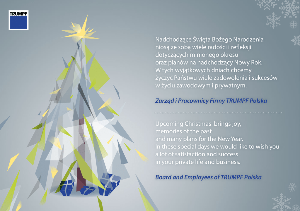 Nadchodzące Święta Bożego Narodzenia niosą ze sobą wiele radości i refleksji dotyczących minionego okresu oraz planów na nadchodzący Nowy Rok. W tych wyjątkowych dniach chcemy życzyć Państwu wiele zadowolenia i sukcesów w życiu zawodowym i prywatnym. Zarząd i Pracownicy Firmy TRUMPF Polska Upcoming Christmas brings joy, memories of the past and many plans for the New Year. In these special days we would like to wish you a lot of satisfaction and success in your private life and business. Board and Employees of TRUMPF Polska