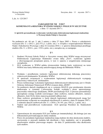 Wyższa Szkoła Policji w Szczytnie Szczytno, dnia 13 stycznia 2017 r. L.dz. A- 125/2017 ZARZĄDZENIE NR 5/2017 KOMENDANTA-REKTORA WYŻSZEJ SZKOŁY POLICJI W SZCZYTNIE z dnia 13 stycznia 2017 r. w sprawie personalizacji, wydawania i użytkowania elektronicznej legitymacji studenckiej w Wyższej Szkole Policji w Szczytnie Na podstawie art. 66 ust. 2, pkt 3 ustawy z dnia 27 lipca 2005 r. Prawo o szkolnictwie wyższym (Dz. U. z 2012 r., poz.572 j.t. z późn. zm.) w związku z rozporządzeniem Ministra Nauki i Szkolnictwa Wyższego z dnia 16 września 2016 r. w sprawie dokumentacji przebiegu studiów (Dz. U. z 2016 r., poz. 1554 z późn. zm.), zarządza się, co następuje: § 1. 1. 2. 1. 2. 3. 4. 5. 6. 1. 2. Studenci Wyższej Szkoły Policji w Szczytnie zwanej dalej WSPol mogą otrzymywać Elektroniczne Legitymacje Studenckie zwane dalej „ELS”, wydawane zgodnie z obowiązującymi przepisami prawa, w tym w oparciu o uregulowania niniejszego zarządzenia. ELS wydawane w WSPol pełnią równocześnie funkcję karty wejściowej na teren WSPol oraz karty bibliotecznej umożliwiającej dostęp do Biblioteki WSPol. § 2. Wydania i przedłużenia ważności legitymacji elektronicznej dokonują pracownicy właściwych dziekanatów Wydziałów WSPol. W sprawach związanych z wydawaniem legitymacji elektronicznych występują pracownicy właściwych dziekanatów. Proces technicznego wykonania legitymacji elektronicznych dokonywany jest w Dziale Ochrony Informacji Niejawnych WSPol zwanym dalej „DOIN”. Na podstawie danych znajdujących się w systemie BAZUS oraz przekazania zlecenia drukowania w systemie („utworzenie kolejki wydruku”) przez uprawnionego pracownika właściwego dziekanatu, DOIN personalizuje ELS. Z procesu personalizacji sporządzane zostają wydruki (zawierające: dane osobowe, numery albumów, numery albumów, ilość ELS), które stanowią protokół odbioru kart. Dane osobowe gromadzone w bazie danych legitymacji elektronicznych mogą być przetwarzane wyłącznie na warunkach określonych w ustawie z dnia 29 sierpnia 1997 r. o ochronie danych osobowych (Dz. U. z 2016 r, Nr 101, poz. 926 j.t., z późn. zm.). Nadzór nad prawidłowym wydawaniem ELS sprawuje Prorektor ds. Studenckich WSPol. § 3. Uprawnionym do otrzymania ELS jest student po immatrykulacji, dla którego jest ona dokumentem poświadczającym status studenta. Prawo do posiadania legitymacji studenckiej mają studenci do dnia ukończenia studiów, zawieszenia w prawach studenta lub skreślenia z listy studentów, zaś w przypadku absolwentów studiów pierwszego stopnia - do dnia 31 października roku ukończenia tych studiów. 3. 4. 5. 6. 1. 2. 1. 2. 3. Student, który utracił status studenta nie ma prawa do posiadania ELS i obowiązany jest do zwrócenia jej Uczelni. Student odbywający studia jednocześnie na więcej niż jednym kierunku posługuje się jedną legitymacją wydaną na właściwym wydziale, na którym wybrał podstawowy kierunek studiów. W przypadku zmiany przez studenta kierunku lub formy studiów niepowodującej zmiany numeru albumu, student posługuje się dotychczas posiadaną ELS. Stosowną adnotację umieszcza się w teczce akt osobowych studenta. Student odbywający jednocześnie studia w innej uczelni ma prawo do otrzymania ELS w WSPol. § 4. ELS dla studentów I roku przygotowywane są po zakończeniu procesu rekrutacyjnego i wręczane studentom po immatrykulacji. Szczegółowe zasady wydawania ELS w takich wypadkach określa procedura stanowiąca załącznik nr 1 do niniejszego zarządzenia. ELS wydawane są dla pozostałych studentów jedynie w przypadku konieczności ponownego wydania ELS lub potrzeby wydania duplikatu. Szczegółowe zasady wydawania ELS w takich wypadkach określa procedura stanowiąca załącznik nr 2 do niniejszego zarządzenia. § 5. W przypadku utraty lub zniszczenia legitymacji wydawany jest jej duplikat tego samego rodzaju: a. studentom, którzy utracili legitymację w wersji papierowej – duplikat w wersji papierowej zawierający oznaczenie właściwe dla duplikatu, b. studentom, którzy utracili legitymację elektroniczną – duplikat legitymacji elektronicznej, zawierający oznaczenie właściwe dla duplikatu. Wydanie nowej edycji legitymacji następuje w przypadku zmiany danych osobowych studenta. W takim wypadku student zwraca starą ELS oraz uiszcza opłatę za wydanie nowej, ustalonej zarządzeniem Komendanta-Rektora w sprawie ustalenia wysokości opłat za dokumenty wydawane studentom i słuchaczom w danym roku akademickim. Studentom, którzy posiadali legitymację w wersji papierowej, w uzasadnionych przypadkach może być wydany oryginał legitymacji w wersji elektronicznej. Decyzję w tej sprawie podejmuje kierownik właściwego dziekanatu. § 6. W przypadku braku technicznej możliwości przedłużenia ważności legitymacji elektronicznej wydawana jest jej nowa edycja, pod warunkiem, że legitymacja elektroniczna nie posiada zewnętrznych znaków wskazujących na uszkodzenie. 1. 2. 3. § 7. Student zobowiązany jest do niezwłocznego zawiadomienia właściwego dziekanatu o zniszczeniu lub utracie ELS oraz o zmianie danych na niej zapisanych. W przypadku wpłynięcia zawiadomienia o zniszczeniu lub utracie ELS przez studenta, kierownik właściwego dziekanatu lub osoba przez niego upoważniona blokuje możliwość korzystania z ELS w systemie BAZUS. Studenci starający się o wydanie duplikatu lub dokonujący wymiany legitymacji w przypadkach, o których mowa w § 6 ust. 1 i § 7 składają we właściwym dziekanacie odpowiedni wniosek, stanowiący załącznik nr 3 do niniejszego zarządzenia wraz z dowodem wpłaty. 1. 2. 1. 2. 3. 1. 2. 3. 1. 2. 1. 2. 3. 4. 1. § 8. Koszty wydania legitymacji, zarówno oryginału jak i „nowej edycji” czy duplikatu, pokrywa student. Opłatę za ELS student wnosi w kwocie określonej obowiązującym zarządzeniem Komendanta – Rektora w sprawie ustalenia wysokości opłat za dokumenty wydawane studento