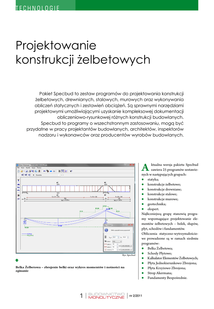 Technologie Projektowanie konstrukcji żelbetowych Pakiet Specbud to zestaw programów do projektowania konstrukcji żelbetowych, drewnianych, stalowych, murowych oraz wykonywania obliczeń statycznych i zestawień obciążeń. Są sprawnymi narzędziami projektowymi umożliwiającymi uzyskanie kompleksowej dokumentacji obliczeniowo-rysunkowej różnych konstrukcji budowlanych. Specbud to programy o wszechstronnym zastosowaniu, mogą być przydatne w pracy projektantów budowlanych, architektów, inspektorów nadzoru i wykonawców oraz producentów wyrobów budowlanych. A Rys. Specbud Belka Żelbetowa – zbrojenie belki oraz wykres momentów i nośności na zginanie ktualna wersja pakietu Specbud zawiera 25 programów zestawionych w następujących grupach: l statyka; l konstrukcje żelbetowe; l konstrukcje drewniane; l konstrukcje stalowe; l konstrukcje murowe; l geotechnika; l ekspert. Najliczniejszą grupę stanowią programy wspomagające projektowanie elementów żelbetowych – belek, słupów, płyt, schodów i fundamentów. Obliczenia statyczno-wytrzymałościowe prowadzone są w ramach siedmiu programów: l Belka Żelbetowa; l Schody Płytowe; l Kalkulator Elementów Żelbetowych; l Płyta Jednokierunkowo Zbrojona; l Płyta Krzyżowo Zbrojona; l Strop Akermana; l Fundamenty Bezpośrednie. nr 2/2011 Technologie Rysunki wykonawcze można tworzyć przy pomocy trzech modułów rysunkowych DXF: l Belka Żelbetowa-Rysunki DXF; l Schody Płytowe-Rysunki DXF; l Fundamenty Bezpośrednie-Rysunki DXF. Program Belka Żelbetowa przeznaczony jest do obliczeń statyczno-wytrzymałościowych belek żelbetowych wieloprzęsłowych o przekroju prostokątnym, teowym lub kątowym. Obliczenia statyczne belki wykonywane są dla wielu przypadków obciążeń i wielu kombinacji oraz ich obwiedni. Program podaje wykresy momentów zginających, sił ścinających i ugięć belki, na tle których prezentowane są wykresy nośności belki na zginanie MRd i na ścinanie VRd. W ramach wymiarowania program ustala potrzebne zbrojenie belki na zginanie i na ścinanie (strzemiona i pręty odgięte), przy uwzględnieniu granicznego ugięcia i zarysowania oraz normowych wymagań konstrukcyjnych. Tworzony jest szkic zbrojenia i poszczególnych wkładek oraz tablica stali zbrojeniowej. Program Schody Płytowe służy do kompleksowego projektowania żelbetowych schodów płytowych. Przeprowadzane są obliczenia statyczne, dla zadeklarowanych obciążeń i ich kombinacji, wyznaczonych automatycznie przez program. Program przeprowadza też wymiarowanie schodów i belek spocznikowych. Dla poszczególnych odcinków płyty dobierane jest zbrojenie na podstawie warunku nośności na zginanie oraz warunków SGU – wielkości rys i ugięcia. Program Kalkulator Elementów Żelbetowych zawiera opcje: słup, belka, płyta, wykres interakcji N-M. Dla elementów o podanej charakterystyce materiałowo-konstrukcyjnej i zadanych obciążeniach (siłach przekrojowych), program ustala zbrojenie z warunków SGN przy zachowaniu normowych warunków konstrukcyjnych, a następnie sprawdza warunki SGU. Analiza różnych przypadków wymiarowania po- Rys. Specbud Schody Płytowe – Rysunki DXF – okno opcji bezpośredniego wydruku rysunku wykonawczego zwala na wariantowanie obliczeń, co umożliwia optymalizację konstrukcji elementów. W grupie programów żelbetowych znajdują się trzy programy PJZ, PKZ i SA, które służą do projektowania prostych stropów żelbetowych jednopolowych. Wykonywane są obliczenia statyczne i wytrzymałościowe oraz szkice zbrojenia. Zadawanie geometrii i obciążeń przebiega sprawnie, a współpraca z modułem obciążeń programu Kalkulator Obciążeń Normowych umożliwia korzystanie z baz obciążeń stałych, zmiennych i klimatycznych oraz baz własnych użytkownika. Rys. Specbud Kalkulatora Elementów Żelbetowych – obliczanie słupa okrągłego ze zbrojeniem uzwojonym nr 2/2011 Technologie Projektowanie fundamentów betonowych i żelbetowych można przeprowadzić przy użyciu programu Fundamenty Bezpośrednie. Program ten wykonuje obliczenia geotechniczno-wytrzymałościowe dla fundamentów posadowionych bezpośrednio na podłożu uwarstwionym. Możliwe jest projektowanie stóp i ław: prostopadłościennych, schodkowych i trapezowych. nieje też możliwość ich wydrukowania oraz zapisywania w formie dokumentu edytora tekstów. Uzupełnieniem możliwości projektowych trzech programów żelbetowych są moduły rysunkowe – Belka Żelbetowa-Rysunki DXF, Schody PłytoweRysunki DXF oraz Fundamenty Bezpośrednie-Rysunki DXF. Moduły te umożliwiają automatyczne stworzenie rysunków wykonawczych elementów Rys. Specbud Fundamenty Bezpośrednie – obliczone zbrojenie stopy schodkowej oraz definiowanie kotew W ramach wymiarowania geotechnicznego przeprowadzane jest sprawdzenie warunków nośności pionowej podłoża, nośności podłoża na obrót i na przesunięcie poziome oraz obliczenie średniej wartości osiadania i zasięgu strefy odrywania podstawy fundamentu od podłoża. Wymiarowanie wytrzymałościowe obejmuje sprawdzenie stanu granicznego nośności na przebicie i wyznaczenie potrzebnego zbrojenia w podstawie fundamentu. We wszystkich programach Specbud wyniki obliczeń otrzymuje się w formie tekstowej, tabelarycznej i rysunkowej, a ich zakres można swobodnie dopasowywać do indywidualnych potrzeb. Ist- żelbetowych – belek i schodów żelbetowych oraz fundamentów bezpośrednich (stóp i ław). Po zakończeniu fazy obliczeniowej, a przed wydrukowaniem rysunku, Użytkownik ma dodatkowo możliwość uzupełnienia treści rysunku o składniki nie wynikające z obliczeń – dodatkowe zbrojenie własne fundamentu, dodatkowe opisy i elementy graficzne (koty wysokościowe, osie konstrukcyjne, opisy poziomów charakterystycznych). Rysunki wykonawcze można uzyskać na dwa sposoby: l wydruk skalowalnego rysunku bezpośrednio z programu obliczeniowego – ułatwia szybką reakcję na zmiany 