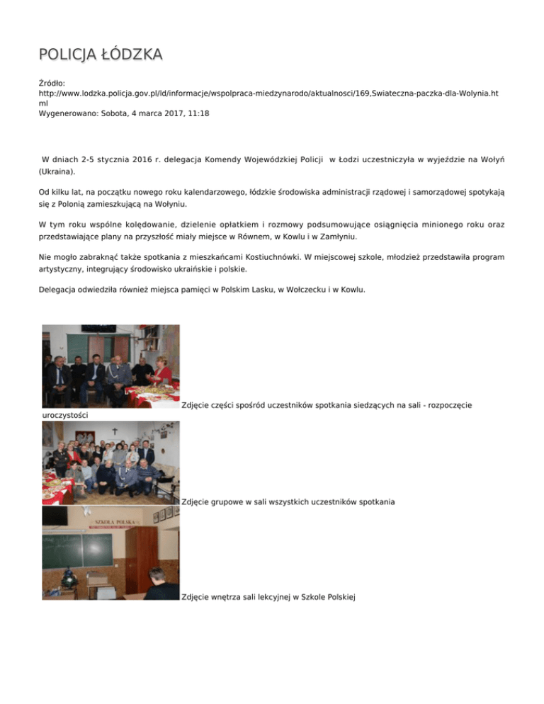 POLICJA ŁÓDZKA Źródło: http://www.lodzka.policja.gov.pl/ld/informacje/wspolpraca-miedzynarodo/aktualnosci/169,Swiateczna-paczka-dla-Wolynia.ht ml Wygenerowano: Sobota, 4 marca 2017, 11:18 W dniach 2-5 stycznia 2016 r. delegacja Komendy Wojewódzkiej Policji w Łodzi uczestniczyła w wyjeździe na Wołyń (Ukraina). Od kilku lat, na początku nowego roku kalendarzowego, łódzkie środowiska administracji rządowej i samorządowej spotykają się z Polonią zamieszkującą na Wołyniu. W tym roku wspólne kolędowanie, dzielenie opłatkiem i rozmowy podsumowujące osiągnięcia minionego roku oraz przedstawiające plany na przyszłość miały miejsce w Równem, w Kowlu i w Zamłyniu. Nie mogło zabraknąć także spotkania z mieszkańcami Kostiuchnówki. W miejscowej szkole, młodzież przedstawiła program artystyczny, integrujący środowisko ukraińskie i polskie. Delegacja odwiedziła również miejsca pamięci w Polskim Lasku, w Wołczecku i w Kowlu. Zdjęcie części spośród uczestników spotkania siedzących na sali - rozpoczęcie uroczystości Zdjęcie grupowe w sali wszystkich uczestników spotkania Zdjęcie wnętrza sali lekcyjnej w Szkole Polskiej Zdjęcie tablicy z pracami plastycznymi dzieci - kolekcja pt. "Polska w moich oczach" Zdjęcie grupowe uczestników imprezy w plenerze przy budynku szkoły Zdjęcie dziecięcej grupy tanecznej (tancerki w strojach ludowych) - ujęcie na korytarzu we wnętrzu bydunku Zdjęcie wspólne przedstawiające całą grupę taneczną wraz z przedstawicielami strony ukraińskiej i polskiej - ujęcie w sali szkolnej Zdjęcie przedstawiające przedstawicieli strony polskiej i ukraińskiej stojących na tle malowidła typu ikonograficznego oraz budynku z cegły Zdjęcie przedstawicieli strony ukraińskiej i polskiej stojących na tle terenu leśnego przed zbiorowym miejscem pamięci Zdjęcie rzędu mogił na cmentarzu - nagrobki o jednakowym wyglądzie i prostej stylistyce Zdjęcie obiektu sakralnego - jasna cerkiew z trzema małymi i dwiema dużymi wieżami Ocena: 0/5 (0) Tweetnij