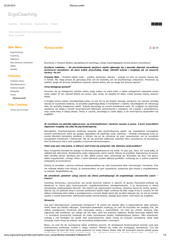 22.05.2012 Wyluzuj szefie ErgoCoaching Coaching Nasi trenerzy ErgoCoaching Kontakt Tylko skuteczność jest miarą sensu naszych działań Vince Lombardi Main Menu Wyluzuj szefie ErgoCoaching Coaching Szkolenia Nasi trenerzy i coachowie Oferta Kontakt Polecamy Ciekawe strony Współpracujemy Ciekawe książki Narzędzia Prasa Wyluzuj szefie Ergo Coaching Umów się na sesję! Rozmowa z François Nailem, specjalistą od coachingu, usługi wspomagającej rozwój kariery zawodowej Krystyna Lubelska: – Do psychoterapeuty pacjenci często zgłaszają się z powodu depresji wywołanej życiowym i porażkam i, do pana ludzie przychodzą, kiedy odnieśli sukces i znajdują się na szczycie kariery. Po co? François Nail: – Problem takich osób – szefów, prezesów, liderów – polega na tym, że zawsze muszą być w formie. Nie mają prawa do gorszego dnia ani do rozterek, ani do psychicznego zmęczenia. Ponieważ są ambitni, gnębi ich jeszcze dodatkowo pytanie: jestem dobry, ale czy mogę być jeszcze lepszy? Chcą dosięgnąć gwiazd? Owszem, bo są inteligentni, bardzo zdolni, mają wpływ na wielu ludzi, a także umiejętność stawiania przed sobą zadań. W ten sposób dotarli na szczyt, więc czują, że mogliby iść dalej, zrobić jeszcze więcej, jeszcze lepiej. Z drugiej strony często uświadamiają sobie, że coś ich na tej drodze hamuje, ponieważ nie zawsze potrafią stanąć na wysokości zadania, na przykład popełniają błędy w kontaktach z ludźmi, nieumiejętnie ich motywują albo nie potrafią delegować zadań. Jednak pozostają ze swoim problemem sami. Ze względu na tajemnicę służbową nie mogą o swoich wewnętrznych kłopotach porozmawiać z kolegami, nie wypada z podwładnymi, więc nadal brną w ślepą uliczkę. Tkwią w rutynie, powielają te same błędy, a ich wewnętrzny dyskomfort się pogłębia. W rezultacie nie potrafią odpoczywać, są zniecierpliwieni i duchem zawsze w pracy. Z tym i wszystkim i objawam i m ogliby się udać do psychoterapeuty. Niezupełnie. Psychoterapeuta analizuje pacjenta jako psychofizyczną całość, nie wyodrębnia szczególnie kwestii zawodowych, które go gnębią. Specjaliści od coachingu (ang. coaching – trening) rozwiązują wraz ze swoim klientem konkretny problem, z którym ma on do czynienia na polu zawodowym, ale ze wszelkimi asocjacjami osobistymi i rodzinnymi. Nie da się przecież całkowicie oddzielić sfery zawodowej od prywatnej, choć ta pierwsza ma w tym wypadku znaczenie pierwszorzędne. Pełni więc pan rolę lustra, w którym szef m oże się przejrzeć, aby dostrzec swój problem ? Nasz wzajemny kontakt nie polega na biernym przypatrywaniu się sobie. To jest gra, mecz. On rzuca piłkę, ja odbijam lub odwrotnie. Wymieniamy myśli, odgrywamy różne scenki. Mówię na przykład: Zaproponuj mi awans albo obniżkę pensji. Słucham, jak to robi, jakich używa słów, prowokuję go. Wszystko się liczy: ton głosu, dobór argumentów, emocje. Wraz z moim klientem szukam słabych punktów, wskazuję je, a potem wspólnie próbujemy je przewalczyć. Dzisiaj na przykład z pewną szefową zastanawialiśmy się nad znaczeniem słów równowaga i harmonia. Ona nie widziała między nimi różnicy, ja wskazywałem, że jest zasadnicza, zwłaszcza gdy chodzi o współdziałanie w zespole. Dogadaliśmy się. Na określenie pańskich usług używa się słowa pochodzącego od angielskiego rzeczownika coach – trener? Coaching biznesowy, rzeczywiście, ma swoje korzenie właśnie w sporcie. W języku francuskim próbuje się tłumaczyć to słowo jako towarzyszenie, współuczestnictwo, akompaniowanie. A ja towarzyszę w takiej introspekcji, podpowiadam kierunki. Tak staram się poprowadzić rozmowę, żebyśmy doszli do sedna sprawy. Zdarza się, że podczas sesji ci wysoko postawieni ludzie nagle rumienią się albo stają im łzy w oczach, bo tak dalece zaskakują sami siebie w postępowaniu z innymi. Nagle jasno jak na dłoni okazuje się, że coś po drodze zgubili, o czymś zapomnieli, zlekceważyli jakąś ważną sprawę. Zadaję dużo pytań, szef może się wygadać. Wreszcie. Zna pani sformułowanie „samotność czempiona”? W próżni nie słychać słów, a odpowiadanie tylko samemu sobie może być bardzo męczące. Tymczasem podwładni oczekują, że szef na wszystko ma receptę, wie, jak należy postępować. Ponieważ jest zazwyczaj osobą z autorytetem, nie chce go utracić. Zaczyna więc odgrywać rolę omnibusa, już nikogo się nie radzi, sam wie przecież najlepiej. Wtedy powstaje błędne koło i w rezultacie pracownicy oczekują od szefa rozwiązania każdej najdrobniejszej sprawy. Albo przeciwnie, unikają z nim kontaktu, bo działa zbyt autorytatywnie. Kiedy osoba na szczycie uzmysławia sobie taką sytuację, może chcieć ją zmienić, ale potrzebuje podpowiedzi z zewnątrz. Bywa, że szef ma do rozwiązania także problemy etyczne. W dzisiejszym korporacyjnym świecie zysk jest podstawową wartością, trzeba o niego walczyć. Metody tej walki też wymagają rozważenia. Czy dla osiągnięcia korzyści dla firmy warto postawić na szalę własne dobre imię lub poświęcić interes jakiejś grupy pracowników? A może lepiej zarobić mniej, ale utrzymać szanowaną pozycję marki? Albo w ogóle nie www.ergocoaching.pl/index.php?option=com_content&view=article&id=53&Itemid=70 1/3 22.05.2012 Wyluzuj szefie pracowników? A może lepiej zarobić mniej, ale utrzymać szanowaną pozycję marki? Albo w ogóle nie przyjmować zbyt ryzykowanego wyzwania, czy może raczej wszystko postawić na jedną kartę? Zagrać va banque? Czy wystarczy, m ówiąc w przenośni, kanapa trenera, aby rozwiązać tego rodzaju problem y? Nie wystarczy, ale pomaga. Czasem, gdy presja jest zbyt duża, ludzie ze szczytów decydują się na rezygnację z kariery korporacyjnej, zakładają własne małe firmy. Też są w nich szefam i. Owszem, ale na bardziej ludzką skalę. Mogą zarządzać własnym cza