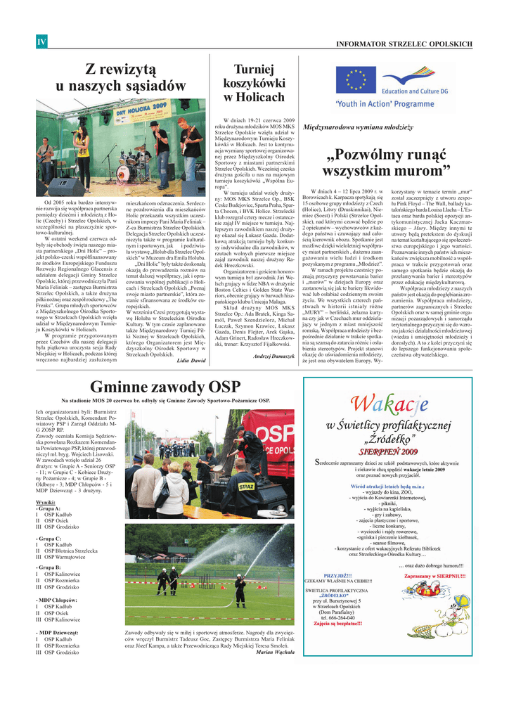 IV INFORMATOR STRZELEC OPOLSKICH Z rewizyt¹ u naszych s¹siadów Od 2005 roku bardzo intensywnie rozwija siê wspó³praca partnerska pomiêdzy dzieæmi i m³odzie¿¹ z Holic (Czechy) i Strzelec Opolskich, w szczególnoci na p³aszczynie sportowo-kulturalnej. W ostatni weekend czerwca odby³y siê obchody wiêta naszego miasta partnerskiego Dni Holic projekt polsko-czeski wspó³finansowany ze rodków Europejskiego Funduszu Rozwoju Regionalnego Glacensis z udzia³em delegacji Gminy Strzelce Opolskie, której przewodniczy³a Pani Maria Feliniak zastêpca Burmistrza Strzelec Opolskich, a tak¿e dru¿yna pi³ki no¿nej oraz zespó³ rockowy The Freaks. Grupa m³odych sportowców z Miêdzyszkolnego Orodka Sportowego w Strzelcach Opolskich wziê³a udzia³ w Miêdzynarodowym Turnieju Koszykówki w Holicach. W programie przygotowanym przez Czechów dla naszej delegacji by³a pi¹tkowa uroczysta sesja Rady Miejskiej w Holicach, podczas której wrêczono najbardziej zas³u¿onym mieszkañcom odznaczenia. Serdeczne pozdrowienia dla mieszkañców Holic przekaza³a wszystkim uczestnikom imprezy Pani Maria Feliniak Z-ca Burmistrza Strzelec Opolskich. Delegacja Strzelec Opolskich uczestniczy³a tak¿e w programie kulturalnym i sportowym, jak i podziwia³a wystawê Holub dla Strzelec Opolskich w Muzeum dra Emila Holuba. Dni Holic by³y tak¿e doskona³¹ okazj¹ do prowadzenia rozmów na temat dalszej wspó³pracy, jak i opracowania wspólnej publikacji o Holicach i Strzelcach Opolskich Poznaj swoje miasto partnerskie, która zostanie sfinansowana ze rodków europejskich. W wrzeniu Czesi przygotuj¹ wystawê Holuba w Strzeleckim Orodku Kultury. W tym czasie zaplanowano tak¿e Miêdzynarodowy Turniej Pi³ki No¿nej w Strzelcach Opolskich, którego Organizatorem jest Miêdzyszkolny Orodek Sportowy w Strzelcach Opolskich. Lidia Dawid Turniej koszykówki w Holicach W dniach 19-21 czerwca 2009 roku dru¿yna m³odzików MOS MKS Strzelce Opolskie wziê³a udzia³ w Miêdzynarodowym Turnieju Koszykówki w Holicach. Jest to kontynuacja wymiany sportowej organizowanej przez Miêdzyszkolny Orodek Sportowy z miastami partnerskimi Strzelec Opolskich. Wczeniej czeska dru¿yna goci³a u nas na majowym turnieju koszykówki Wspólna Europa. W turnieju udzia³ wziê³y dru¿yny: MOS MKS Strzelce Op., BSK Ceske Budejovice, Sparta Praha, Sparta Chocen, i BVK Holice. Strzelecki klub rozegra³ cztery mecze i ostatecznie zaj¹³ IV miejsce w turnieju. Najlepszym zawodnikiem naszej dru¿yny okaza³ siê £ukasz Gazda. Dodatkow¹ atrakcj¹ turnieju by³y konkursy indywidualne dla zawodników, w rzutach wolnych pierwsze miejsce zaj¹³ zawodnik naszej dru¿yny Radek Hreczkowski. Organizatorem i gociem honorowym turnieju by³ zawodnik Jiri Welsch graj¹cy w lidze NBA w dru¿ynie Boston Celtics i Golden State Warriors, obecnie graj¹cy w barwach hiszpañskiego klubu Unicaja Malaga. Sk³ad dru¿yny MOS MKS Strzelce Op.: Ada Bratek, Kinga Samól, Pawe³ Szendzielorz, Micha³ £uczak, Szymon Krawiec, £ukasz Gazda, Denis Flejter, Arek G¹ska, Adam Grinert, Rados³aw Hreczkowski, trener: Krzysztof Fija³kowski. Andrzej Damaszek Gminne zawody OSP Na stadionie MOS 20 czerwca br. odby³y siê Gminne Zawody Sportowo-Po¿arnicze OSP. Ich organizatorami byli: Burmistrz Strzelec Opolskich, Komendant Powiatowy PSP i Zarz¹d Oddzia³u MG ZOSP RP. Zawody ocenia³a Komisja Sêdziowska powo³ana Rozkazem Komendanta Powiatowego PSP, której przewodniczy³ m³. bryg. Wojciech Lisowski. W zawodach wziê³o udzia³ 26 dru¿yn: w Grupie A - Seniorzy OSP - 11; w Grupie C - Kobiece Dru¿yny Po¿arnicze - 4; w Grupie B Oldboye - 3; MDP Ch³opców - 5 i MDP Dziewcz¹t - 3 dru¿yny. Wyniki: - Grupa A: I OSP Kad³ub II OSP Osiek III OSP Grodzisko - Grupa C: I OSP Kad³ub II OSP B³otnica Strzelecka III OSP Warm¹towice - Grupa B: I OSP Kalinowice II OSP Rozmierka III OSP Grodzisko - MDP Ch³opców: I OSP Kad³ub II OSP Osiek III OSP Kalinowice - MDP Dziewcz¹t: I OSP Kad³ub II OSP Rozmierka III OSP Grodzisko Zawody odbywa³y siê w mi³ej i sportowej atmosferze. Nagrody dla zwyciêzców wrêczy³ Burmistrz Tadeusz Goc, Zastêpcy Burmistrza Maria Feliniak oraz Józef Kampa, a tak¿e Przewodnicz¹ca Rady Miejskiej Teresa Smoleñ. Marian W¹cha³a Miêdzynarodowa wymiana m³odzie¿y Pozwólmy run¹æ wszystkim murom W dniach 4 12 lipca 2009 r. w Borowicach k. Karpacza spotykaj¹ siê 15 osobowe grupy m³odzie¿y z Czech (Holice), Litwy (Druskinnikai), Niemiec (Soest) i Polski (Strzelce Opolskie), nad którymi czuwaæ bêdzie po 2 opiekunów wychowawców z ka¿dego pañstwa i czuwaj¹cy nad ca³oci¹ kierownik obozu. Spotkanie jest mo¿liwe dziêki wieloletniej wspó³pracy miast partnerskich , du¿emu zaanga¿owaniu wielu ludzi i rodkom pozyskanym z programu M³odzie¿. W ramach projektu czestnicy poznaj¹ przyczyny powstawania barier i murów w dziejach Europy oraz zastanowi¹ siê jak te bariery likwidowaæ lub os³abiaæ codziennym swoim ¿yciu. We wszystkich czterech pañstwach w historii istnia³y ró¿ne MURY berliñski, ¿elazna kurtyna czy jak w Czechach mur oddzielaj¹cy w jednym z miast mniejszoæ romsk¹. Wspó³praca m³odzie¿y i bezporednie dzia³anie w trakcie spotkania s¹ szans¹ do zatarcia ró¿nic i os³abienia stereotypów. Projekt stanowi okazjê do uwiadomienia m³odzie¿y, ¿e jest ona obywatelem Europy. Wy- korzystany w temacie termin mur zosta³ zaczerpniêty z utworu zespo³u Pink Floyd The Wall, ballady kataloñskiego barda Louisa Llacha LEstaca oraz barda polskiej opozycji antykomunistycznej Jacka Kaczmarskiego Mury. Miêdzy innymi te utwory bêd¹ pretekstem do dyskusji na temat kszta³tuj¹cego siê spo³eczeñstwa europejskiego i jego wartoci. Poznawanie innych pañstw ich mieszkañców zwiêksza mobilnoæ a wspó³praca w trakcie przygotowañ oraz samego spotkania bêdzie okazj¹ do prze³amywania barier i stereotypów przez edukacjê miêdzykulturow¹. Wspó³praca m³odzie¿y z naszych pañstw jest okazj¹ do pog³êbian