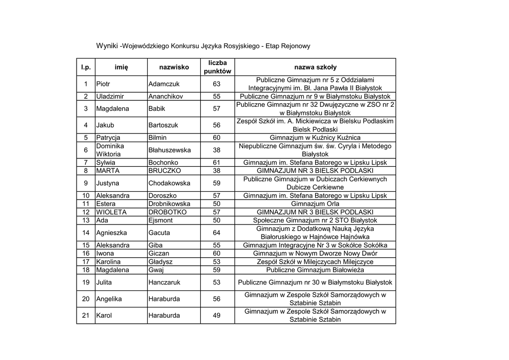 Wyniki -Wojewódzkiego Konkursu Języka Rosyjskiego