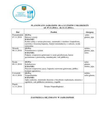 PLANOWANY JADŁOSPIS DLA UCZNIÓW I MŁODZIEŻY od 07.11.2016 r. do 11.11.2016 r. Dni Posiłek Poniedziałek ZUPA: 07.11.2016 Barszcz czysty II DANIE: Kotlet rybny z serem pieczony, ziemniaki z masłem i koperkiem, surówka z kiszonej kapusty, budyń śmietankowy z sokiem, woda mineralna Wtorek ZUPA: 08.11.2016 Pomidorowa z ryżem II DANIE: Pulpety wieprzowe gotowane w sosie grzybowym, kasza jęczmienna z pietruszką, mandarynki, sok jabłkowy Alergeny seler, gluten, jaja Środa 09.11.2016 seler, gluten, mleko, jaja, Czwartek 10.11.2016 Piątek 11.11.2016 ZUPA: Kalafiorowa II DANIE: Pieczeń wieprzowa, pyzy, kapusta czerwona gotowana, jabłko, kompot agrestowy ZUPA: Neapolitańska II DANIE: Jajko sadzone, ziemniaki duszone z boczkiem wędzonym, mizeria z ogórków, sok jabłkowo aroniowy, rogalik Święto Niepodległości ZASTRZEGA SIĘ ZMIANY W JADŁOSPISIE mleko, gluten, jaja, seler, mleko, seler,gluten,