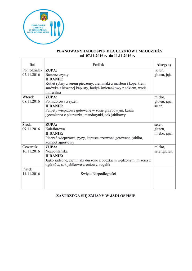 PLANOWANY JADŁOSPIS DLA UCZNIÓW I MŁODZIEŻY od 07.11