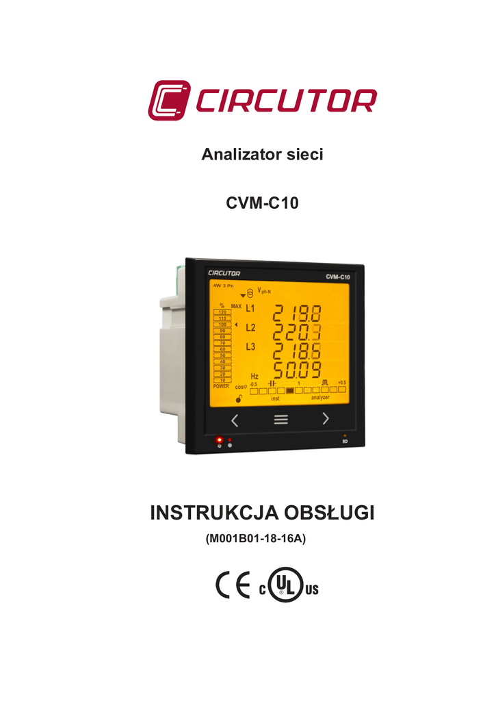Analizator sieci CVM-C10 INSTRUKCJA OBSŁUGI (M001B01-18-16A) CVM-C10 2 Instrukcja obsługi CVM-C10 ZALECENIA DOTYCZĄCE BEZPIECZEŃSTWA Należy postępować zgodnie z ostrzeżeniami podanymi w niniejszej instrukcji za pomocą symboli, które zostały opisane poniżej. NIEBEZPIECZEŃSTWO Ostrzega przed ryzykiem, które może spowodować obrażenia lub szkody materialne. UWAGA Wskazuje, że należy zwrócić szczególną uwagę na wskazany punkt. W przypadku konieczności manipulowania urządzeniem w celu jego instalacji, uruchomienia lub konserwacji, należy mieć na uwadze, że: Nieprawidłowa manipulacja lub instalacja urządzenia może spowodować szkody, zarówno osobowe jak i materialne. W szczególności manipulowanie urządzeniem pod napięciem może spowodować śmierć lub poważne obrażenia na skutek porażenia prądem osoby manipulującej urządzeniem. Ponadto, nieprawidłowa instalacja lub konserwacja wiąże się z ryzykiem pożaru. Przed podłączeniem urządzenia należy dokładnie przeczytać instrukcję. W ciągu całego okresu eksploatacji urządzenia należy przestrzegać wszystkich wskazówek dotyczących jego instalacji i konserwacji. Należy zwłaszcza przestrzegać norm instalacji podanych w Krajowym Kodeksie Elektrycznym. UWAGA Przed rozpoczęciem użytkowania urządzenia zapoznać się z treścią instrukcji Jeśli nie przestrzega się lub nie wykonuje się prawidłowo wskazówek niniejszej instrukcji, oznaczonych tym symbolem, wówczas można spowodować szkody osobowe lub w sprzęcie i/lub w instalacjach. Firma CIRCUTOR SA zastrzega sobie prawo do modyfikacji, bez uprzedniego powiadomienia, charakterystyk lub instrukcji produktu. OGRANICZENIE ODPOWIEDZIALNOŚCI CIRCUTOR SA zastrzega sobie prawo do dokonywania, bez uprzedniego powiadomienia, modyfikacji urządzenia lub specyfikacji sprzętu, podanych w niniejszej instrukcji. CIRCUTOR SA udostępnia swoim klientom najnowsze wersje specyfikacji urządzeń oraz zaktualizowane instrukcje na swojej stronie internetowej. www.circutor.com CIRCUTOR SA zaleca stosowanie oryginalnych kabli i akcesoriów dostarczonych wraz z urządzeniem. Instrukcja obsługi 3 CVM-C10 SPIS TREŚCI ZALECENIA DOTYCZĄCE BEZPIECZEŃSTWA��������������������������������������������������������������������������������������������������� 3 OGRANICZENIE ODPOWIEDZIALNOŚCI������������������������������������������������������������������������������������������������������������� 3 SPIS TREŚCI����������������������������������������������������������������������������������������������������������������������������������������������������������4 HISTORIA KOREKT�����������������������������������������������������������������������������������������������������������������������������������������������6 1.- KONTROLE PRZY ODBIORZE������������������������������������������������������������������������������������������������������������������������� 7 2.- OPIS PRODUKTU��������������������������������������������������������������������������������������������������������������������������������������������� 7 3.- INSTALACJA URZĄDZENIA����������������������������������������������������������������������������������������������������������������������������� 8 3.1.- WSTĘPNE ZALECENIA����������������������������������������������������������������������������������������������������������������������������� 8 3.2.- INSTALACJA���������������������������������������������������������������������������������������������������������������������������������������������� 9 3.3.- ZACISKI URZĄDZENIA����������������������������