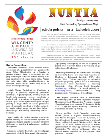 edycja polska nr 4 kwiecień 2009 LOGO 350 ROCZNICY: «Założyciele: św. Wincenty i św. Ludwika zmarli w 1660. Obojgu zarówno w trakcie życia jak i po śmierci Duch Pański ujawniał swoją twórczą moc, pobudzając do życia ruchy i wspólnoty, które w charyzmacie Wincentyńskim widziały trwałą duchowość, wieczną młodość, a przede wszystkim żywą odpowiedź Kościołowi i społeczeństwu. Symbol składa się z 'płomieni' w różnych kolorach, w czterech zestawach, jak cztery horyzonty sugerujące zróżnicowanie świata. Płomienie są tak ułożone by wyobrażały 'gołębia', biblijny symbol Ducha Świętego podobnie jak są nim same płomienie. Płomienie są także symbolem miłosierdzia co przejrzyście widać w godle Sióstr Miłosierdzia. Zwieńczeniem symbolu jest tekst. Najpierw motyw: "Miłosierdzie - Misja" - temat proponowany do rozważań w trakcie Roku Wincentyńskiego. Poniżej są nazwiska Założycieli, 'okres 1660 - 2010', a na końcu 'przyczyna' powstania logo. » (Alexis Cerquera) Kuria Generalna: Ćwiczenia duchowe: Przed końcem marca, wieczorem 29. pojechaliśmy do Quercianella, domu Sióstr Miłosierdzia na wybrzeżu, w pobliżu Livorno. Dom przeznaczony jest dla grup dziecięcych w trakcie letnich wakacji i dla grup rekolekcyjnych przez resztę roku. Pogoda nie była taka, jakiej oczekiwalibyśmy, ale wszystko, nawet deszcz miało swój wkład w naszą modlitwę i refleksję. Ksiądz Matteo Tagliaferri, ze Wspólnoty w Dialogu, z prowincji rzymskiej, prowadził rekolekcje. W prosty sposób, opierając się na 15 latach doświadczenia pomocy młodzieży w trudnościach w stawianiu czoła prawdzie o ich lichym bycie, lecz nieprzerwanie zjednoczonych prawdą o Bogu, który ich kocha, przedstawił nam jak gromadzi młodzież w trudnej sytuacji, by mogła odkryć swoją wartość jako ludzie i doświadczyć prawdziwej, wzajemnej miłości i hojności. Jego krótkie, ale bardzo treściwe rozważania oparte bardziej o doświadczenie życiowe niż przeczytane książki dopełnione zostały otwartym dialogiem o zmroku i zakończone modlitwą Nieszporów. Wdzięczni jesteśmy ks. Matteo za prostotę jego prezentacji, bliskość fraternizacji i świadectwo jego pokory. Zwierzył się, że czuł się tak jakby był pośród braci w swoim domu, a my właśnie tak go odbieraliśmy. Dziękujemy. Przełożony Generalny: Po zakończeniu rekolekcji ze wspólnotą Kurii i po sesji Rady wyjechał do Charlotte w Północnej Karolinie, USA, gdzie spędził Wielki Tydzień pomagając w całkowicie hiszpańskojęzycznej parafii NMP z Gwadelupy, prowadzonej przez konfratrów z Prowincji Wschodniej USA. Witryna Kurii Generalnej cmglobal.org publikuje (w wersji polskiej w Famvin.org Polska) sprawozdanie z misji duszpasterskiej Przełożonego Generalnego. Do Rzymu powrócił rano w Poniedziałek Wielkanocny (13.04) po czym wyjechał z wizytą do Misjonarzy i Sióstr Miłosierdzia Prowicnji Niemiec. Oczekiwaliśmy jego powrotu 30 kwietnia, kiedy NUNTIA był już rękach tłumaczy. Czekamy na wiadomości na temat tej wizyty. Reszta wspólnoty Kurii Generalnej przeżywała Wielki Tydzień w Rzymie. Koncelebrowaliśmy, wraz Ojcem Świętym, Mszę św. Krzyżma, a w liturgii kolejnych dni uczestniczyliśmy w miejscach dla nas najdogodniejszych. Nieobecny był tylko ks. Gérard Du. W Wielki Wtorek wyruszył do Stanów Zjednoczonych na wizytację kanoniczną Prowincji Wschodniej. We wtorek wielkanocny także ks. Manuel Ginete wyleciał do Waszyngtonu, skąd powrócił 27 kwietnia. wszędzie nastrój intensywnej i głębokiej modlitwy by napełnić się Duchem, z którym ci, którzy byli przed Spotkanie w Bejrucie, miało miejsce od 20 do 25 nami, dokonali wędrówki Misji i Miłosierdzia. kwietnia 2009. Ze strony Kurii uczestniczyli w nim ks. José María Nieto, Asystent Generalny i ks. W dalszej kolejności Wizytator mówi o gorączkowych Claudio Santangelo jako tłumacz. przygotowaniach do Drugiego Spotkania Młodych Wincentyńczyków, które ma się odbyć w Escobar w Wizytatorzy przedstawili bieżącą sytuację w swoich dniach 1-3 mają w szkole św. Wincentego. prowincjach dając więcej czasu Wizytatorowi Prowincji Orientu, ks. Antoine'owi Nakad'owi, który Na koniec wspomina o przygotowywanym przez różne mówił także o Kościołach Wschodu. W komisje programie głównych obchodów rocznicy: 11 Kolegium św. Józefa w Antoura słuchali wykładu o września – Czyn Akademicki; 12 września – zebranie – doświadczeniu „Chrześcijanina w świecie Islamu” Msza św. w bazylice w Luján i spotkanie całej Rodziny wygłoszonego przez jednego z nauczycieli szkoły. Wincentyńskiej z Przełożonym Generalnym na boisku Wysłuchali J.E. Bp Georges'a Bou Jaoudé CM, szkolnym należącym do Sióstr Miłosierdzia w Luján; Maronickiego Arcybiskupa Trypolisu, który mówił o niedziela, 13 września - „Wycieczka Wincentyńska” po „Misjach Wiejskich”. Ks. Ramzi Jreige CM Buenos Aires i wieczornica domu prowincjalnym Sióstr przemawiał na temat „Ewangelizacji w mieście”. oraz Dzień Rocznicy przybycia księży i sióstr – 14 Oprócz tego odbywały się zwyczajne obrady września – uroczysta Msza św. w katedrze w Buenos spotkania. Aires po której odbędą się uroczystości w Domu Prowincjalnym. Wizytatorzy udali się także z wizytą kurtuazyjną do Łacińskiego Wikariusza Apostolskiego w Jeita oraz Kolumbia: z Seminarium Internum: Wiadomości są Kardynała Patriarchy Libanu w Bkerke. opóźnione, bo z 31 stycznia, ale zawsze warto dowiedzieć się jak miewa się nasz formacja. Dyrektor Dzięki małym odległościom w ta małym kraju jak Seminarium Internum pisze: „w uroczystość rocznicy Liban wystarczyło czasu na wizyty u NMP libańskiej powstania Zgromadzenia, w Sanktuarium Cudownego w Harissa, w szkole w Antoura, w Technikum św. Medalika przy naszym stuletnim domu Santa Rosa de Józefa w Dahr-es-Sawan oraz na podziwianie Cabal, 12 kleryków (sie