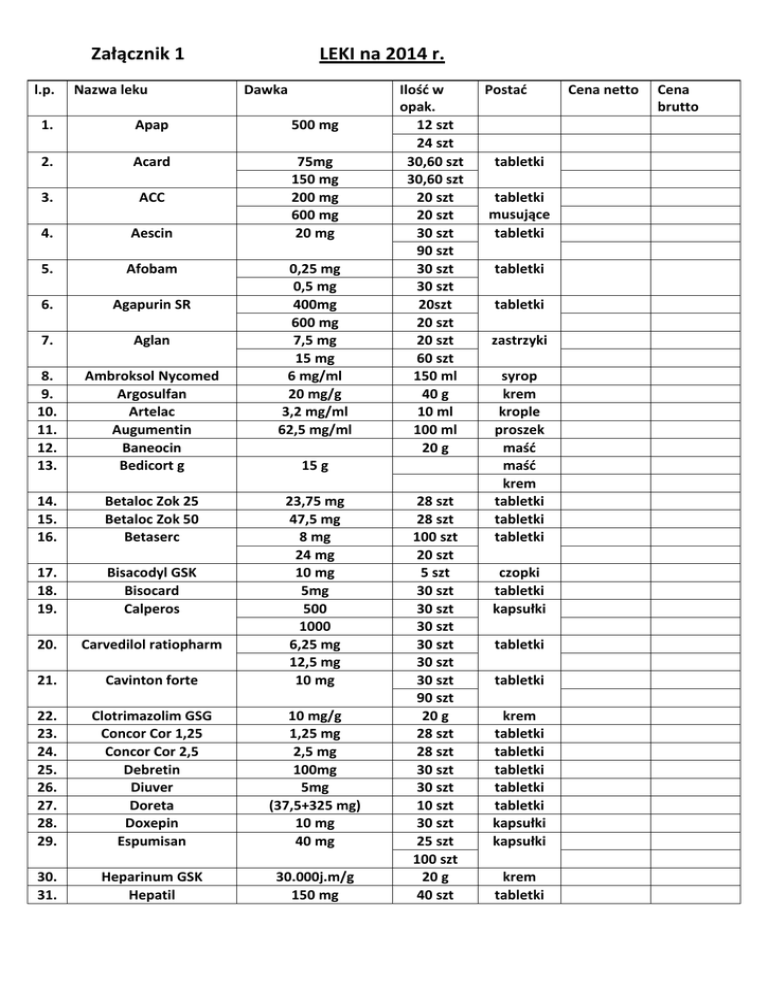 Załącznik 1 l.p. Nazwa leku LEKI na 2014 r. Dawka 1. Apap 500 mg 2. Acard 3. ACC 4. Aescin 75mg 150 mg 200 mg 600 mg 20 mg 5. Afobam 6. Agapurin SR 7. Aglan 8. 9. 10. 11. 12. 13. Ambroksol Nycomed Argosulfan Artelac Augumentin Baneocin Bedicort g 14. 15. 16. Betaloc Zok 25 Betaloc Zok 50 Betaserc 17. 18. 19. Bisacodyl GSK Bisocard Calperos 20. Carvedilol ratiopharm 21. Cavinton forte 23,75 mg 47,5 mg 8 mg 24 mg 10 mg 5mg 500 1000 6,25 mg 12,5 mg 10 mg 22. 23. 24. 25. 26. 27. 28. 29. Clotrimazolim GSG Concor Cor 1,25 Concor Cor 2,5 Debretin Diuver Doreta Doxepin Espumisan 10 mg/g 1,25 mg 2,5 mg 100mg 5mg (37,5+325 mg) 10 mg 40 mg 30. 31. Heparinum GSK Hepatil 30.000j.m/g 150 mg 0,25 mg 0,5 mg 400mg 600 mg 7,5 mg 15 mg 6 mg/ml 20 mg/g 3,2 mg/ml 62,5 mg/ml Ilość w opak. 12 szt 24 szt 30,60 szt 30,60 szt 20 szt 20 szt 30 szt 90 szt 30 szt 30 szt 20szt 20 szt 20 szt 60 szt 150 ml 40 g 10 ml 100 ml 20 g 15 g 28 szt 28 szt 100 szt 20 szt 5 szt 30 szt 30 szt 30 szt 30 szt 30 szt 30 szt 90 szt 20 g 28 szt 28 szt 30 szt 30 szt 10 szt 30 szt 25 szt 100 szt 20 g 40 szt Postać tabletki tabletki musujące tabletki tabletki tabletki zastrzyki syrop krem krople proszek maść maść krem tabletki tabletki tabletki czopki tabletki kapsułki tabletki tabletki krem tabletki tabletki tabletki tabletki tabletki kapsułki kapsułki krem tabletki Cena netto Cena brutto 32. 33. 34. 35. 36. 37. Ketonal Lacidofil Lactulosum Hasco Lorinden A Lorinden C Lucetam 38. Memotropil 39. 40. Metodopramidum pofarma Mosidomina 41. 42. 43. 44. 25mg/g 800 mg 1200 mg 800 mg 1200 mg 10 mg 100 g 20 szt 150 ml 15g 15 g 60 szt 60 szt 60 szt 60 szt 50 szt żel kapsułki syrop maść maść tabletki 30 szt 30 szt 20 szt 50 g 20x 5 ml 3g tabletki Movalis Naproxen Hasco Natrium chloratum Neomycinum Jelfa 2 mg 4 mg 7,5 mg 12 mg/g 0,9 mg/ml 5 mg/g 45. 46. 47. 48. Nimesil granulat No-spa No-spa forte Oekolp 100 mg 40 mg 80mg 1mg/g 49. 50. 51. 52. Panadol Paracetamol Polfilin prolongatum Polocard 53. 54. Poltram Combo Promazin 55. 56. 57. 58. 59. Pyralgin Quinax Solcoseryl Sortis Thyrozol 60. Triderm 500 mg 500 mg 400 mg 75mg 150 mg 37,5/325mg 25mg 50 mg 500 mg 0,15mg/ml 2,07 mg/g 40mg 5 mg 10 mg 15 g 9 szt 20 szt 20 szt 25g +aplikator 12 szt 60 szt 20 szt 30, 60 szt 30, 60 szt 30 szt 60 szt 60 szt 6 szt 15ml 20 g 30 szt 50 szt 50 szt 61. 62. 63. 64. 65. Tussicom 200 Venoruton 300 Vessel Due F Vicebrol Vicebrol forte 200 mg/5 g 30 mg 66. 67. 68. Vinpoton Vit. B compositium Węgiel leczniczy 5mg 500 mg/ml 5mg 10 mg 200 mg 20 szt 50 szt 50 szt 100 szt 30 szt 90 szt 50 szt 50 szt 20 szt tabletki tabletki tabletki żel ampułki maść do oczu saszetki tabletki tabletki krem tabletki tabletki tabletki tabletki tabletki drażetki tabletki krople maść tabletki tabletki maść krem saszetki kapsułki kapsułki tabletki tabletki tabletki drażetki kapsułki 69. Xanax 70. 71. Xenna Extra Zaldiar 0,25 mg 0,5 mg 17 mg 37,5/325mg 30 szt 30 szt 10 szt 10 szt 20 szt tabletki tabletki tabletki