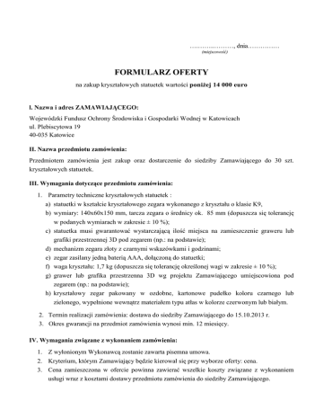 ….……..………, dnia…………… (miejscowość) FORMULARZ OFERTY na zakup kryształowych statuetek wartości poniŜej 14 000 euro l. Nazwa i adres ZAMAWIAJĄCEGO: Wojewódzki Fundusz Ochrony Środowiska i Gospodarki Wodnej w Katowicach ul. Plebiscytowa 19 40-035 Katowice II. Nazwa przedmiotu zamówienia: Przedmiotem zamówienia jest zakup oraz dostarczenie do siedziby Zamawiającego do 30 szt. kryształowych statuetek. III. Wymagania dotyczące przedmiotu zamówienia: 1. Parametry techniczne kryształowych statuetek : a) statuetki w kształcie kryształowego zegara wykonanego z kryształu o klasie K9, b) wymiary: 140x60x150 mm, tarcza zegara o średnicy ok. 85 mm (dopuszcza się tolerancję w podanych wymiarach w zakresie ± 10 %); c) statuetka musi gwarantować wystarczającą ilość miejsca na zamieszczenie graweru lub grafiki przestrzennej 3D pod zegarem (np.: na podstawie); d) mechanizm zegara złoty z czarnymi wskazówkami i godzinami; e) zegar zasilany jedną baterią AAA, dołączoną do statuetki; f) waga kryształu: 1,7 kg (dopuszcza się tolerancję określonej wagi w zakresie ± 10 %); g) grawer lub grafika przestrzenna 3D wg projektu Zamawiającego umiejscowiona pod zegarem (np.: na podstawie); h) kryształowy zegar pakowany w ozdobne, kartonowe pudełko koloru czarnego lub zielonego, wypełnione wewnątrz materiałem typu atłas w kolorze czerwonym lub białym. 2. Termin realizacji zamówienia: dostawa do siedziby Zamawiającego do 15.10.2013 r. 3. Okres gwarancji na przedmiot zamówienia wynosi min. 12 miesięcy. IV. Wymagania związane z wykonaniem zamówienia: 1. Z wyłonionym Wykonawcą zostanie zawarta pisemna umowa. 2. Kryterium, którym Zamawiający będzie kierował się przy wyborze oferty: cena. 3. Cena zamieszczona w ofercie powinna zawierać wszelkie koszty związane z wykonaniem usługi wraz z kosztami dostawy przedmiotu zamówienia do siedziby Zamawiającego. 4. Zapłata za wykonanie usługi nastąpi jednorazowo w formie przelewu na rachunek bankowy Wykonawcy wskazany w fakturze, w terminie do 14 dni od daty jej dostarczenia Zamawiającemu, po potwierdzeniu wykonania zamówienia w formie obustronnie podpisanego protokołu. 5. Ze strony Zamawiającego osobą upowaŜnioną do podpisania protokołu i odbioru przedmiotu zamówienia jest Kierownik Zespołu Administracyjno-Organizacyjnego lub osoba przez niego upowaŜniona. 6. Wykonawca nie moŜe powierzyć wykonania niniejszej umowy osobie trzeciej bez uzyskania pisemnej zgody Zamawiającego. 7. Zamawiający zastrzega sobie moŜliwość Ŝądania od Wykonawcy w trakcie postępowania wyjaśnień w zakresie złoŜonej oferty oraz złoŜonych oświadczeń/dokumentów oraz Ŝądania uzupełnień brakujących oświadczeń/dokumentów. 8. Zamawiający zamknie postępowanie bez dokonania wyboru, gdy w toku postępowania wpłynie jedna oferta. 9. Wykonawca moŜe złoŜyć tylko jedną ofertę. 10. Zamawiający nie dopuszcza moŜliwości składania oferty wariantowej. 11. W przypadku, gdy w trakcie trwania postępowania wpłyną oferty o tej samej wartości (cenie) Zamawiający zastrzega sobie moŜliwość wezwania Wykonawców, którzy złoŜyli te oferty, do złoŜenia ofert dodatkowych. 12. Zamawiający zastrzega sobie zmniejszenie podanej ilości do 20 sztuk. Dokładna liczba statuetek podana zostanie w dniu podpisania umowy. 13. Projekt graweru lub grafiki przestrzennej 3D zostanie przekazany Wykonawcy najpóźniej w dniu podpisania umowy. V. Ofertę naleŜy: 1. ZłoŜyć w formie pisemnej w terminie do dnia 12.09.2013 r. (osobiście, pisemnie - listem, faksem lub e-mailem na adres: [email protected]) na kompletnym Formularzu Oferty (str. 1-3); 2. Wraz z ofertą naleŜy złoŜyć: - odpis z właściwego rejestru lub centralnej ewidencji i informacji o działalności gospodarczej, - pełnomocnictwo do złoŜenia oferty/zawarcia umowy, o ile w imieniu Wykonawcy działa pełnomocnik, - zdjęcie wraz z opisem oferowanej statuetki. VI. Tryb postępowania: ZAPYTANIE OFERTOWE Postępowanie prowadzone jest na podstawie „Regulaminu Udzielania Zamówień Publicznych w Wojewódzkim Funduszu Ochrony Środowiska i Gospodarki Wodnej w Katowicach”, w związku z art. 4 pkt. 8 ustawy z dnia 29 stycznia 2004 r. Prawo zamówień publicznych (Dz. U. z 2010 r. nr 113 poz. 759 z póź.zm.), na podstawie którego ustawy nie stosuje się do zamówień konkursów, których wartość nie przekracza wyraŜonej w złotych równowartości kwoty 14 000 euro. VII. Nazwa i adres WYKONAWCY NIP ................................................. ………………………………… (pieczęć Wykonawcy) 1. Oferuję wykonanie przedmiotu zamówienia za: Cena za 1 szt. netto: ……………… ; brutto: ……………………… Cena za 30 szt. netto: ………………… ; brutto: ……………………… słownie brutto: ……………………………………………………………………… . 2. Deklaruję ponadto: a) termin realizacji zamówienia………………(nie później niŜ 15.10.2013 r.); b) termin waŜności oferty ………… dni (nie mniej niŜ 30 dni), c) ………………………………………………………………………………………. . 3. Oświadczam, Ŝe: - po zapoznaniu się z opisem przedmiotu zamówienia nie wnosimy do niego zastrzeŜeń, - w razie wybrania naszej oferty zobowiązujemy się do realizacji zamówienia oraz zawarcia umowy na warunkach określonych w formularzu oferty i wzorze umowy. 4. Wraz z ofertą składam*: a) odpis z właściwego rejestru lub centralnej ewidencji i informacji tak nie x x o działalności gospodarczej, b) pełnomocnictwo do złoŜenia oferty/zawarcia umowy, x tak x nie c) zdjęcie wraz z opisem oferowanej statuetki, d) ……………………………………………………………………………………………….. …………………….dnia ……………….roku ................................................................. 