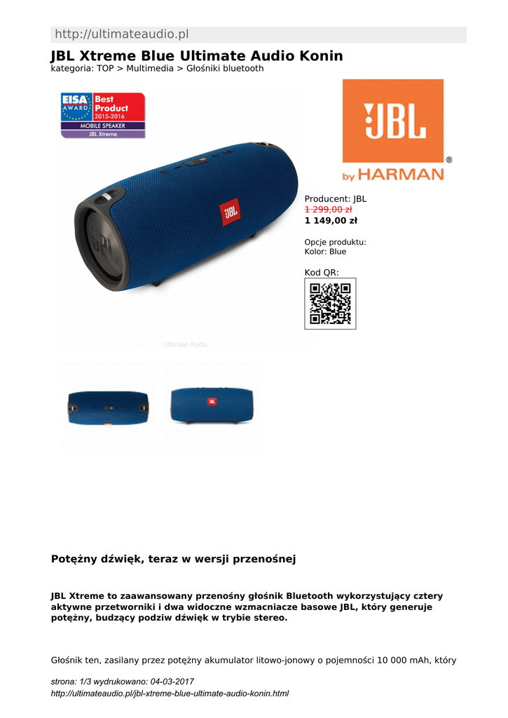 http://ultimateaudio.pl JBL Xtreme Blue Ultimate Audio Konin kategoria: TOP > Multimedia > Głośniki bluetooth Producent: JBL 1 299,00 zł 1 149,00 zł Opcje produktu: Kolor: Blue Kod QR: Potężny dźwięk, teraz w wersji przenośnej JBL Xtreme to zaawansowany przenośny głośnik Bluetooth wykorzystujący cztery aktywne przetworniki i dwa widoczne wzmacniacze basowe JBL, który generuje potężny, budzący podziw dźwięk w trybie stereo. Głośnik ten, zasilany przez potężny akumulator litowo-jonowy o pojemności 10 000 mAh, który strona: 1/3 wydrukowano: 04-03-2017 http://ultimateaudio.pl/jbl-xtreme-blue-ultimate-audio-konin.html zapewnia 15 godzin odsłuchu oraz dwa wyjścia USB do ładowania innych urządzeń, pozwoli Ci cieszyć się muzyką tak długo, jak tego chcesz. Możesz mieć pewność, że głośnik BL Xtreme dostarczy Ci wielu wrażeń, bez względu na okoliczności – w pomieszczeniu, na zewnątrz, na spotkaniu przy basenie czy podczas grilla – jego odporna na zachlapanie konstrukcja jest dostępna w kolorach czarnym, niebieskim i czerwonym. Model Xtreme wykorzystuje również wbudowany głośnik z funkcją tłumienia zakłóceń i echa, dzięki czemu idealnie się sprawdza podczas połączeń konferencyjnych, a także technologię bezprzewodowego łączenia wielu głośników JBL Connect, która pozwala zwiększyć wrażenia z odsłuchu. Odporność na zachlapanie Odporność na zachlapanie oznacza spokój, gdy pada deszcz lub gdy zostanie niechcący oblany. Akumulator Akumulator można łatwo naładować, co pozwala uniknąć problemów i zaoszczędzić pieniądze. Bluetooth® Connectivity Technologia Bluetooth pozwala na strumieniowanie muzyki w wysokiej jakości za pomocą przenośnych urządzeń audio. Ten produktów współpracuje z telefonami komórkowymi, tabletami i laptopami. JBL Connect Build your own ecosystem by connecting multiple JBL Connect enabled speakers together to amplify the listening experience. Zawartość zestawu: 1 1 1 1 1 1 x x x x x x głośnik JBL XTREME zasilacz sieciowy pasek przewodnik szybkiego startu arkusz informacji o produkcie karta gwarancyjna Dynamiczne pasmo przenoszenia 70 – 20 kHz Stosunek sygnału do szumu >80 dB Rodzaj akumulatora Lithium-ion Polymer (7.4V, 5000mAh) Masa 2112 g strona: 2/3 wydrukowano: 04-03-2017 http://ultimateaudio.pl/jbl-xtreme-blue-ultimate-audio-konin.html Zasilacz 19V 3A Czas odtwarzania muzyki up to 15 hours (varies by volume level and audio content) strona: 3/3 wydrukowano: 04-03-2017 http://ultimateaudio.pl/jbl-xtreme-blue-ultimate-audio-konin.html