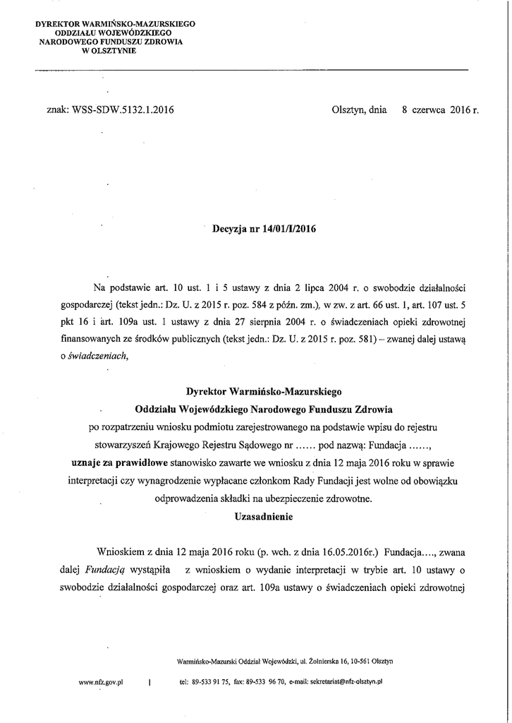 DYREKTOR WARMIŃSKO-MAZURSKIEGO ODDZIAŁU WOJEWÓDZKIEGO NARODOWEGO FUNDUSZU ZDROWIA W OLSZTYNIE Olsztyn, dnia znale: WSS-SDW.5132.1.2016 8 czerwca 2016 Decyzja nr 14/01/1/2016 Na podstawie art. 10 ust. 1 i 5 ustawy z dnia 2 lipca 2004 r. o swobodzie działalności gospodarczej (tekst jedn.: Dz. U. z 2015 r. poz. 584 z późn, zm,), w zw. z art. 66 ust. 1, art. 107 ust. 5 pkt 16 i art. 109a ust. 1 ustawy z dnia 27 sierpnia 2004 r. o świadczeniach opieki zdrowotnej finansowanych ze środków publicznych (tekst jedn.: Dz. U. z 2015 r. poz. 581) - zwanej dalej ustawą o świadczeniach, Dyrektor Warmińsko-Mazurskiego Oddziału Wojewódzkiego Narodowego Funduszu Zdrowia po rozpatrzeniu wniosku podmiotu zarejestrowanego na podstawie wpisu do rejestru stowarzyszeń Krajowego Rejestru Sądowego n r ....... pod nazwą: F undacja........., uznaje za prawidłowe stanowisko zawarte we wniosku z dnia 12 maja 2016 roku w sprawie interpretacji czy wynagrodzenie wypłacane członkom Rady Fundacji jest wolne od obowiązku odprowadzenia składki na ubezpieczenie zdrowotne. Uzasadnienie Wnioskiem z dnia 12 maja 2016 roku (p. wch. z dnia 16.05.2016r.) Fundacja...., zwana dalej Fundacją wystąpiła z wnioskiem o wydanie interpretacji w trybie art. 10 ustawy o swobodzie działalności gospodarczej oraz art. 109a ustawy o świadczeniach opieki zdrowotnej Warmińsko-Mazurski Oddział Wojewódzki, ul, Żołnierska 16,10-561 Olsztyn www.nfz.gov,pi tel: 89-533 91 75, fax: 89-533 96 70, e-mail: sekretariat® nfz-olsztyn.pl finansowanych ze środków publicznych o interpretację, czy wynagrodzenie wypłacane członkom Rady Fundacji wolne jest od obowiązku odprowadzenia składki na ubezpieczenie zdrowotne. Jednocześnie pismem z dnia 31 maja 2016r. Podlaski Oddział Wojewódzki Narodowego Funduszu Zdrowia w Białymstoku, przekazał zgodnie z właściwością miejscową taki sam wniosek Fundacji, skierowany do Podlaskiego OW NFZ przez Zakład Ubezpieczeń Społecznych w Gdańsku. Z uwagi na identyczną treść, oba wnioski zostaną rozstrzygnięte w niniejszym postępowaniu. Jak wynika z treści wniosku Fundacja działa godnie z ustawą z dnia 6 kwietnia 1984r. 0 fundacjach (Dz.U. z 2016r., poz. 40) i statutu Fundacji. Art. 5 pkt 1 w/w ustawy mówi, że statut fundacji może przewidywać tworzenie obok zarządu innych organów fundacji. Statut Fundacji w §21 mówi, że: Organami Fundacji są: Rada Fundacji zwana dalej Radą, Zarząd Fundacji zwany dalej Zarządem. Zarząd Fundacji jest zatrudniony na podstawie umowy o pracę, natomiast członkowie Rady Fundacji otrzymują miesięczne wynagrodzenie, które zostało ustalone na podstawie powołania do pełnienia funkcji członka Rady i nie jest uregulowane żadną umową pomiędzy Fundacją a członkiem Rady Fundacji. Fundacja od 1 stycznia 2005r. na podstawie ustawy z dnia 27 sierpnia 2004r. o świadczeniach opieki zdrowotnej finansowanych ze środków publicznych, art. 83 ust. 3 pkt.6 od wypłaconych wynagrodzeń dla członków Rady naliczała 1 potrącała składki na ubezpieczenie zdrowotne. Z dniem 1 stycznia 2016r. Fundacja zaprzestała naliczanie składek na ubezpieczenie zdrowotne od wypłaconych wynagrodzeń dla członków Rady Fundacji. W związku z powyższym Fundacja uważa, iż wynagrodzenie wypłacone członkom Rady jest wolne od obowiązku odprowadzenia składki na ubezpieczenie zdrowotne ponieważ nie są to wynagrodzenia wypłacane na podstawie umowy o pracę lub umowy cywilnoprawnej. Zasady podlegania ubezpieczeniu zdrowotnemu uregulowane zostały w ustawie z dnia 27 sierpnia 2004r. 0 świadczeniach opieki zdrowotnej finansowanych ze środków publicznych. W świetle art. 66 ust. 1 ww. ustawy obowiązkowi ubezpieczenia zdrowotnego podlegają osoby spełniające warunki do objęcia ubezpieczeniami społecznymi. Oznacza to, że jeżeli dana osoba spełnia warunki do objęcie ubezpieczeniami społecznymi z któregokolwiek wskazanego w art. 6 ust. 1 ustawy o świadczeniach opieki zdrowotnej tytułu podlega również ubezpieczeniu zdrowotnemu. A zatem podleganie obowiązkowemu ubezpieczeniu zdrowotnemu ma charakter wtórny wobec podlegania ubezpieczeniu społecznemu. W katalogu tytułów wymienionych w art. 66 ust. 1 ustawy o świadczeniach opieki zdrowotnej brak jest samodzielnego tytułu do objęcie ubezpieczeniem zdrowotnym jakim jest pełnienie funkcji członków Rady powołanych uchwałą. Obowiązkowemu ubezpieczeniu zdrowotnemu podlegają natomiast między innymi osoby spełniające warunki do objęcia ubezpieczeniami społecznymi, które są pracownikami w rozumieniu ustawy o systemie ubezpieczeń społecznych (art. 66 ust. 1 pkt.l lit. a ustawy o świadczeniach opieki zdrowotnej finansowanych ze środków publicznych). Obowiązek opłacania składek na ubezpieczenie zdrowotne reguluje ww. ustawa uzależniając zaistnienie tegoż obowiązku nie od finansowego wymiaru pełnionej funkcji a od formy w jakiej zostali powołani członkowie Rady. Fundacja uważa, że fakt osiągania wynagrodzenia nie rodzi, obowiązku opłacania składek, jeżeli nie wynika to z zawartej umowy o pracę lub umowy cywilnoprawnej. W ocenie Dyrektora Warmińsko-Mazurskiego Oddziału Wojewódzkiego Narodowego Funduszu Zdrowia w Olsztynie, stanowisko Fundacji co do zasady jest prawidłowe z poniższych przyczyn. Zgodnie z art. 66 ust. 1 pkt 35 ustawy o świadczeniach - obowiązkowemu ubezpieczeniu zdrowotnemu podlegają członkowie rad nadzorczych posiadający miejsce zamieszkania na terytorium Rzeczypospolitej Polskiej. Obowiązkowemu ubezpieczeniu zdrowotnemu podlegają zatem członkowie wszystkich rad nadzorczych. Ustawodawca nie ogranicza bowiem tego obowiązku jedynie do określonej kategorii rad nadzorczych np. tylko do rad nadzorczych w spółkach kapitałowych. Dlatego obowiązkowemu ubezpieczeniu zdrowotnemu podlegają członkowie rad nadzorczych spółek akcyjnych i spółek z ograniczoną odpowiedzialnością, jak i spółdzielni oraz innych podmiotów, w który