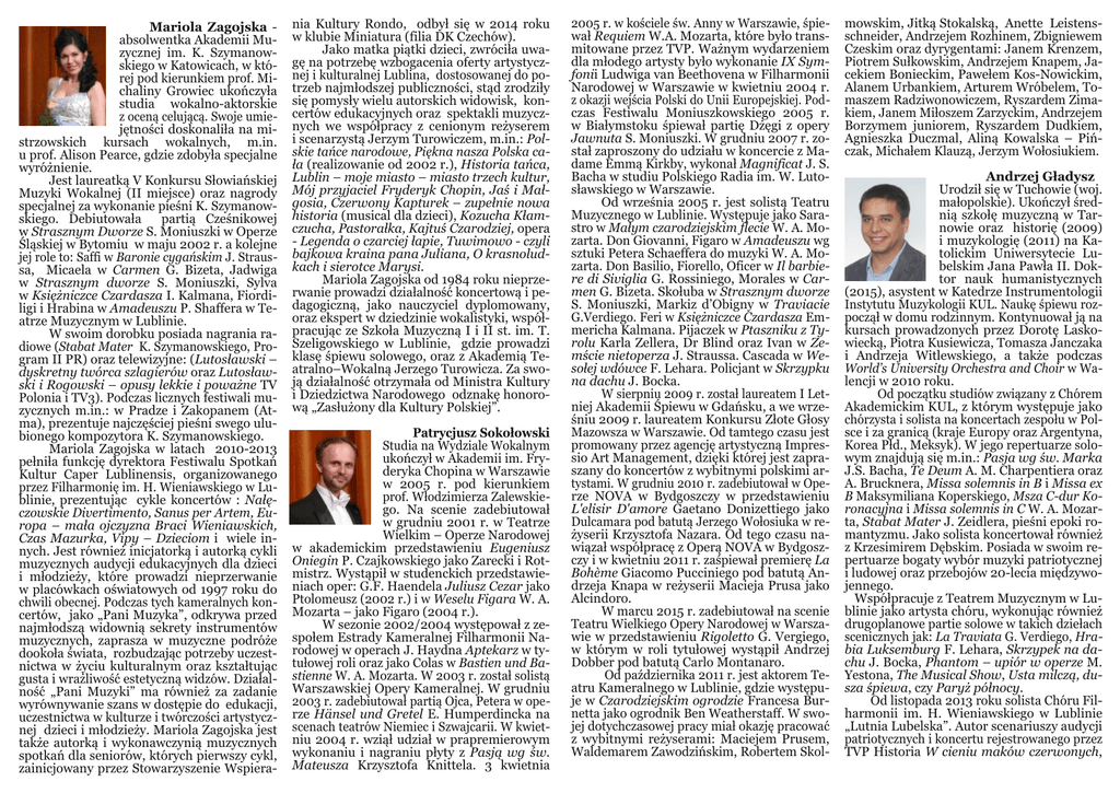 Mariola Zagojska absolwentka Akademii Mu zycznej im. K. Szymanow skiego w Katowicach, w któ rej pod kierunkiem prof. Mi chaliny Growiec ukończyła studia wokalnoaktorskie z oceną celującą. Swoje umie jętności doskonaliła na mi strzowskich kursach wokalnych, m.in. u prof. Alison Pearce, gdzie zdobyła specjalne wyróżnienie. Jest laureatką V Konkursu Słowiańskiej Muzyki Wokalnej (II miejsce) oraz nagrody specjalnej za wykonanie pieśni K. Szymanow skiego. Debiutowała partią Cześnikowej w Strasznym Dworze S. Moniuszki w Operze Śląskiej w Bytomiu w maju 2002 r. a kolejne jej role to: Saffi w Baronie cygańskim J. Straus sa, Micaela w Carmen G. Bizeta, Jadwiga w Strasznym dworze S. Moniuszki, Sylva w Księżniczce Czardasza I. Kalmana, Fiordi ligi i Hrabina w Amadeuszu P. Shaffera w Te atrze Muzycznym w Lublinie. W swoim dorobku posiada nagrania ra diowe (Stabat Mater K. Szymanowskiego, Pro gram II PR) oraz telewizyjne: (Lutosławski – dyskretny twórca szlagierów oraz Lutosław ski i Rogowski – opusy lekkie i poważne TV Polonia i TV3). Podczas licznych festiwali mu zycznych m.in.: w Pradze i Zakopanem (At ma), prezentuje najczęściej pieśni swego ulu bionego kompozytora K. Szymanowskiego. Mariola Zagojska w latach 20102013 pełniła funkcję dyrektora Festiwalu Spotkań Kultur Caper Lublinensis, organizowanego przez Filharmonię im. H. Wieniawskiego w Lu blinie, prezentując cykle koncertów : Nałę czowskie Divertimento, Sanus per Artem, Eu ropa – mała ojczyzna Braci Wieniawskich, Czas Mazurka, Vipy – Dzieciom i wiele in nych. Jest również inicjatorką i autorką cykli muzycznych audycji edukacyjnych dla dzieci i młodzieży, które prowadzi nieprzerwanie w placówkach oświatowych od 1997 roku do chwili obecnej. Podczas tych kameralnych kon certów, jako „Pani Muzyka”, odkrywa przed najmłodszą widownią sekrety instrumentów muzycznych, zaprasza w muzyczne podróże dookoła świata, rozbudzając potrzeby uczest nictwa w życiu kulturalnym oraz kształtując gusta i wrażliwość estetyczną widzów. Działal ność „Pani Muzyki” ma również za zadanie wyrównywanie szans w dostępie do edukacji, uczestnictwa w kulturze i twórczości artystycz nej dzieci i młodzieży. Mariola Zagojska jest także autorką i wykonawczynią muzycznych spotkań dla seniorów, których pierwszy cykl, zainicjowany przez Stowarzyszenie Wspiera nia Kultury Rondo, odbył się w 2014 roku w klubie Miniatura (filia DK Czechów). Jako matka piątki dzieci, zwróciła uwa gę na potrzebę wzbogacenia oferty artystycz nej i kulturalnej Lublina, dostosowanej do po trzeb najmłodszej publiczności, stąd zrodziły się pomysły wielu autorskich widowisk, kon certów edukacyjnych oraz spektakli muzycz nych we współpracy z cenionym reżyserem i scenarzystą Jerzym Turowiczem, m.in.: Pol skie tańce narodowe, Piękna nasza Polska ca ła (realizowanie od 2002 r.), Historia tańca, Lublin – moje miasto – miasto trzech kultur, Mój przyjaciel Fryderyk Chopin, Jaś i Mał gosia, Czerwony Kapturek – zupełnie nowa historia (musical dla dzieci), Kozucha Kłam czucha, Pastorałka, Kajtuś Czarodziej, opera Legenda o czarciej łapie, Tuwimowo czyli bajkowa kraina pana Juliana, O krasnolud kach i sierotce Marysi. Mariola Zagojska od 1984 roku nieprze rwanie prowadzi działalność koncertową i pe dagogiczną, jako nauczyciel dyplomowany, oraz ekspert w dziedzinie wokalistyki, współ pracując ze Szkoła Muzyczną I i II st. im. T. Szeligowskiego w Lublinie, gdzie prowadzi klasę śpiewu solowego, oraz z Akademią Te atralno–Wokalną Jerzego Turowicza. Za swo ją działalność otrzymała od Ministra Kultury i Dziedzictwa Narodowego odznakę honoro wą „Zasłużony dla Kultury Polskiej”. Patrycjusz Sokołowski Studia na Wydziale Wokalnym ukończył w Akademii im. Fry deryka Chopina w Warszawie w 2005 r. pod kierunkiem prof. Włodzimierza Zalewskie go. Na scenie zadebiutował w grudniu 2001 r. w Teatrze Wielkim – Operze Narodowej w akademickim przedstawieniu Eugeniusz Oniegin P. Czajkowskiego jako Zarecki i Rot mistrz. Wystąpił w studenckich przedstawie niach oper: G.F. Haendela Juliusz Cezar jako Ptolomeusz (2002 r.) i w Weselu Figara W. A. Mozarta – jako Figaro (2004 r.). W sezonie 2002/2004 występował z ze społem Estrady Kameralnej Filharmonii Na rodowej w operach J. Haydna Aptekarz w ty tułowej roli oraz jako Colas w Bastien und Ba stienne W. A. Mozarta. W 2003 r. został solistą Warszawskiej Opery Kameralnej. W grudniu 2003 r. zadebiutował partią Ojca, Petera w ope rze Hänsel und Gretel E. Humperdincka na scenach teatrów Niemiec i Szwajcarii. W kwiet niu 2004 r. wziął udział w prapremierowym wykonaniu i nagraniu płyty z Pasją wg św. Mateusza Krzysztofa Knittela. 3 kwietnia 2005 r. w kościele św. Anny w Warszawie, śpie wał Requiem W.A. Mozarta, które było trans mitowane przez TVP. Ważnym wydarzeniem dla młodego artysty było wykonanie IX Sym fonii Ludwiga van Beethovena w Filharmonii Narodowej w Warszawie w kwietniu 2004 r. z okazji wejścia Polski do Unii Europejskiej. Pod czas Festiwalu Moniuszkowskiego 2005 r. w Białymstoku śpiewał partię Dżęgi z opery Jawnuta S. Moniuszki. W grudniu 2007 r. zo stał zaproszony do udziału w koncercie z Ma dame Emmą Kirkby, wykonał Magnificat J. S. Bacha w studiu Polskiego Radia im. W. Luto sławskiego w Warszawie. Od września 2005 r. jest solistą Teatru Muzycznego w Lublinie. Występuje jako Sara stro w Małym czarodziejskim flecie W. A. Mo zarta. Don Giovanni, Figaro w Amadeuszu wg sztuki Petera Schaeffera do muzyki W. A. Mo zarta. Don Basilio, Fiorello, Oficer w Il barbie re di Siviglia G. Rossiniego, Morales w Car men G. Bizeta. Skołuba w Strasznym dworze S. Moniuszki, Markiz d’Obigny w Traviacie G.Verdiego. Feri w Księżniczce Czardasza Em mericha Kalmana. Pijaczek w Ptaszniku z Ty rolu Karla Zellera, Dr Blind oraz Ivan w Ze mście nietoperza J. Straussa. Cascada w We sołej wdówce F.