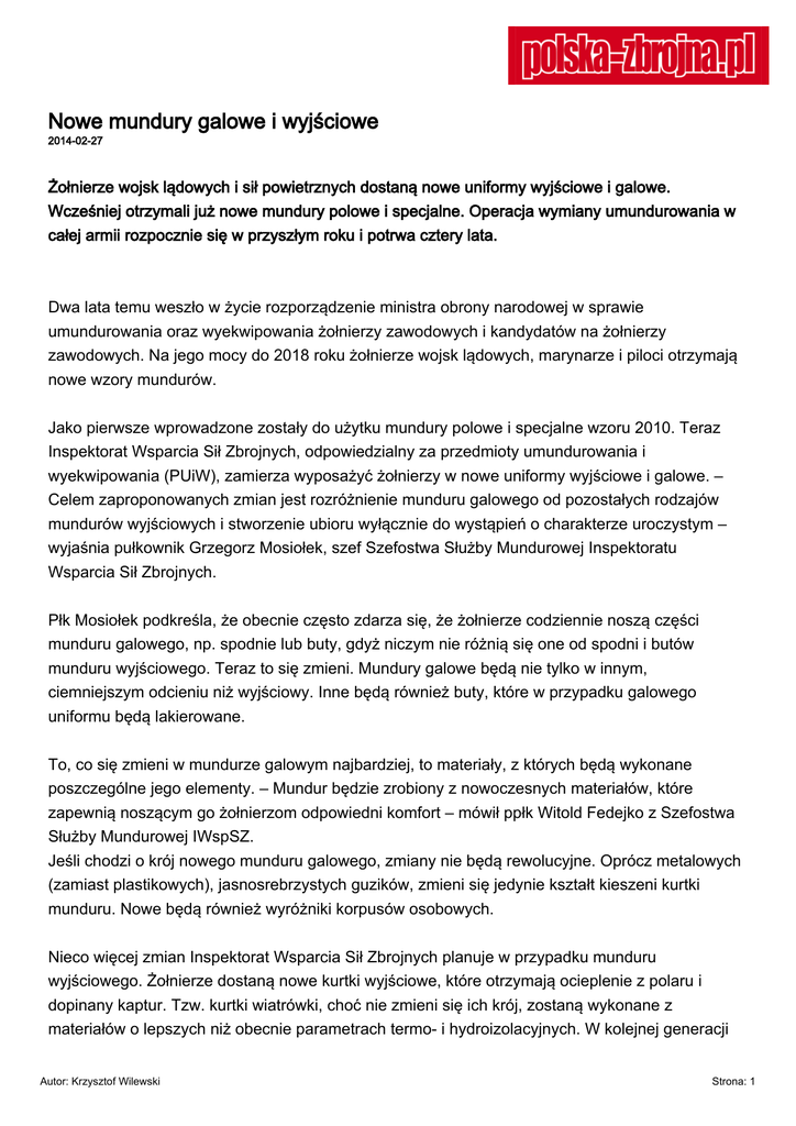 Nowe mundury galowe i wyjściowe 2014-02-27 Żołnierze wojsk lądowych i sił powietrznych dostaną nowe uniformy wyjściowe i galowe. Wcześniej otrzymali już nowe mundury polowe i specjalne. Operacja wymiany umundurowania w całej armii rozpocznie się w przyszłym roku i potrwa cztery lata. Dwa lata temu weszło w życie rozporządzenie ministra obrony narodowej w sprawie umundurowania oraz wyekwipowania żołnierzy zawodowych i kandydatów na żołnierzy zawodowych. Na jego mocy do 2018 roku żołnierze wojsk lądowych, marynarze i piloci otrzymają nowe wzory mundurów. Jako pierwsze wprowadzone zostały do użytku mundury polowe i specjalne wzoru 2010. Teraz Inspektorat Wsparcia Sił Zbrojnych, odpowiedzialny za przedmioty umundurowania i wyekwipowania (PUiW), zamierza wyposażyć żołnierzy w nowe uniformy wyjściowe i galowe. – Celem zaproponowanych zmian jest rozróżnienie munduru galowego od pozostałych rodzajów mundurów wyjściowych i stworzenie ubioru wyłącznie do wystąpień o charakterze uroczystym – wyjaśnia pułkownik Grzegorz Mosiołek, szef Szefostwa Służby Mundurowej Inspektoratu Wsparcia Sił Zbrojnych. Płk Mosiołek podkreśla, że obecnie często zdarza się, że żołnierze codziennie noszą części munduru galowego, np. spodnie lub buty, gdyż niczym nie różnią się one od spodni i butów munduru wyjściowego. Teraz to się zmieni. Mundury galowe będą nie tylko w innym, ciemniejszym odcieniu niż wyjściowy. Inne będą również buty, które w przypadku galowego uniformu będą lakierowane. To, co się zmieni w mundurze galowym najbardziej, to materiały, z których będą wykonane poszczególne jego elementy. – Mundur będzie zrobiony z nowoczesnych materiałów, które zapewnią noszącym go żołnierzom odpowiedni komfort – mówił ppłk Witold Fedejko z Szefostwa Służby Mundurowej IWspSZ. Jeśli chodzi o krój nowego munduru galowego, zmiany nie będą rewolucyjne. Oprócz metalowych (zamiast plastikowych), jasnosrebrzystych guzików, zmieni się jedynie kształt kieszeni kurtki munduru. Nowe będą również wyróżniki korpusów osobowych. Nieco więcej zmian Inspektorat Wsparcia Sił Zbrojnych planuje w przypadku munduru wyjściowego. Żołnierze dostaną nowe kurtki wyjściowe, które otrzymają ocieplenie z polaru i dopinany kaptur. Tzw. kurtki wiatrówki, choć nie zmieni się ich krój, zostaną wykonane z materiałów o lepszych niż obecnie parametrach termo- i hydroizolacyjnych. W kolejnej generacji Autor: Krzysztof Wilewski Strona: 1 mundurów wyjściowych pojawią się również zupełnie nowe przedmioty zaopatrzenia mundurowego. Nowością będą spodnie wyjściowe sztabowe i spodnie letnie sztabowe, które mają być wykonane z materiałów o wysokiej odporności na zagniecenia. Pojawi się również płaszcz całoroczny, który ma zastąpić płaszcz letni i płaszcz sukienny. Zgodnie z opracowaną przez Inspektorat Wsparcia „Koncepcją zmian umundurowania i wyekwipowania żołnierzy Sił Zbrojnych RP w latach 2014–2015” nowe mundury galowe i wyjściowe trafią do żołnierzy wojsk lądowych i sił powietrznych już w przyszłym roku. Operacja wymiany umundurowania będzie trwała cztery lata. Prototypy nowych mundurów zostały zaprezentowane 26 lutego podczas rocznej odprawy rozliczeniowo-koordynacyjnej dowódcy generalnego Rodzajów Sił Zbrojnych. Dzień wcześniej pokazano je w Sztabie Generalnym WP. Na obu prezentacjach uniformy zebrały bardzo pozytywne opinie. *** Obecny ubiór galowy: • Mundur galowy oficerski (generalski/admirała) wzór 92. • Mundur letni oficerski (generalski/admirała) wzór 92. • Koszula z długimi rękawami w kolorze białym (lub koszulo-bluza oficerska z długimi lub krótkimi rękawami w kolorze białym). • Sznur galowy. • Czapka rogatywka, czapka garnizonowa, furażerka, beret. • Krawat. • Półbuty galowe koloru czarnego. • Spinki do mankietów. • Rękawiczki. Obecny ubiór wyjściowy: • Mundur wyjściowy oficerski wzór 92. • Mundur letni oficerski wzór 92. • Płaszcz sukienny oficerski. • Płaszcz letni oficerski. • Bluza olimpijka oficerska. • Koszula z długimi rękawami w kolorze khaki, stalowym, białym (lub koszulo-bluza oficerska z długimi lub krótkimi rękawami w kolorze khaki, stalowym, białym). • Sweter oficerski. • Szalik letni i zimowy. • Kurtka wyjściowa. • Kurtka wiatrówka. Autor: Krzysztof Wilewski Strona: 2 • Czapka futrzana, czapka rogatywka, czapka garnizonowa, furażerka, beret. • Półbuty koloru czarnego, trzewiki zimowe oficerskie-botki. • Rękawiczki. Zmiany w mundurze wyjściowym: 1) nowy model kurtki wyjściowej 2) nowy model kurtki wiatrówki 3) nowy model półbutów koloru czarnego 4) płaszcz całoroczny – nowe rozwiązanie, obecnie nieznajdujące się w wyposażeniu żołnierzy, zastępujące płaszcz letni i płaszcz sukienny. 5) koszulo-bluzy wyjściowe – wykonane z nowych materiałów. 6) spodnie wyjściowe sztabowe i spodnie letnie sztabowe – nowe rozwiązanie, obecnie nieznajdujące się w wyposażeniu żołnierzy. 7) bluza olimpijka oficerska – wykonane z nowych materiałów. 8) szalik letni i zimowy – wykonane z nowych materiałów. Elementy umundurowania i wyekwipowania (PUiW) żołnierzy wprowadzone do użytku w 2012 roku: • Mundur polowy letni wzór 2010. • Mundur polowy wzór 2010. • Mundur ćwiczebny letni marynarki wojennej wzór 2010. • Mundur ćwiczebny marynarki wojennej wzór 2010. • Mundur polowy tropikalny w kamuflażu pustynnym wzór 2010. • Koszulo-bluza pod kamizelkę ochronną. • Koszulo-bluza pod kamizelkę ochronną w kamuflażu pustynnym. • Trzewiki pilota letnie wzór 2010. • Trzewiki pilota zimowe wzór 2010. • Trzewiki ćwiczebne tropikalne wzór 2010. • Kombinezon pilota wzór 2010. • Kombinezon pilota letni wzór 2010. • Kombinezon czołgisty wzór 2010. • Kurtka zimowa czołgisty wzór 2010. • Ocieplacz pod kombinezon (pilot