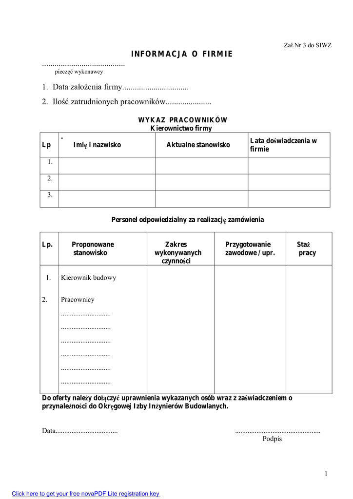 Zał.Nr 3 do SIWZ INFORMACJA O FIRMIE ........................................ pieczęć wykonawcy 1. Data założenia firmy................................ 2. Ilość zatrudnionych pracowników...................... WYKAZ PRACOWNIKÓW Kierownictwo firmy . Lp Imię i nazwisko Aktualne stanowisko Lata doświadczenia w firmie 1. 2. 3. Personel odpowiedzialny za realizację zamówienia Lp. 1. 2. Proponowane stanowisko Zakres wykonywanych czynności Przygotowanie zawodowe / upr. Staż pracy Kierownik budowy Pracownicy ............................ ............................ ............................ ............................ ............................ ............................ Do oferty należy dołączyć uprawnienia wykazanych osób wraz z zaświadczeniem o przynależności do Okręgowej Izby Inżynierów Budowlanych. Data................................... ................................................ Podpis 1 Click here to get your free novaPDF Lite registration key