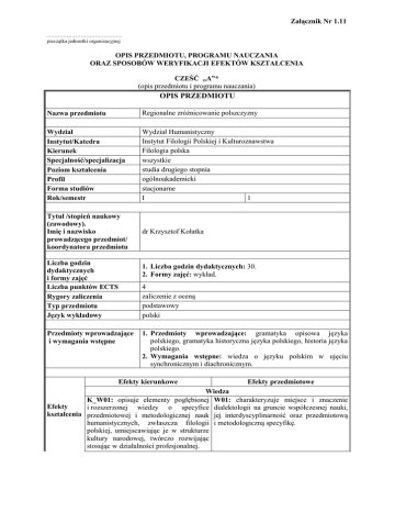 Załącznik Nr 1.11 …………………………………… pieczątka jednostki organizacyjnej OPIS PRZEDMIOTU, PROGRAMU NAUCZANIA ORAZ SPOSOBÓW WERYFIKACJI EFEKTÓW KSZTAŁCENIA CZEŚĆ „A”* (opis przedmiotu i programu nauczania) OPIS PRZEDMIOTU Nazwa przedmiotu Regionalne zróżnicowanie polszczyzny Wydział Instytut/Katedra Kierunek Specjalność/specjalizacja Poziom kształcenia Profil Forma studiów Rok/semestr Wydział Humanistyczny Instytut Filologii Polskiej i Kulturoznawstwa Filologia polska wszystkie studia drugiego stopnia ogólnoakademicki stacjonarne I 1 Tytuł /stopień naukowy (zawodowy). Imię i nazwisko prowadzącego przedmiot/ koordynatora przedmiotu dr Krzysztof Kołatka Liczba godzin dydaktycznych i formy zajęć Liczba punktów ECTS Rygory zaliczenia Typ przedmiotu Język wykładowy Przedmioty wprowadzające i wymagania wstępne 1. Liczba godzin dydaktycznych: 30. 2. Formy zajęć: wykład. 4 zaliczenie z oceną podstawowy polski 1. Przedmioty wprowadzające: gramatyka opisowa języka polskiego, gramatyka historyczna języka polskiego, historia języka polskiego. 2. Wymagania wstępne: wiedza o języku polskim w ujęciu synchronicznym i diachronicznym. Efekty kierunkowe Efekty przedmiotowe Wiedza K_W01: opisuje elementy pogłębionej W01: charakteryzuje miejsce i znaczenie Efekty i rozszerzonej wiedzy o specyfice dialektologii na gruncie współczesnej nauki, kształcenia przedmiotowej i metodologicznej nauk jej interdyscyplinarność oraz przedmiotową humanistycznych, zwłaszcza filologii i metodologiczną specyfikę. polskiej, umiejscawiając je w strukturze kultury narodowej, twórczo rozwijając stosując w działalności profesjonalnej. W02: zna terminologię dialektologiczną; prezentuje dzieje i dorobek polskiej dialektologii oraz kierunki metodologiczne; definiuje i opisuje polskie cechy dialektalne; charakteryzuje podział dialektów polskich oraz jego kryteria; przedstawia i porównuje dialekty i gwary ludowe języka polskiego, kaszubszczyznę oraz ich historię; opisuje zróżnicowanie gwarowe Pomorza i Kujaw; definiuje oraz charakteryzuje gwary przejściowe i mieszane, a także porównuje oba typy gwar; przedstawia gwary polskie za granicą; charakteryzuje współczesny język mieszkańców wsi, jego heterogeniczność i determinanty; opisuje świadomość językową mieszkańców wsi, a także stan, sytuację i przyszłość polszczyzny ludowej oraz określa jej pozycję społeczną i wartość kulturową; charakteryzuje związki pomiędzy polszczyzną ludową a kulturą ludową; przedstawia rolę i funkcje polszczyzny ludowej w literaturze; definiuje i charakteryzuje zjawisko stylizacji gwarowej oraz podaje jego przykłady; opisuje język polskiego folkloru. Umiejętności K_U01: wyszukuje, analizuje, ocenia, U01: wyszukuje, analizuje, ocenia, interpretuje, selekcjonuje i użytkuje interpretuje, selekcjonuje i wykorzystuje informacje z zakresu kultury, literatury informacje z zakresu dialektologii, w oparciu i języka, pochodzące z różnych źródeł o źródła pisane i elektroniczne, oraz formułuje na tej podstawie w szczególności podręczniki, monografie, krytyczne sądy. atlasy, słowniki oraz teksty gwarowe; rozpoznaje (na podstawie nagrania lub zapisu fonetycznego) dialekty języka polskiego, kaszubszczyznę oraz gwary ludowe Pomorza i Kujaw; analizując tekst gwarowy, rozpoznaje i nazywa cechy systemowe. K_U02: posługuje się uszczegółowioną U02: stosuje terminologię z zakresu terminologią, dobiera i stosuje dialektologii, określając poszczególne odpowiednie metody, narzędzia zjawiska gwarowe i przedstawiając badawcze oraz opracowuje i prezentuje całościową charakterystykę danego wyniki pozwalające na rozwiązywanie dialektu/gwary; samodzielnie zdobywa złożonych problemów w zakresie wiedzę i rozwija umiejętności badawcze, językoznawstwa, literaturoznawstwa, stosując podstawowe metody, techniki kultury, edytorstwa. i narzędzia badawcze w celu zgromadzenia materiału gwarowego oraz dokonując jego analizy. Kompetencje społeczne K_K06: zdaje sobie sprawę K01: szanuje mieszkańców wsi, ich mowę z konieczności integracji wiedzy i kulturę ludową; dostrzega potrzebę dbałości o kulturze, języku i literaturze o zachowanie i zarejestrowanie w budowaniu tożsamości narodowej oraz zróżnicowania dialektalnego Polski; docenia rozwijaniu więzi społecznych na rolę dialektów ludowych jako podstawy poziomie lokalnym, krajowym języka narodowego; ma świadomość i globalnym. znaczenia polszczyzny ludowej i kultury ludowej – jako części europejskiego i narodowego dziedzictwa kulturowego – w procesie budowania tożsamości regionalnej oraz kształtowania więzi K_W03: rozpoznaje i charakteryzuje różnorodne elementy wiedzy, obejmujące teorie i metodologie z zakresu filologii polskiej. społecznych. ..................................................... data ......................................................................................................................................... podpis prowadzącego/koordynatora przedmiotu Objaśnienia: * Część „A” sylabusa (Opis przedmiotu i programu nauczania) ma postać jednorodną i jako wzór obowiązuje w całej uczelni. 1. Opis przedmiotu jest opracowany i podpisywany przez prowadzącego przedmiot w przypadku, gdy dany przedmiot jest prowadzony wyłącznie przez jedną osobę. 2. Opis przedmiotu jest opracowany i podpisywany przez koordynatora przedmiotu w przypadku, gdy dany przedmiot jest prowadzony przez więcej niż jedną osobę, np. ze względu na różne formy realizacji przedmiotu (wykład + ćwiczenia); przygotowanie przez koordynatora opisu przedmiotu wymaga współpracy z pozostałymi osobami prowadzącymi przedmiot. PROGRAM NAUCZANIA PRZEDMIOTU Rok akademicki: 2016/2017 Semestr: zimowy Nazwa przedmiotu Wydział Instytut/Katedra Kierunek Specjalność/specjalizacja Opisywana forma zajęć Liczba godzin dydaktycznych Tytuł /stopie