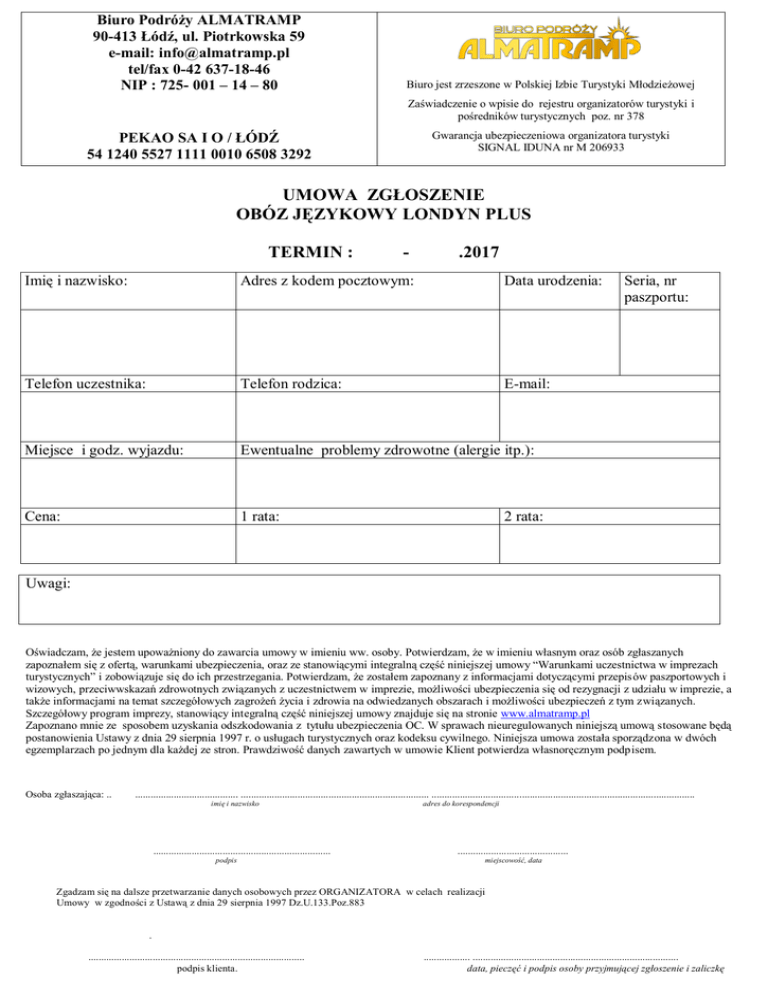 Biuro Podróży ALMATRAMP 90-413 Łódź, ul. Piotrkowska 59 e-mail: [email protected] tel/fax 0-42 637-18-46 NIP : 725- 001 – 14 – 80 Biuro jest zrzeszone w Polskiej Izbie Turystyki Młodzieżowej Zaświadczenie o wpisie do rejestru organizatorów turystyki i pośredników turystycznych poz. nr 378 PEKAO SA I O / ŁÓDŹ 54 1240 5527 1111 0010 6508 3292 Gwarancja ubezpieczeniowa organizatora turystyki SIGNAL IDUNA nr M 206933 UMOWA ZGŁOSZENIE OBÓZ JĘZYKOWY LONDYN PLUS TERMIN : - .2017 Imię i nazwisko: Adres z kodem pocztowym: Data urodzenia: Telefon uczestnika: Telefon rodzica: E-mail: Miejsce i godz. wyjazdu: Ewentualne problemy zdrowotne (alergie itp.): Cena: 1 rata: Seria, nr paszportu: 2 rata: Uwagi: Oświadczam, że jestem upoważniony do zawarcia umowy w imieniu ww. osoby. Potwierdzam, że w imieniu własnym oraz osób zgłaszanych zapoznałem się z ofertą, warunkami ubezpieczenia, oraz ze stanowiącymi integralną część niniejszej umowy “Warunkami uczestnictwa w imprezach turystycznych” i zobowiązuje się do ich przestrzegania. Potwierdzam, że zostałem zapoznany z informacjami dotyczącymi przepisów paszportowych i wizowych, przeciwwskazań zdrowotnych związanych z uczestnictwem w imprezie, możliwości ubezpieczenia się od rezygnacji z udziału w imprezie, a także informacjami na temat szczegółowych zagrożeń życia i zdrowia na odwiedzanych obszarach i możliwości ubezpieczeń z tym związanych. Szczegółowy program imprezy, stanowiący integralną część niniejszej umowy znajduje się na stronie www.almatramp.pl Zapoznano mnie ze sposobem uzyskania odszkodowania z tytułu ubezpieczenia OC. W sprawach nieuregulowanych niniejszą umową stosowane będą postanowienia Ustawy z dnia 29 sierpnia 1997 r. o usługach turystycznych oraz kodeksu cywilnego. Niniejsza umowa została sporządzona w dwóch egzemplarzach po jednym dla każdej ze stron. Prawdziwość danych zawartych w umowie Klient potwierdza własnoręcznym podpisem. Osoba zgłaszająca: .. ........................................ ......................................................................... ...................................................................................................... imię i nazwisko ..................................................................... podpis adres do korespondencji ........................................... miejscowość, data Zgadzam się na dalsze przetwarzanie danych osobowych przez ORGANIZATORA w celach realizacji Umowy w zgodności z Ustawą z dnia 29 sierpnia 1997 Dz.U.133.Poz.883 . .................................................................................... podpis klienta. .................. ................................................................................ data, pieczęć i podpis osoby przyjmującej zgłoszenie i zaliczkę WARUNKI UCZESTNICTWA W IMPREZACH TURYSTYCZNYCH ORGANIZOWANYCH PRZEZ ALMATRAMP I. ZAWARCIE UMOWY 1. Przed zawarciem umowy Uczestnik zobowiązany jest do zapoznania się z ofertą Almatrampu, niniejszymi warunkami uczestnictwa oraz Ogólnymi Warunkami Ubezpieczenia obowiązującymi na danej imprezie 2. Zawarcie umowy następuje z chwilą podpisania druku umowy przez osobę zgłaszającą udział w imprezie i przez przedstawiciela Biura sprzedającego imprezę oraz wpłacenia zaliczki w wysokości 30% ogólnej należności 3. Wpłaty pozostałej należności należy dokonać najpóźniej w terminie 30 dni przed rozpoczęciem imprezy. . 4. ALMATRAMP zastrzega sobie prawo zmiany ceny imprezy zgodnie z art.17 ust 1 ustawy o usługach turystycznych Podniesienie ceny imprezy możliwe jest najpóźniej na 21 dni przed terminem rozpoczęcia imprezy. Ceny walutowe przeliczane są po kursie BANK PEKAO SA tabela kursowa sprzedaż w dniu ostatecznej wpłaty 5. ALMATRAMP zastrzega sobie prawo odwołania imprezy z przyczyn od siebie niezależnych wynikających z działania siły wyższej lub w przypadku braku wymaganego minimum uczestników (70 %). Odwołanie imprezy z powodu zbyt małej liczby uczestników nie może nastąpić w terminie krótszym niż 21 dni od planowanej daty jej rozpoczęcia. W przypadku odwołania imprezy Uczestnikowi przysługuje prawo zwrotu całości wniesionych opłat II. REZYGNACJA Z IMPREZY 1. Rezygnacja z imprezy może nastąpić wyłącznie w formie pisemnej. 2. Uczestnik może odstąpić od umowy w każdym czasie przed rozpoczęciem imprezy składając na piśmie rezygnację z uczestnictwa w imprezie. W przypadku rezygnacji lub nie uczestniczenia Uczestnika w wykupionej imprezie Almatramp uprawniony jest do potrącenia rzeczywiście poniesionych kosztów. 3. Uczestnik może przenieść na osobę spełniającą warunki udziału w imprezie wszystkie przysługujące mu uprawnienia z tytułu umowy jeżeli osoba ta jednocześnie przejmie wszystkie obowiązki wynikające z tej umowy oraz pokryje koszty związane z tą zmianą . Przeniesienie uprawnień i przejęcie obowiązków jest skuteczne wobec ALMATRAMPU jeżeli uczestnik zawiadomi ALMATRAMP w terminie co najmniej 7 dni przed datą rozpoczęcia imprezy 4. Uczestnik imprezy może ubezpieczyć się od kosztów rezygnacji i przerwania podróży podczas imprezy turystycznej III. REALIZACJA UMOWY, REKLAMACJE 1. Uczestnik zobowiązany jest do posiadania aktualnie obowiązujących dokumentów upoważniających go do przekroczenia granic. 2. Uczestnik jest zobowiązany do przestrzegania regulaminów i innych przepisów obowiązujących w kraju pobytu, obiektach noclegowych, gastronomicznych, jak również zaleceń pilota (np. co do miejsca zbiórki). 3. ALMATRAMP nie ponosi odpowiedzialności za przeszkody w wykonaniu usługi turystycznej, których przyczyny tkwią w sile wyższej i wyłącznym działaniu lub zaniechaniu uczestnika. ALMATRAMP nie ponosi odpowiedzialności za szkody spowodowane działaniem osób trzecich wskazanych w art.11 a ust.1 pkt 2 Ustawy o usługach turystycznych. 4. ALMATRAMP ogranicza odpowiedzialność za 