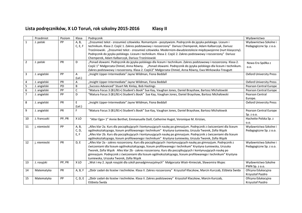 Lista podręczników, X LO Toruń, rok szkolny 2015