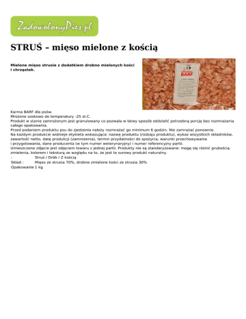 STRUŚ – mięso mielone z kością Mielone mięso strusie z dodatkiem drobno mielonych kości i chrząstek. Karma BARF dla psów. Mrożone szokowo do temperatury -25 st.C. Produkt w stanie zamrożonym jest granulowany co pozwala w łatwy sposób oddzielić potrzebną porcję bez rozmrażania całego opakowania. Przed podaniem produktu psu do zjedzenia należy rozmrażać go minimum 6 godzin. Nie zamrażać ponownie. Na każdym produkcie widnieje etykieta wskazująca: nazwę produktu (rodzaju produktu), wykaz wszystkich składników, zawartość netto, datę produkcji (zamrożenia), termin przydatności do spożycia, warunki przechowywania i przygotowania, dane producenta (w tym numer weterynaryjny) i numer referencyjny partii. Umieszczone zdjęcie jest zdjęciem towaru z jednej partii. Produkty nie są standaryzowane: mogę się różnić grubością zmielenia, kolorem i teksturą ze względu na to, że jest to surowy produkt naturalny. : Struś / Drób / Z kością Skład : Mięso ze strusia 70%, drobne zmielone kości ze strusia 30% Opakowanie 1 kg