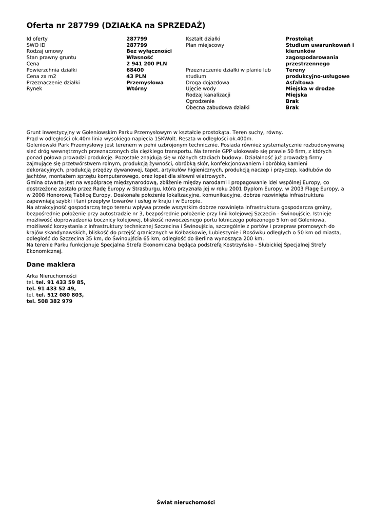 Oferta nr 287799 (DZIAŁKA na SPRZEDAŻ) Id oferty SWO ID Rodzaj umowy Stan prawny gruntu Cena Powierzchnia działki Cena za m2 Przeznaczenie działki Rynek 287799 287799 Bez wyłączności Własność 2 941 200 PLN 68400 43 PLN Przemysłowa Wtórny Kształt działki Plan miejscowy Przeznaczenie działki w planie lub studium Droga dojazdowa Ujęcie wody Rodzaj kanalizacji Ogrodzenie Obecna zabudowa działki Prostokąt Studium uwarunkowań i kierunków zagospodarowania przestrzennego Tereny produkcyjno-usługowe Asfaltowa Miejska w drodze Miejska Brak Brak Grunt inwestycyjny w Goleniowskim Parku Przemysłowym w kształcie prostokąta. Teren suchy, równy. Prąd w odległości ok.40m linia wysokiego napięcia 15KWolt. Reszta w odległości ok.400m. Goleniowski Park Przemysłowy jest terenem w pełni uzbrojonym technicznie. Posiada również systematycznie rozbudowywaną sieć dróg wewnętrznych przeznaczonych dla ciężkiego transportu. Na terenie GPP ulokowało się prawie 50 firm, z których ponad połowa prowadzi produkcję. Pozostałe znajdują się w różnych stadiach budowy. Działalność już prowadzą firmy zajmujące się przetwórstwem rolnym, produkcją żywności, obróbką skór, konfekcjonowaniem i obróbką kamieni dekoracyjnych, produkcją przędzy dywanowej, tapet, artykułów higienicznych, produkcją naczep i przyczep, kadłubów do jachtów, montażem sprzętu komputerowego, oraz łopat dla siłowni wiatrowych. Gmina otwarta jest na współpracę międzynarodową, zbliżenie między narodami i propagowanie idei wspólnej Europy, co dostrzeżone zostało przez Radę Europy w Strasburgu, która przyznała jej w roku 2001 Dyplom Europy, w 2003 Flagę Europy, a w 2008 Honorową Tablicę Europy. Doskonałe położenie lokalizacyjne, komunikacyjne, dobrze rozwinięta infrastruktura zapewniają szybki i tani przepływ towarów i usług w kraju i w Europie. Na atrakcyjność gospodarczą tego terenu wpływa przede wszystkim dobrze rozwinięta infrastruktura gospodarcza gminy, bezpośrednie położenie przy autostradzie nr 3, bezpośrednie położenie przy linii kolejowej Szczecin - Świnoujście. Istnieje możliwość doprowadzenia bocznicy kolejowej, bliskość nowoczesnego portu lotniczego położonego 5 km od Goleniowa, możliwość korzystania z infrastruktury technicznej Szczecina i Świnoujścia, szczególnie z portów i przepraw promowych do krajów skandynawskich, bliskość do przejść granicznych w Kołbaskowie, Lubieszynie i Rosówku odległych o 50 km od miasta, odległość do Szczecina 35 km, do Świnoujścia 65 km, odległość do Berlina wynosząca 200 km. Na terenie Parku funkcjonuje Specjalna Strefa Ekonomiczna będąca podstrefą Kostrzyńsko - Słubickiej Specjalnej Strefy Ekonomicznej. Dane maklera Arka Nieruchomości tel. tel. 91 433 59 85, tel. 91 433 52 49, tel. tel. 512 080 803, tel. 508 382 979 Świat nieruchomości Powered by TCPDF (www.tcpdf.org)