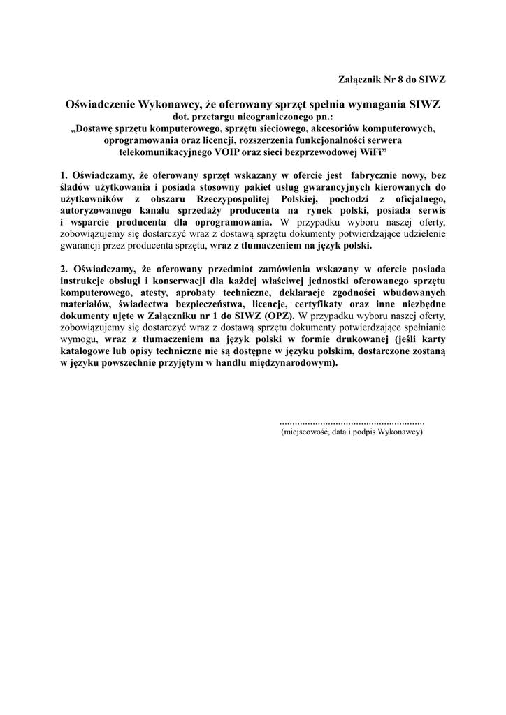 Załącznik Nr 8 do SIWZ Oświadczenie Wykonawcy, że oferowany sprzęt spełnia wymagania SIWZ dot. przetargu nieograniczonego pn.: „Dostawę sprzętu komputerowego, sprzętu sieciowego, akcesoriów komputerowych, oprogramowania oraz licencji, rozszerzenia funkcjonalności serwera telekomunikacyjnego VOIP oraz sieci bezprzewodowej WiFi” 1. Oświadczamy, że oferowany sprzęt wskazany w ofercie jest fabrycznie nowy, bez śladów użytkowania i posiada stosowny pakiet usług gwarancyjnych kierowanych do użytkowników z obszaru Rzeczypospolitej Polskiej, pochodzi z oficjalnego, autoryzowanego kanału sprzedaży producenta na rynek polski, posiada serwis i wsparcie producenta dla oprogramowania. W przypadku wyboru naszej oferty, zobowiązujemy się dostarczyć wraz z dostawą sprzętu dokumenty potwierdzające udzielenie gwarancji przez producenta sprzętu, wraz z tłumaczeniem na język polski. 2. Oświadczamy, że oferowany przedmiot zamówienia wskazany w ofercie posiada instrukcje obsługi i konserwacji dla każdej właściwej jednostki oferowanego sprzętu komputerowego, atesty, aprobaty techniczne, deklaracje zgodności wbudowanych materiałów, świadectwa bezpieczeństwa, licencje, certyfikaty oraz inne niezbędne dokumenty ujęte w Załączniku nr 1 do SIWZ (OPZ). W przypadku wyboru naszej oferty, zobowiązujemy się dostarczyć wraz z dostawą sprzętu dokumenty potwierdzające spełnianie wymogu, wraz z tłumaczeniem na język polski w formie drukowanej (jeśli karty katalogowe lub opisy techniczne nie są dostępne w języku polskim, dostarczone zostaną w języku powszechnie przyjętym w handlu międzynarodowym). ......................................................... (miejscowość, data i podpis Wykonawcy)